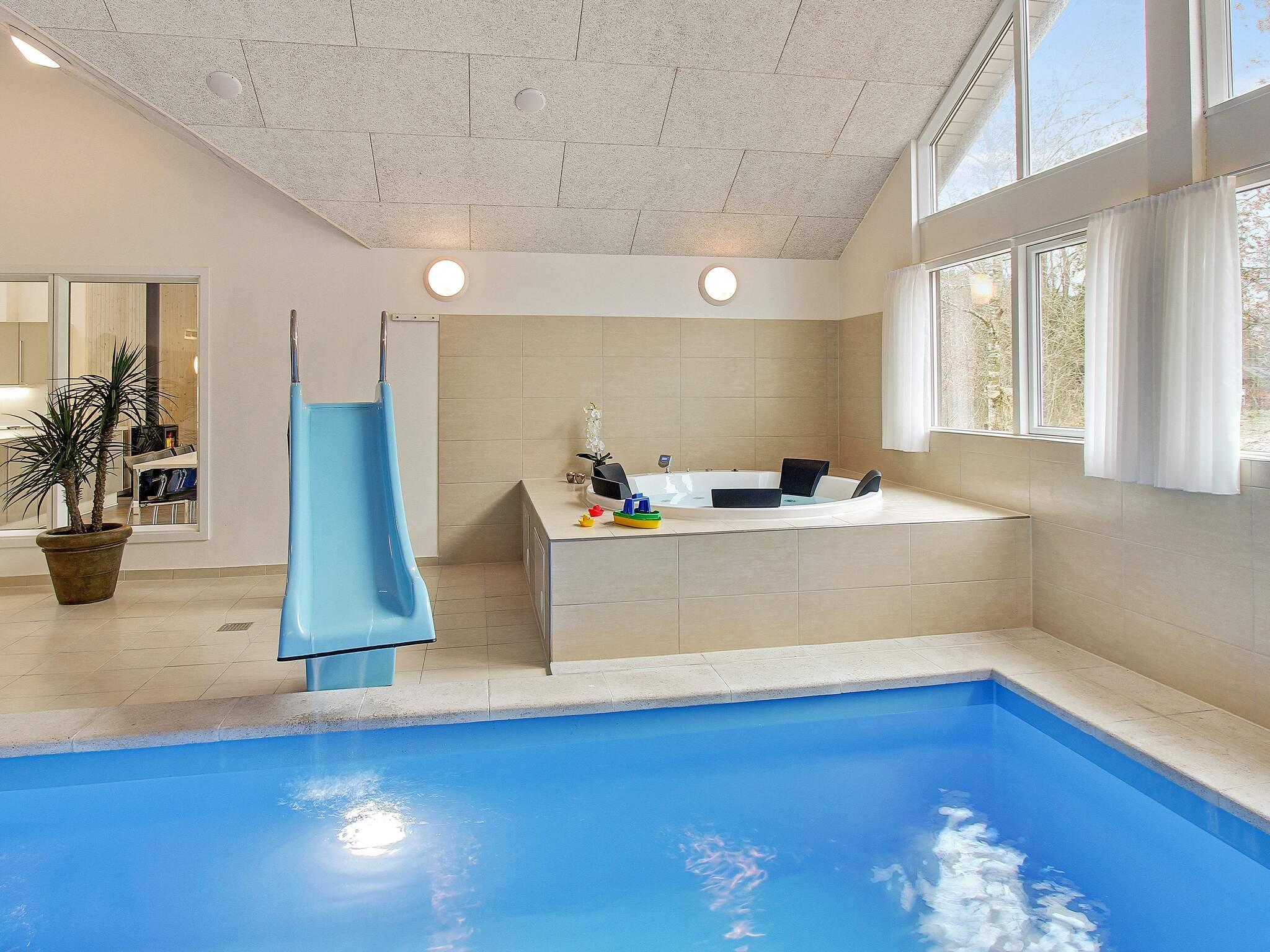 Velindrettet sommerhus i Henne der rummer alt, hvad hjertet kan begære af aktivitets- og udfoldelsesmuligheder. Den store poolafdeling indeholder en stor swimmingpool med vandrutschebane og svømmetræner, sauna, bruseniche og spabad med god plads. Efter en god og oplevelsesrig dag er det skønt at lade sig glide ned i husets store spabad eller lade sig varme igennem i husets sauna. På den anden side af det centralt placerede spise-/opholdsrum kommer I ind i aktivitetsrummet, hvor I kan tage et spil dart eller billard ved poolbordet. Her kan I også udfordre hinanden i bordtennis eller fodboldspil. Selv stereoanlæg, PlayStation og fladskærm er installeret i aktivitetsrummet.