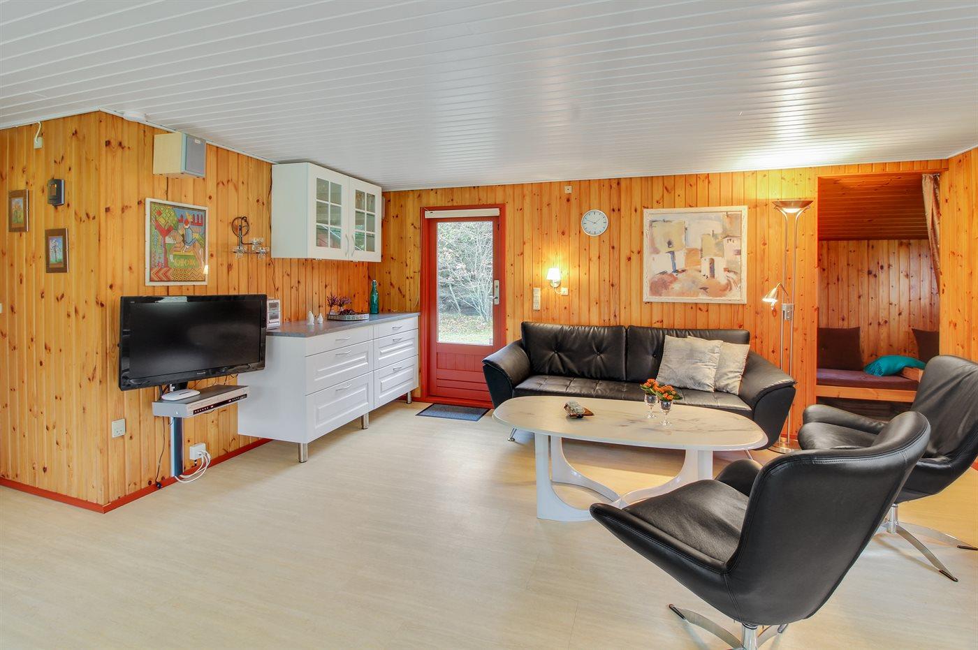 Et hyggeligt sommerhus beliggende på en stor og lukket grund. Det ene soveværelse er 1 lille soverum med 2 enkeltsenge (afskærmet med forhæng).