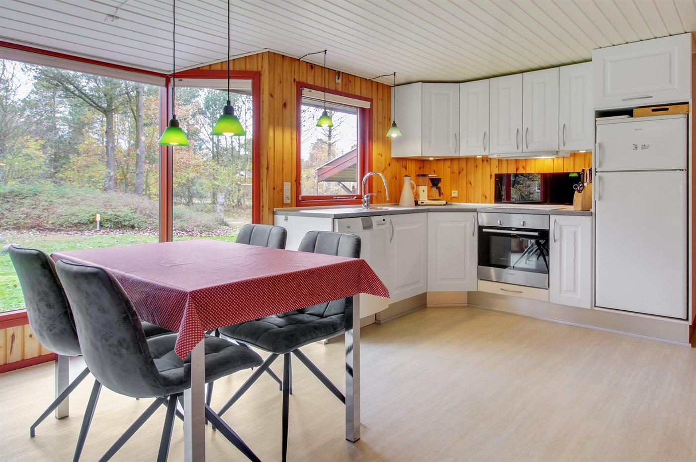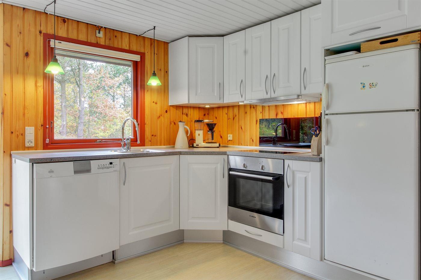 Køkkenet er udstyret med 1 køleskab. Der er 4 elkogeplader, varmluftovn, mikrobølgeovn samt opvaskemaskine.