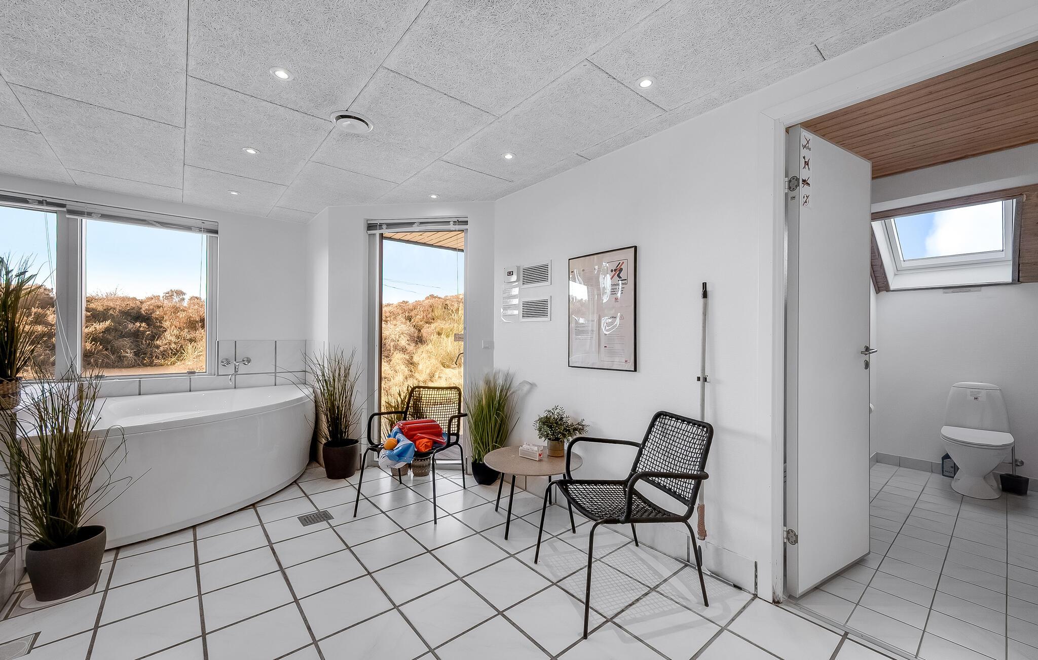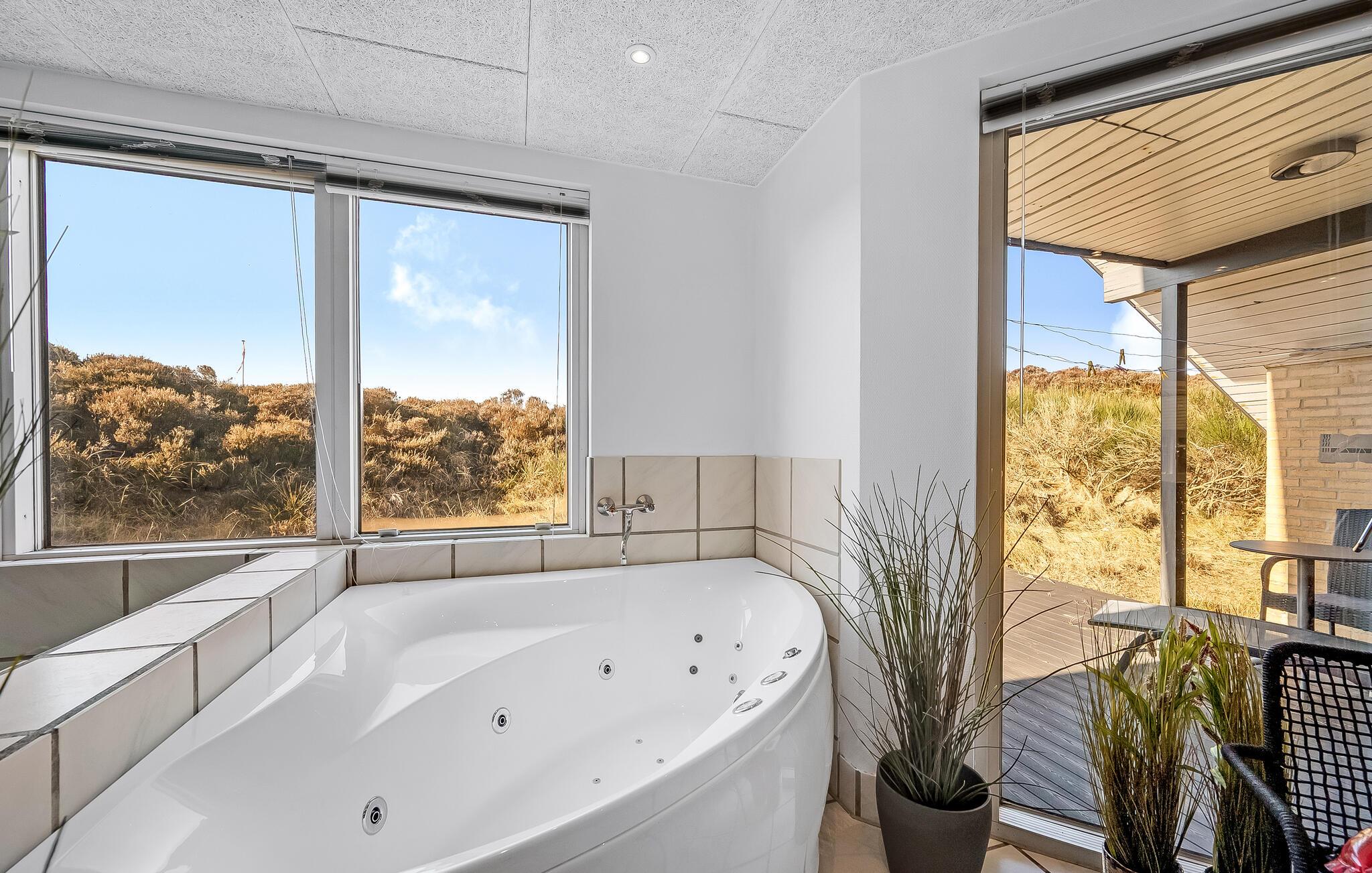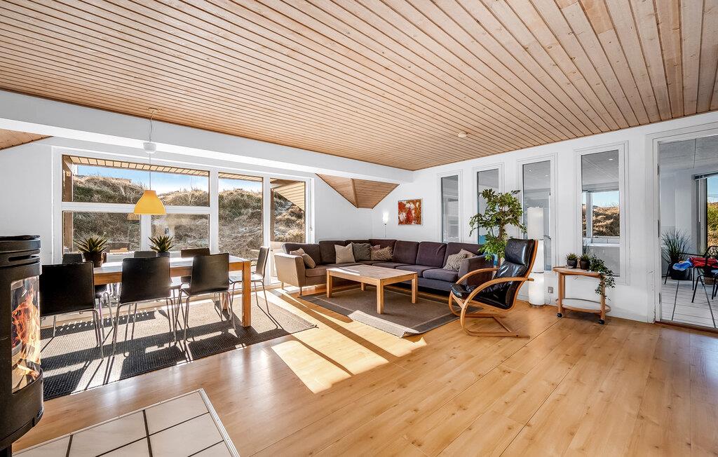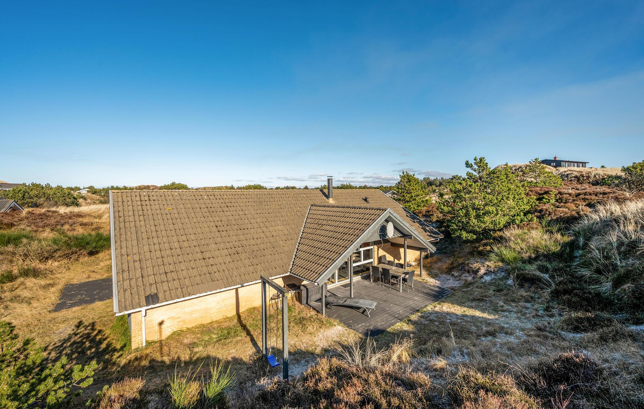 Ikke langt fra Vesterhavets blå bølger og den hvide, flotte badestrand, ligger dette dejlige feriehus med tilhørende stor poolafdeling der indeholder swimmingpool, spabad samt adgang til sauna. Feriehuset er indrettet med et lyst og venligt køkken/alrum med brændeovn og udgang til en sydvestvendt, flisebelagt terrasse med rigtig gode læmuligheder. Grunden er en meget kuperet naturgrund med lyng og marehalm.