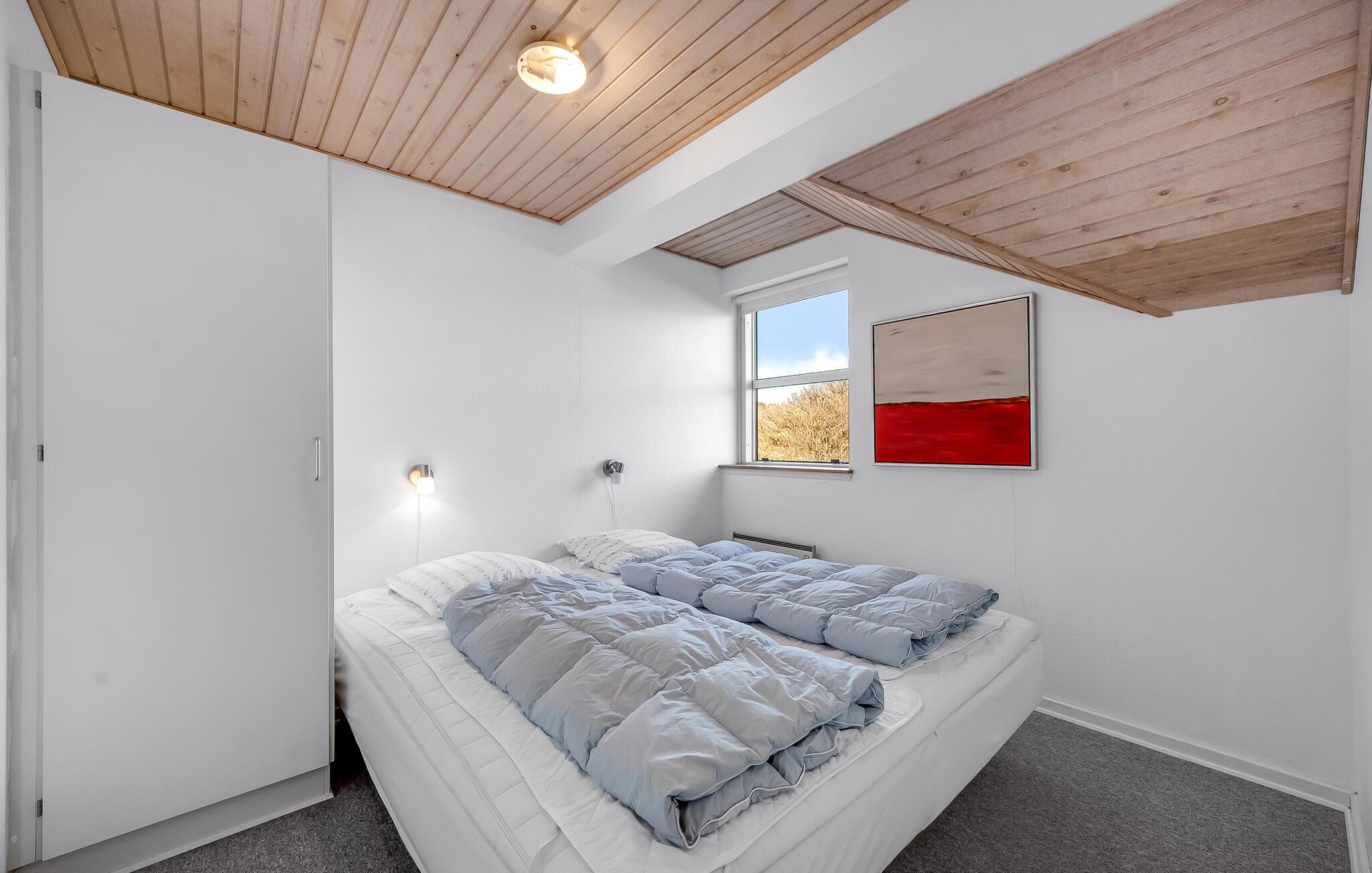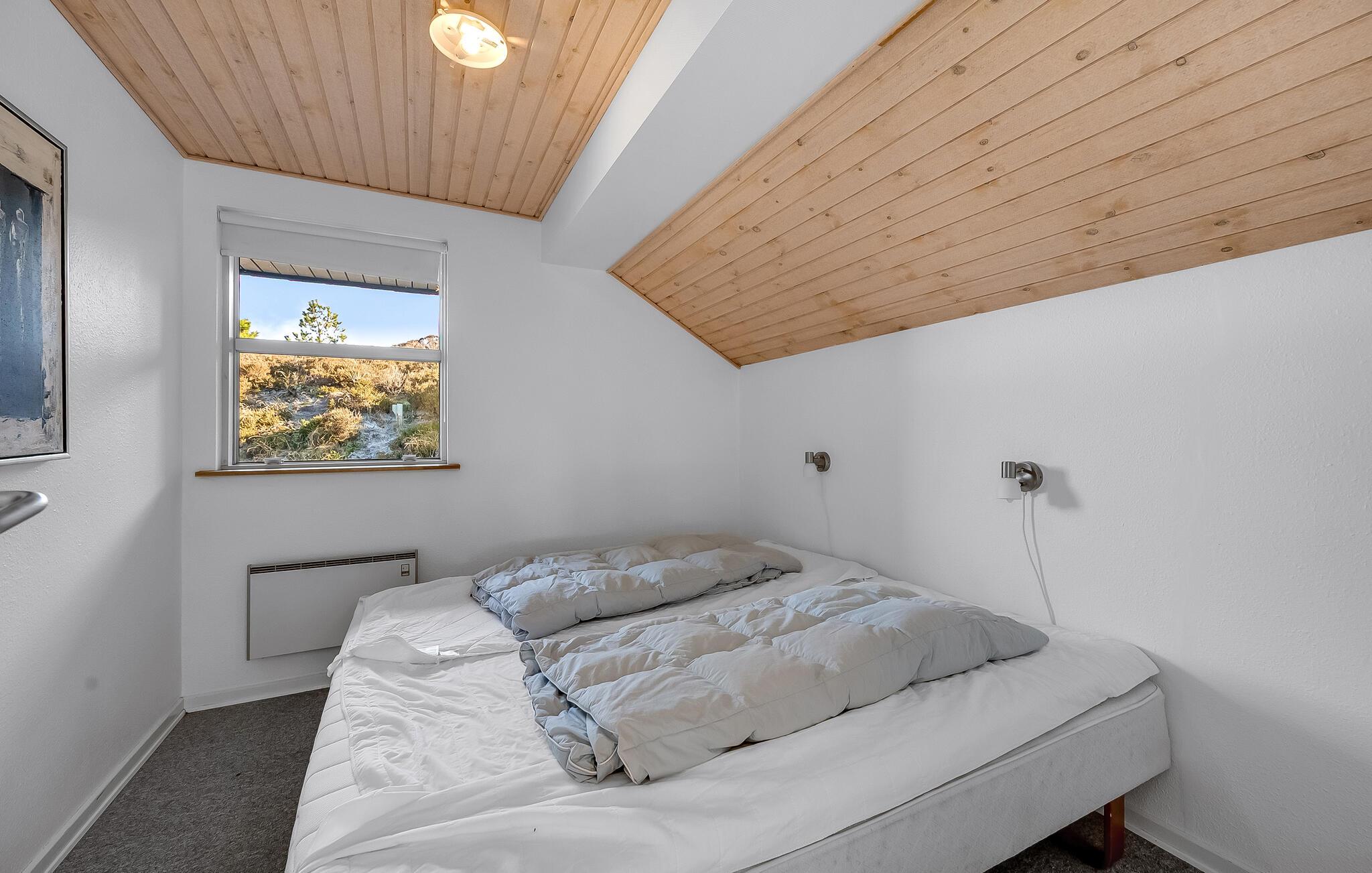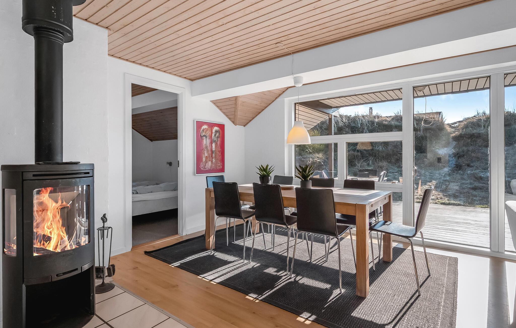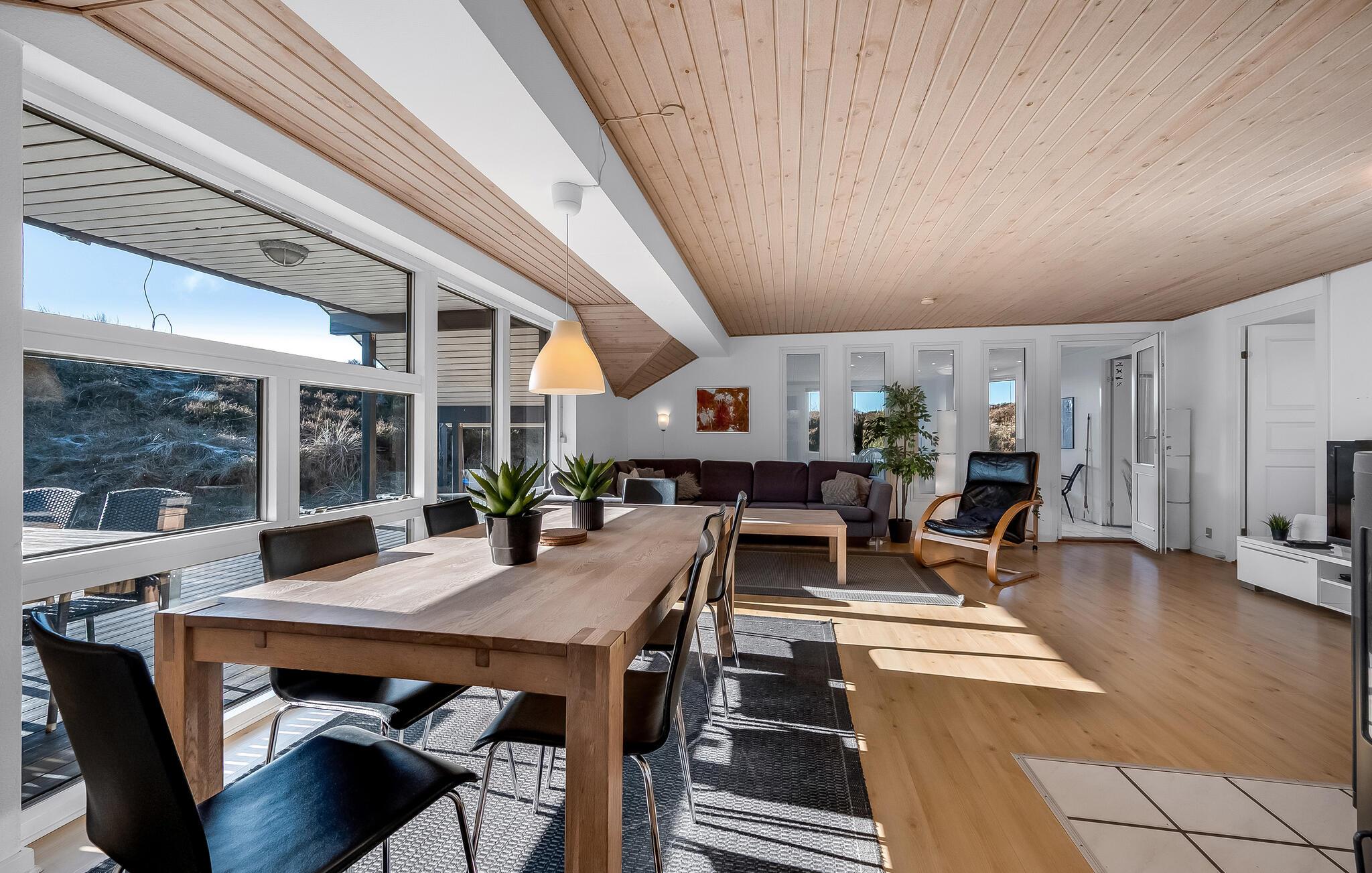 Ikke langt fra Vesterhavets blå bølger og den hvide, flotte badestrand, ligger dette dejlige feriehus med tilhørende stor poolafdeling der indeholder swimmingpool, spabad samt adgang til sauna. Feriehuset er indrettet med et lyst og venligt køkken/alrum med brændeovn og udgang til en sydvestvendt, flisebelagt terrasse med rigtig gode læmuligheder. Grunden er en meget kuperet naturgrund med lyng og marehalm.