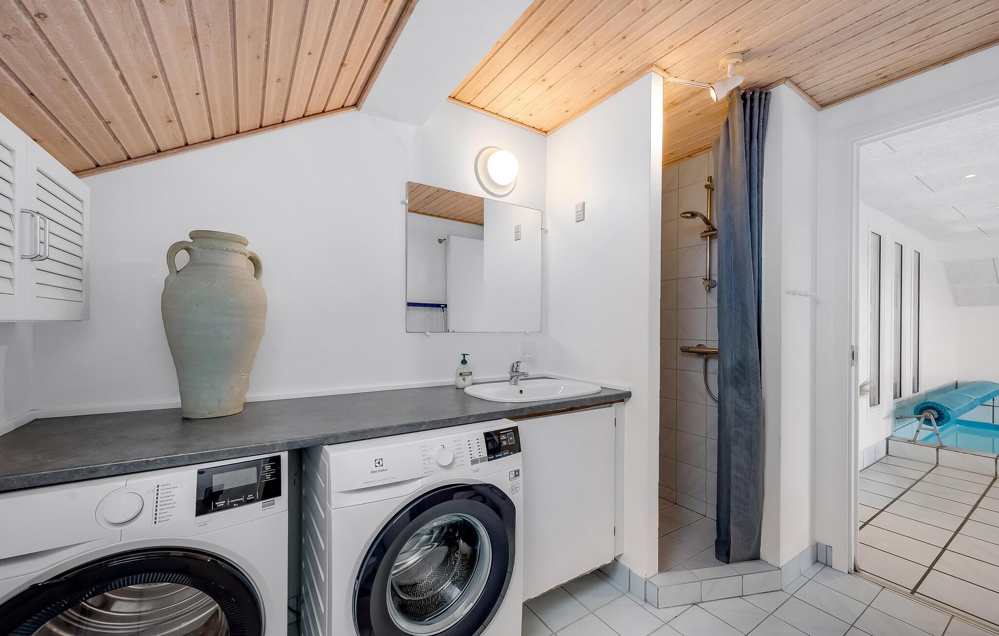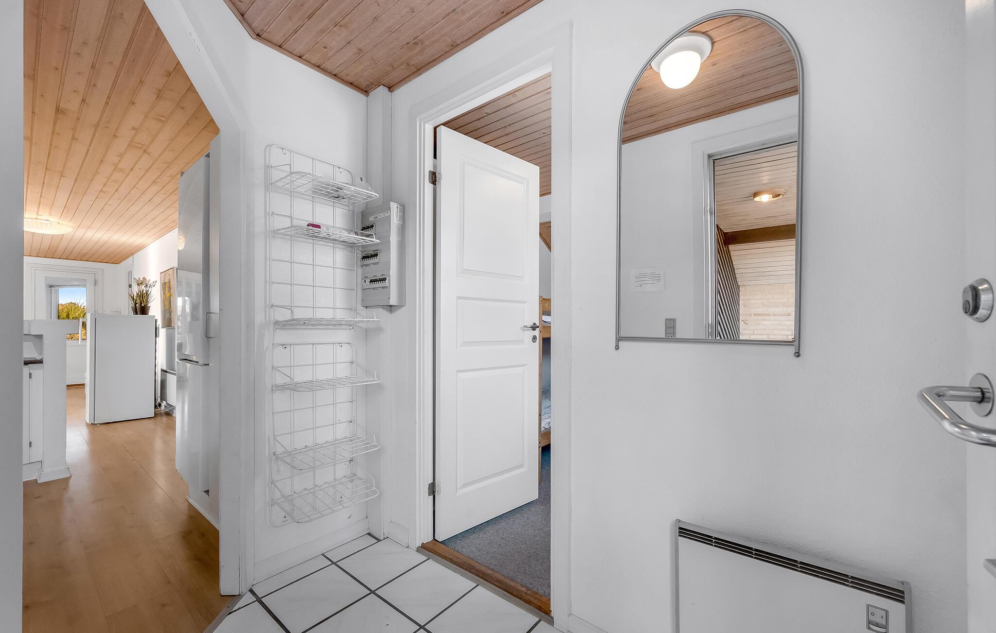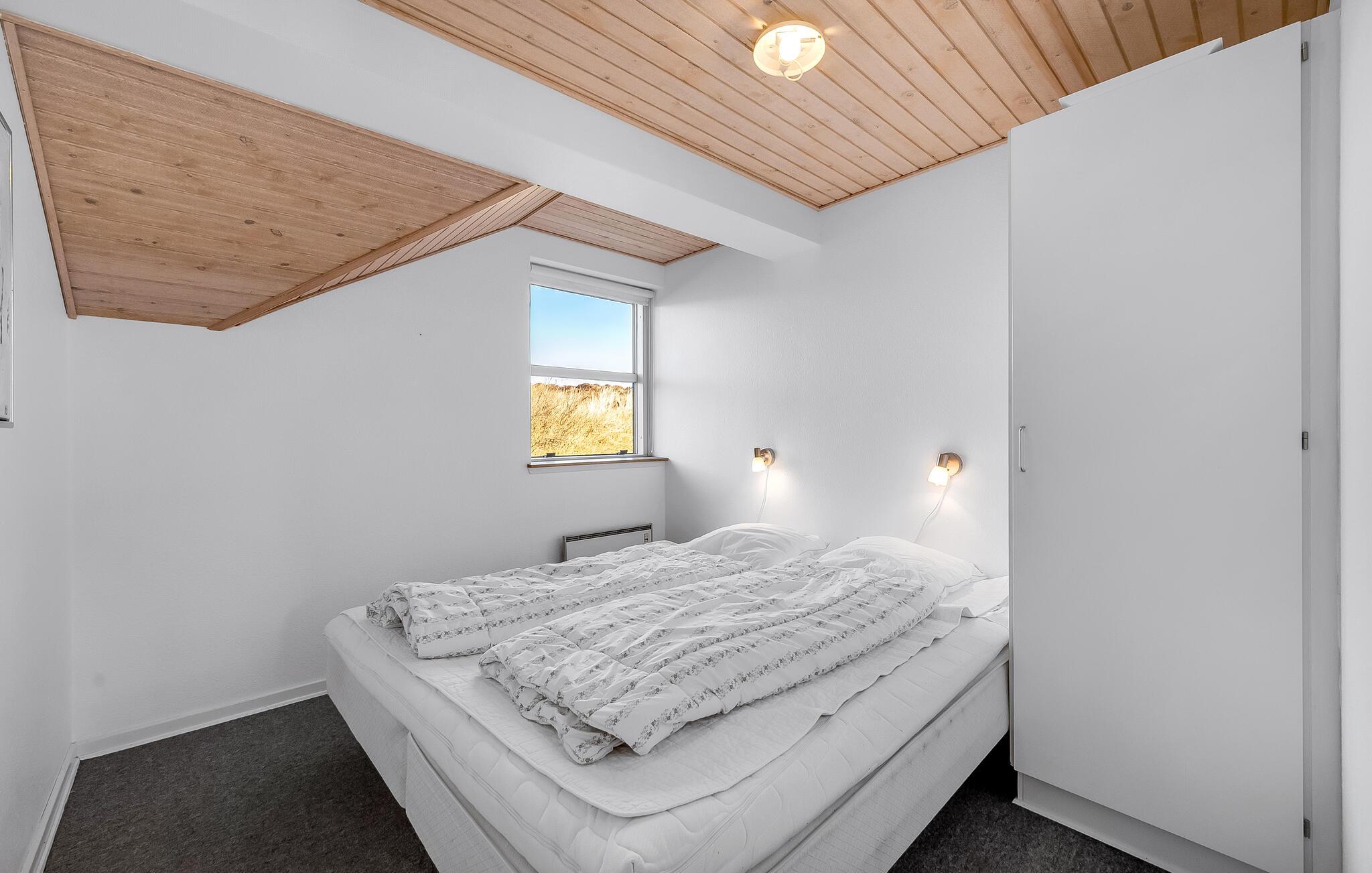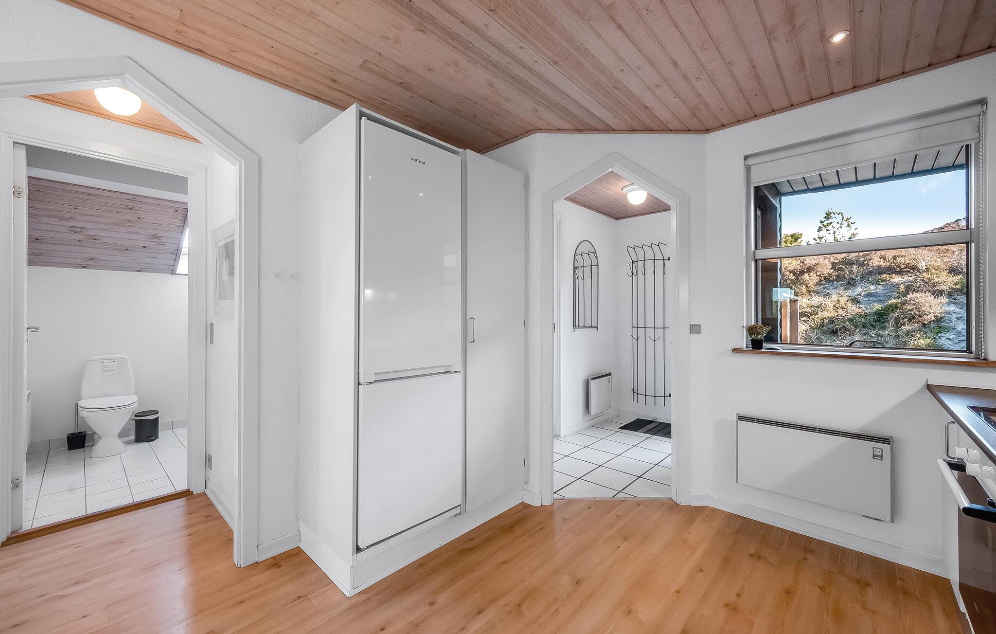 Ikke langt fra Vesterhavets blå bølger og den hvide, flotte badestrand, ligger dette dejlige feriehus med tilhørende stor poolafdeling der indeholder swimmingpool, spabad samt adgang til sauna. Feriehuset er indrettet med et lyst og venligt køkken/alrum med brændeovn og udgang til en sydvestvendt, flisebelagt terrasse med rigtig gode læmuligheder. Grunden er en meget kuperet naturgrund med lyng og marehalm.