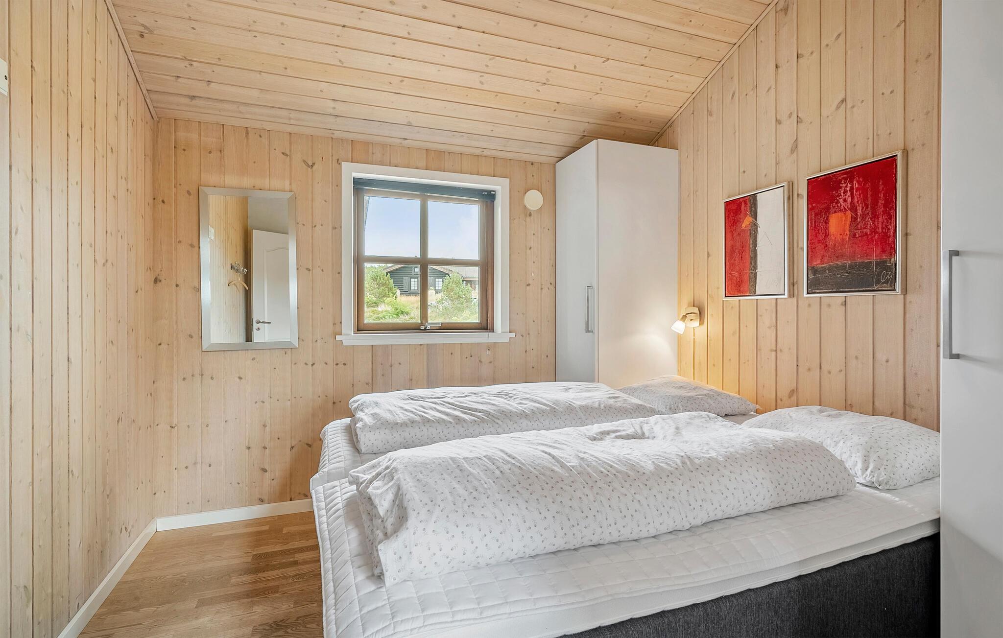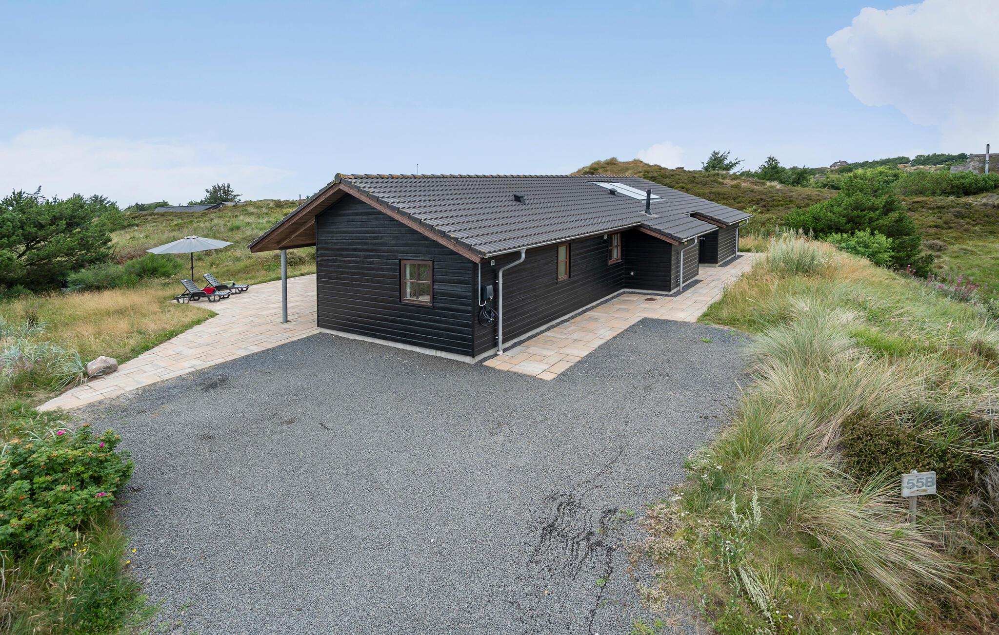 Velkommen til dette moderne hus, der ligger i naturskønne omgivelser i klitterne ved Henne Strand, og hvor I får en yders komfortabel ramme om årets ferie med den større familie eller måske for to vennefamilier. Huset er flot opført i materialer af høj kvalitet, og indretningen fremtræder lyst og indbydende med loft til kip og store vinduespartier, der giver udsigt til klitterne og dejlige lysindfald til stuen. For maksimal komfort er der to skønne badeværelser med brusere, og i det ene er der både sauna og spabad, hvor I kan forkæle jer selv med lidt wellness efter en aktiv feriedag. Det åbne køkken er forbundet med opholdsstuen med spisebord, et opholdsområde og en brændeovn, der giver varme og stemning, hvis vejret skulle bide lidt fra sig.