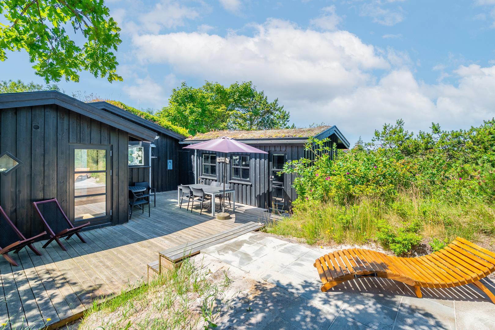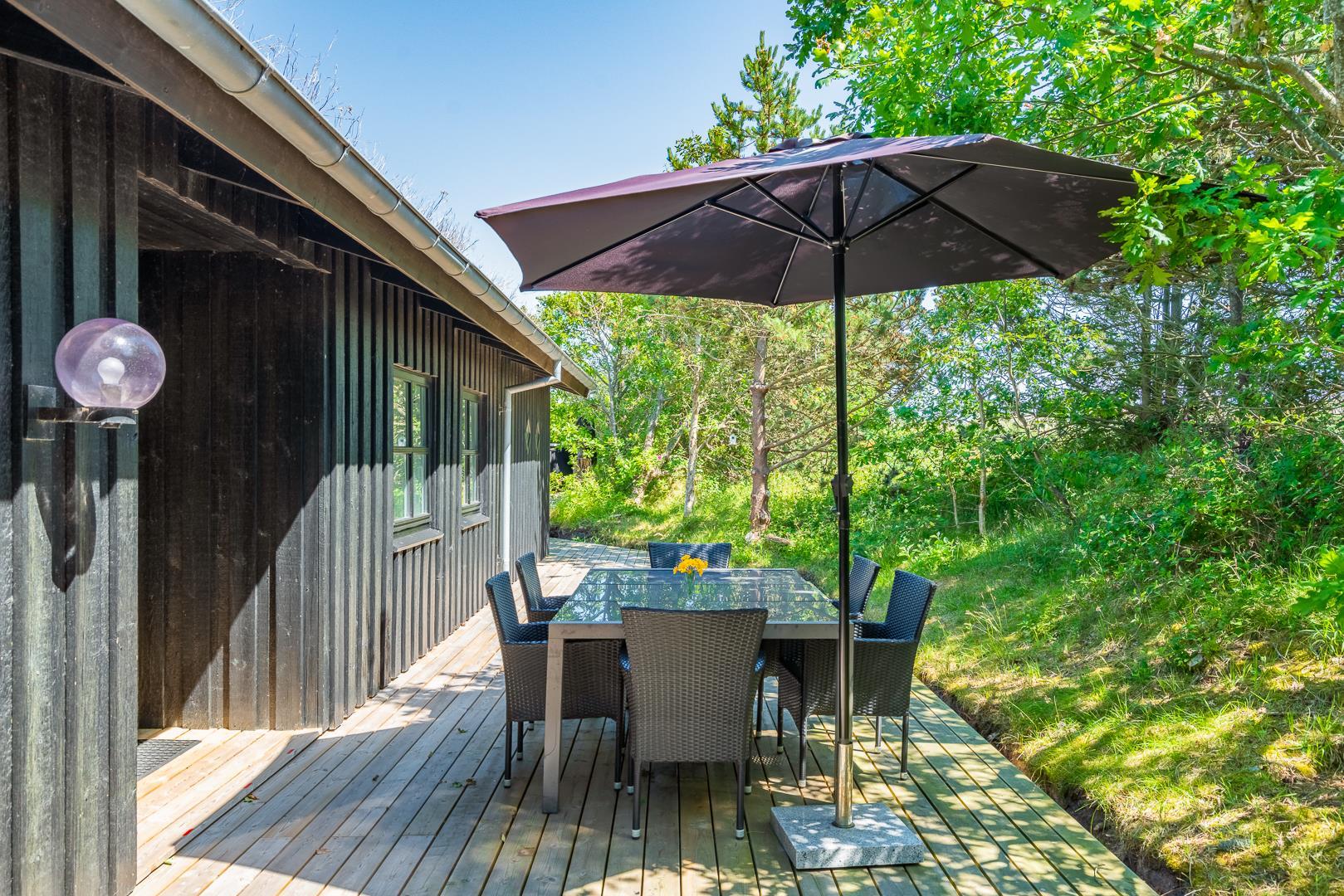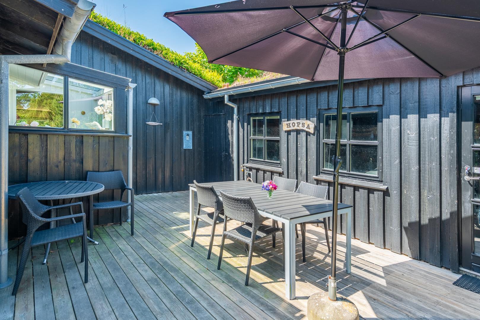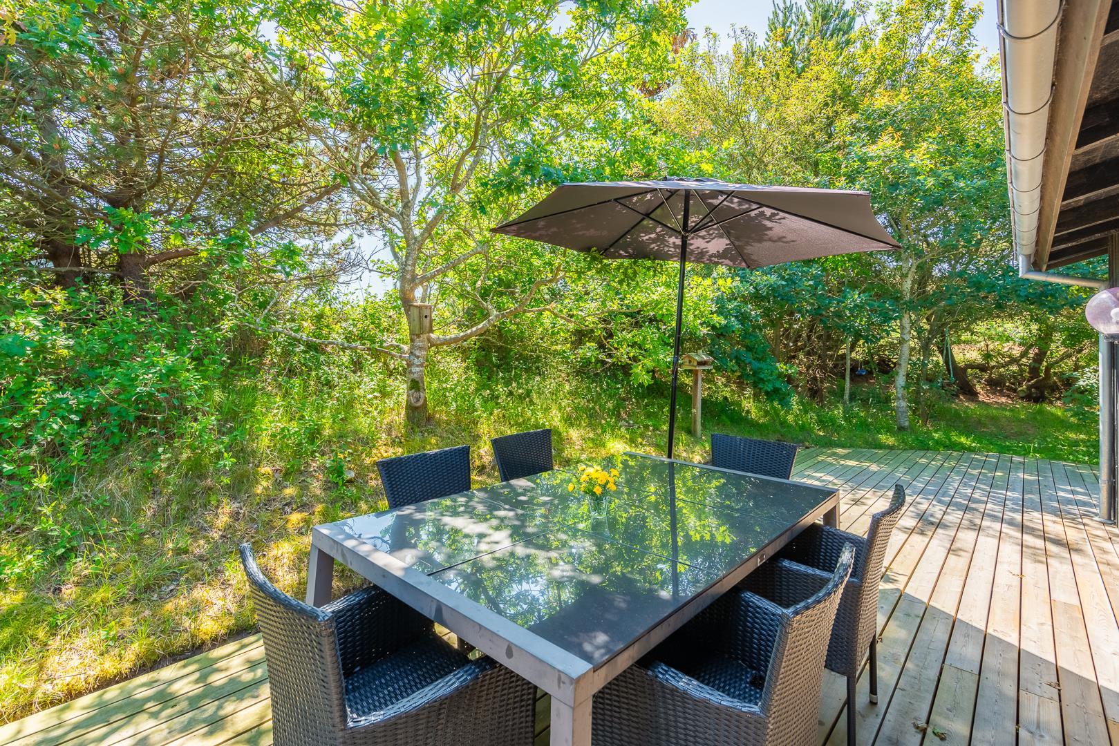 Fra stuen er der direkte udgang til en stor træterrasse, som omkranser tre sider af huset. Det giver dig mulighed for at nyde solen fra morgen til aften. Bag huset finder du en fuldstændig ugeneret og læfuld terrasse – perfekt til afslapning i ro og fred.
