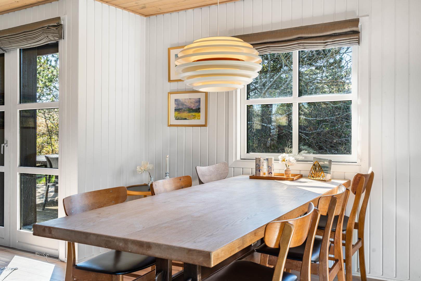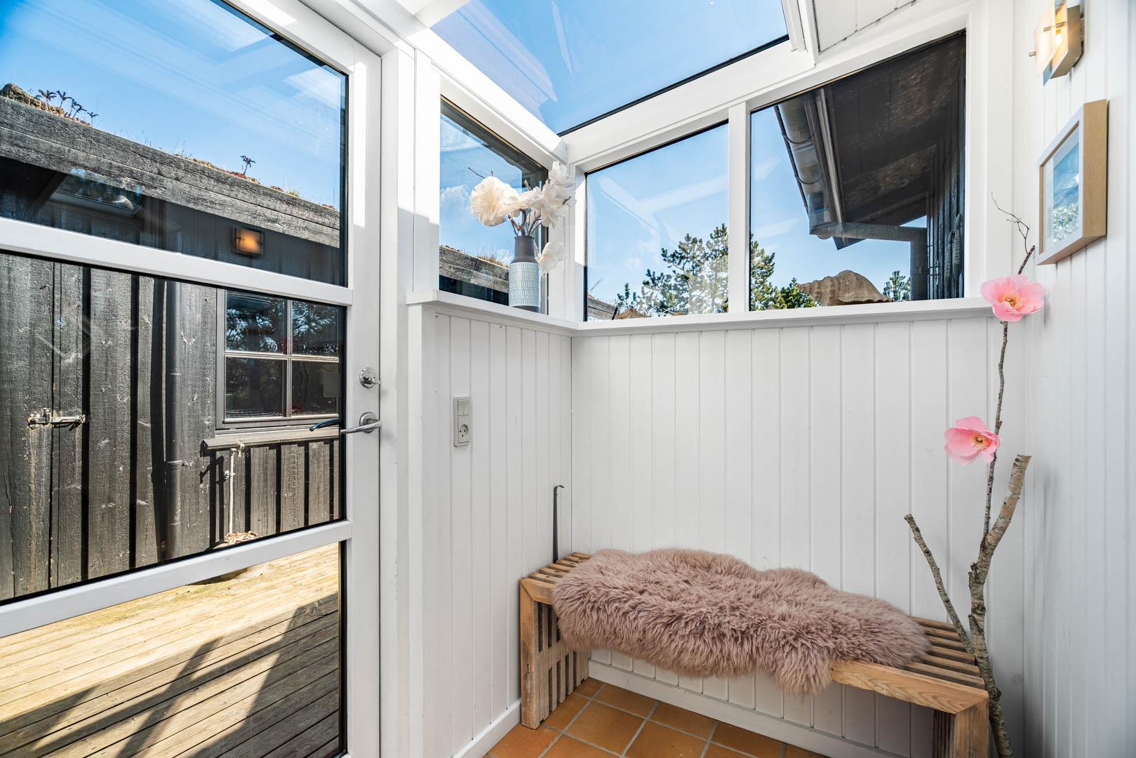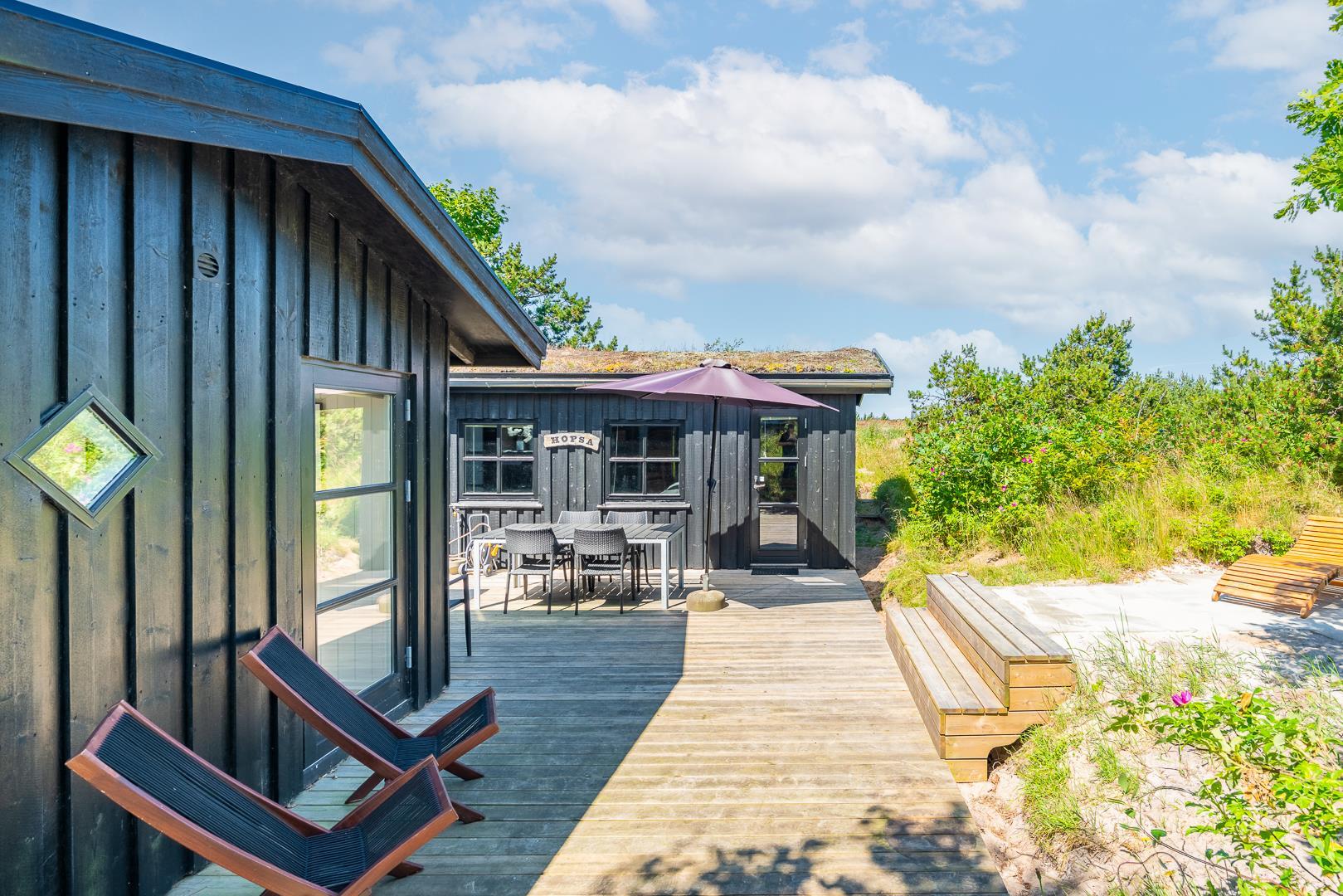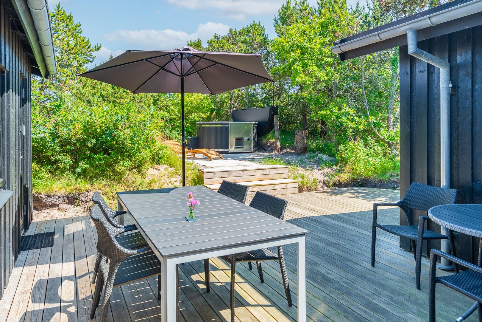 Fra stuen er der direkte udgang til en stor træterrasse, som omkranser tre sider af huset. Det giver dig mulighed for at nyde solen fra morgen til aften. Bag huset finder du en fuldstændig ugeneret og læfuld terrasse – perfekt til afslapning i ro og fred.