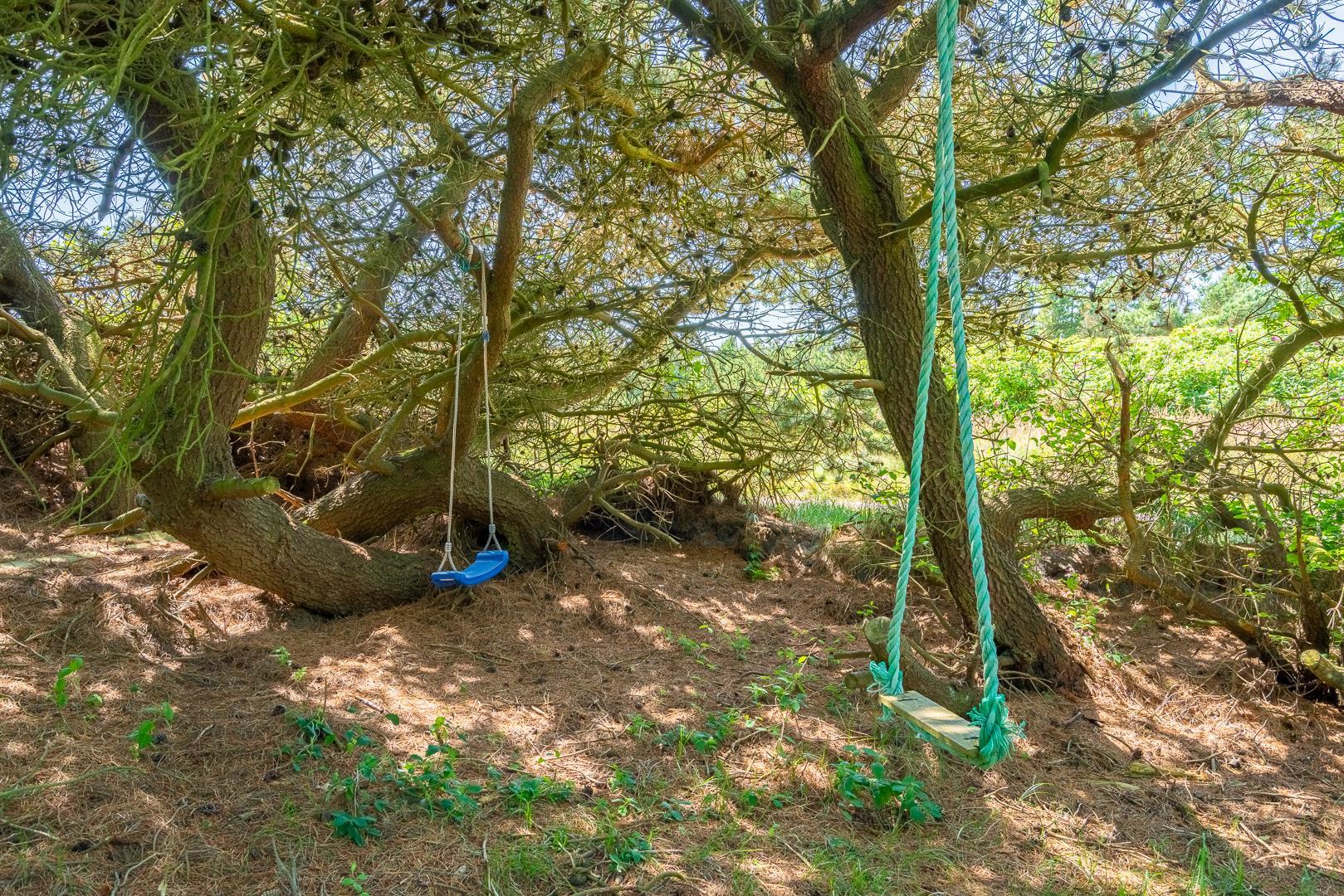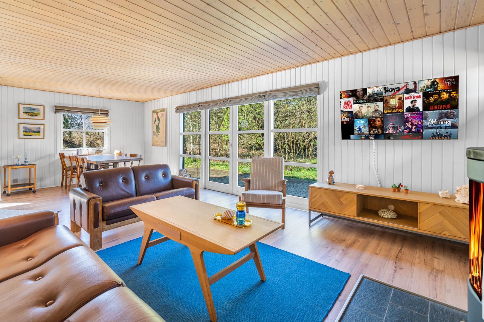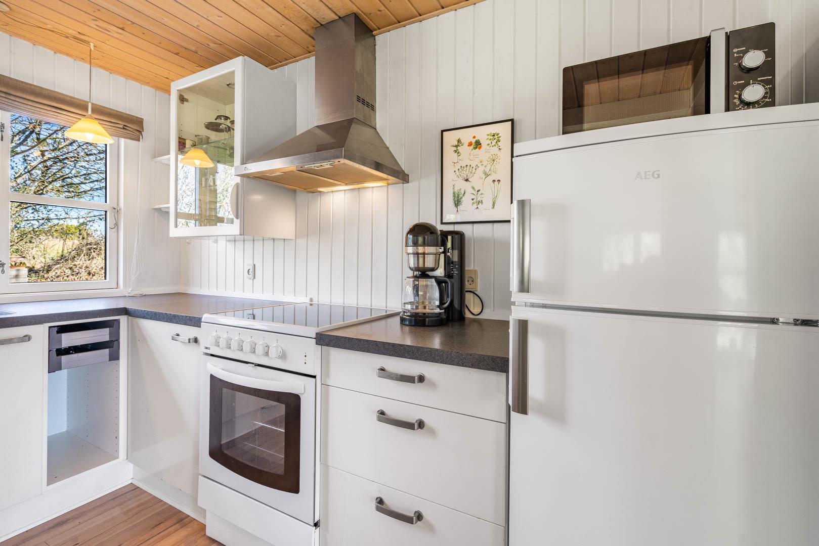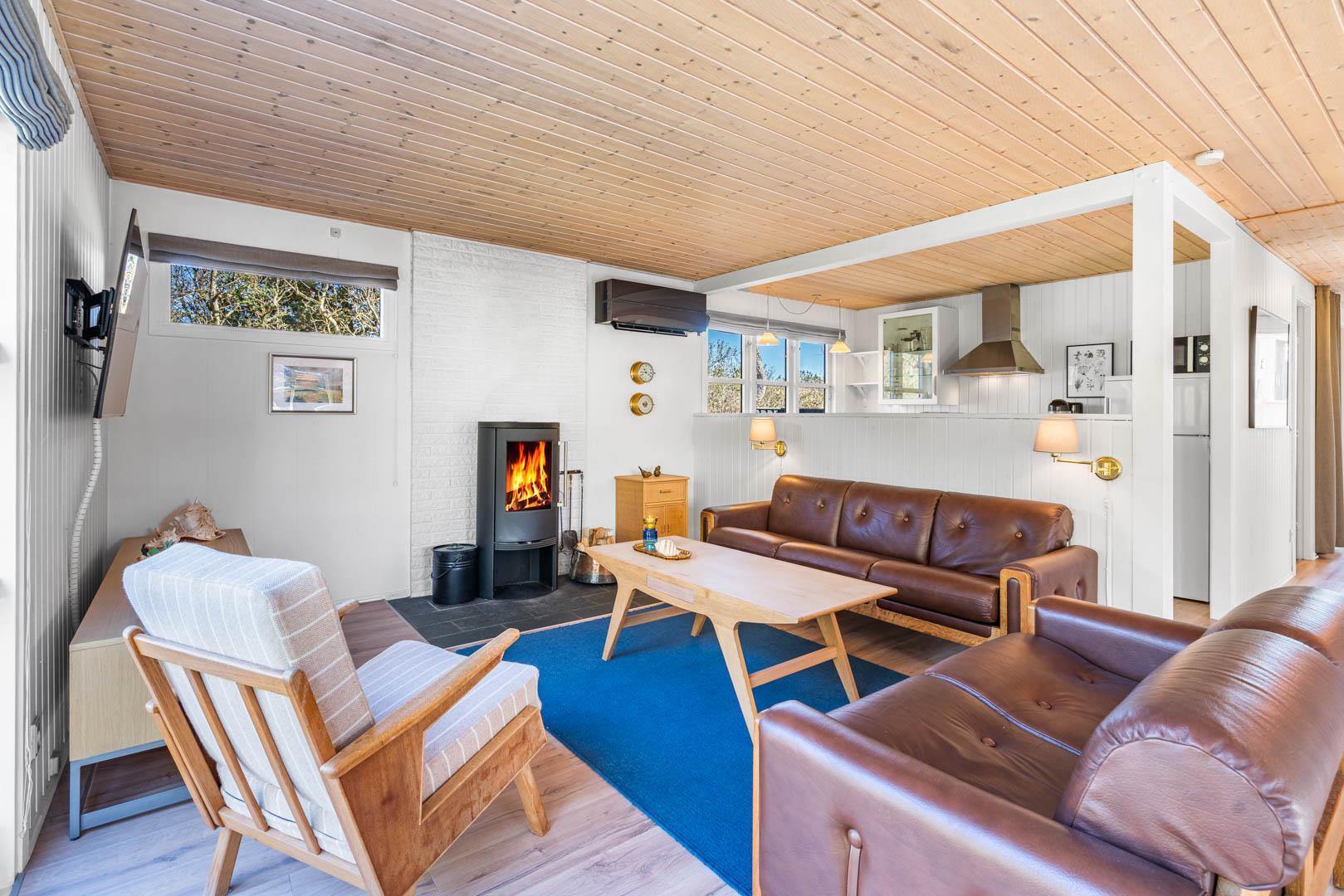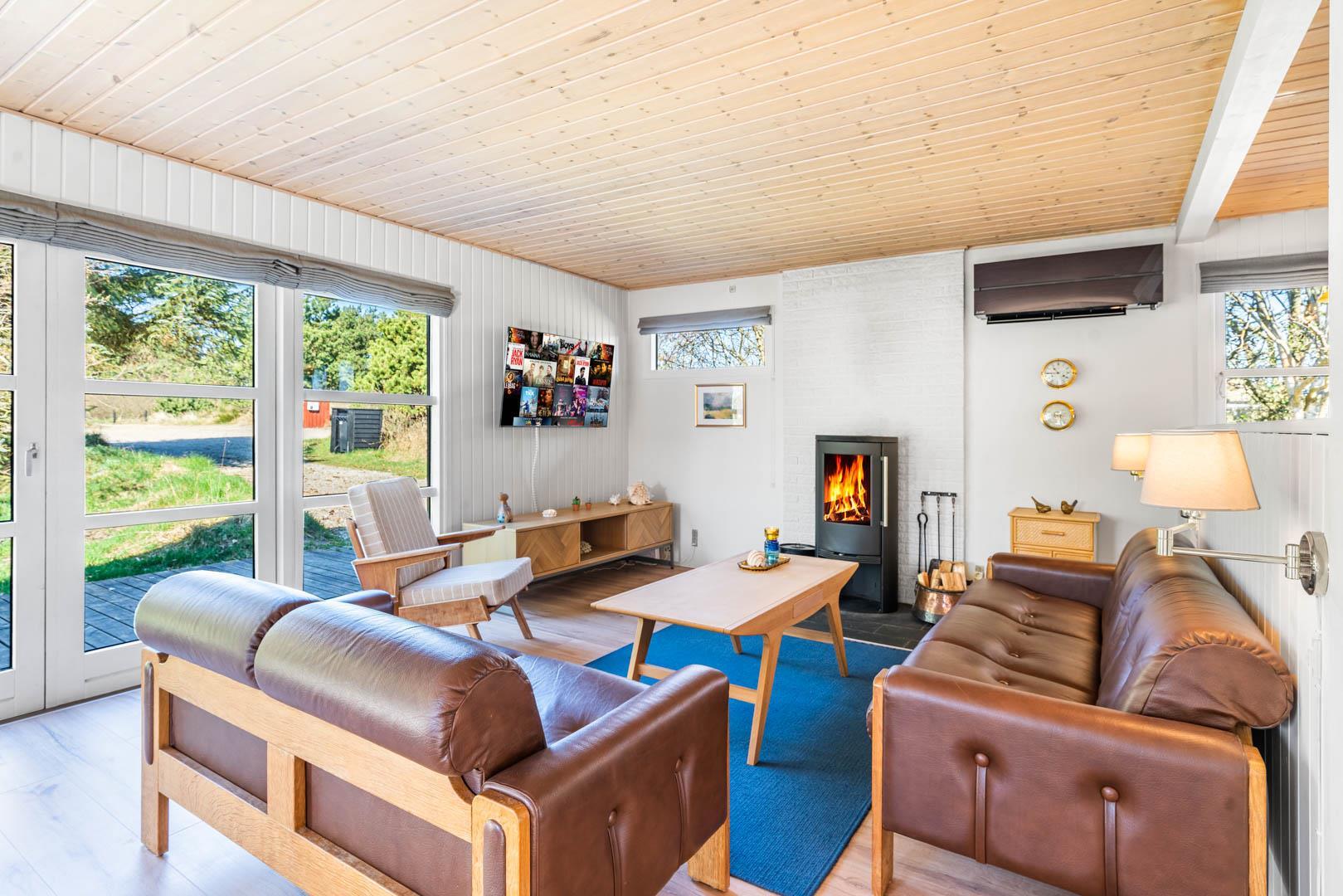 På en pragtfuld, kuperet naturgrund finder du dette dejlige feriehus, der emmer af charme. Huset byder på et pænt og veludstyret køkken i åben forbindelse med en lys og indbydende stue. Her kan du slappe af i de gode møbler foran brændeovnen med glaslåge, der skaber en hyggelig atmosfære på kølige dage.