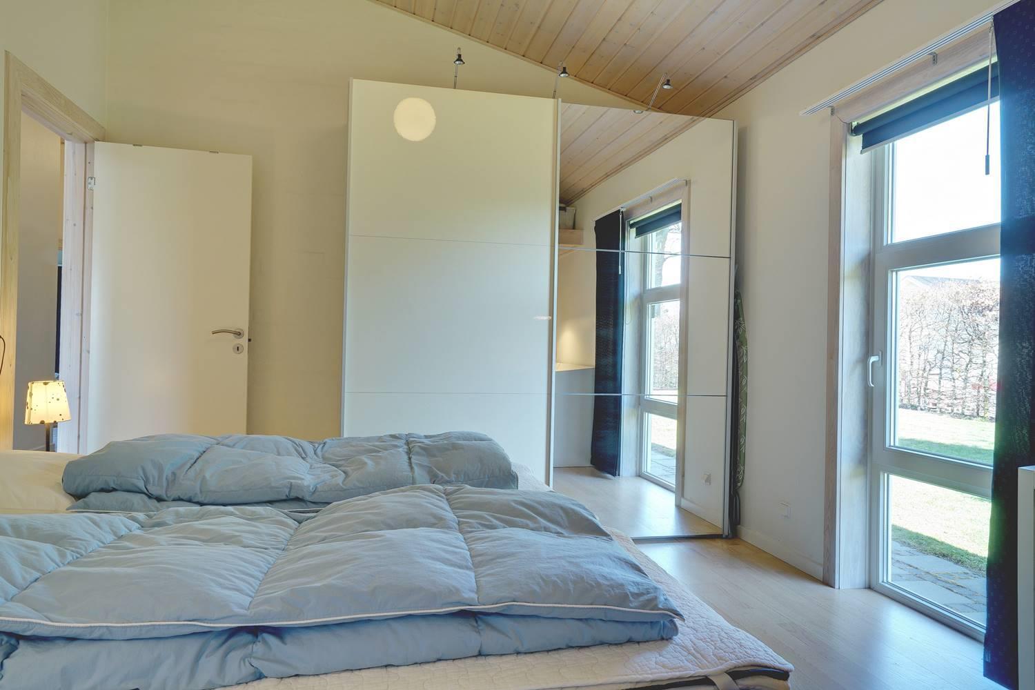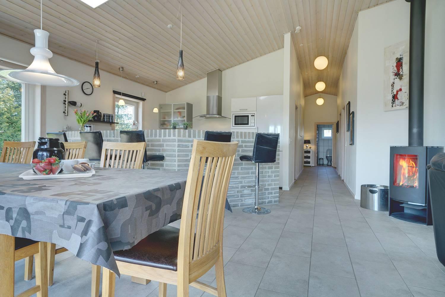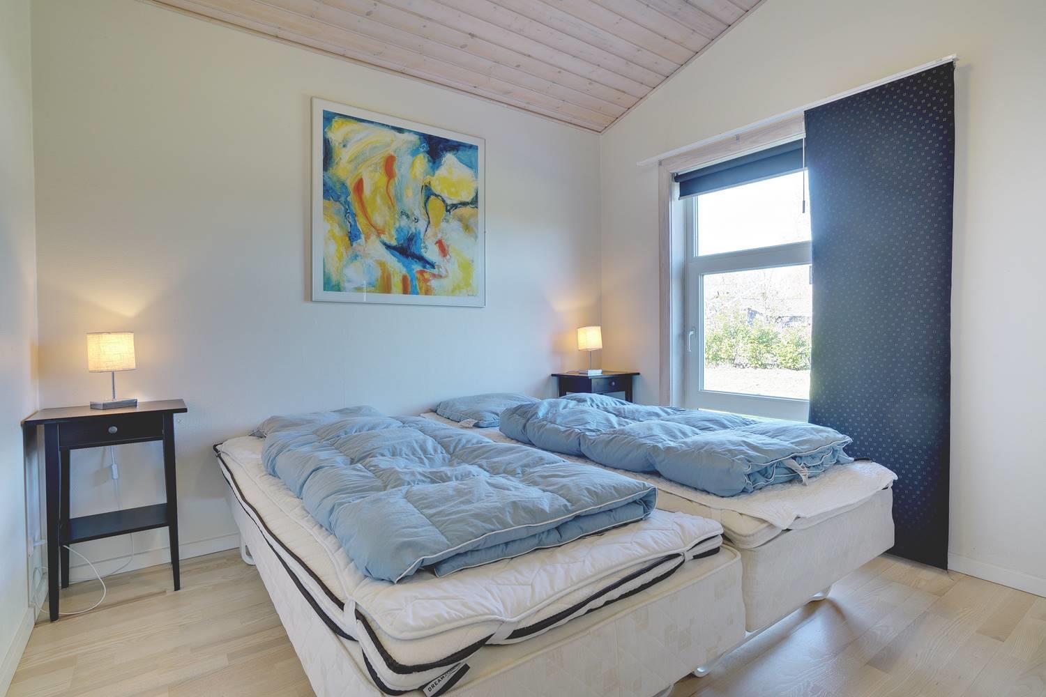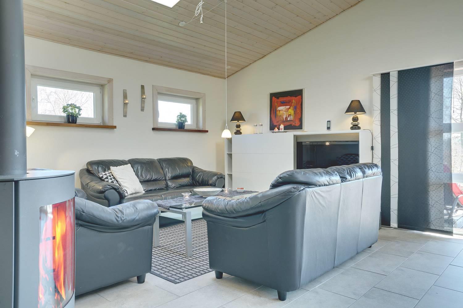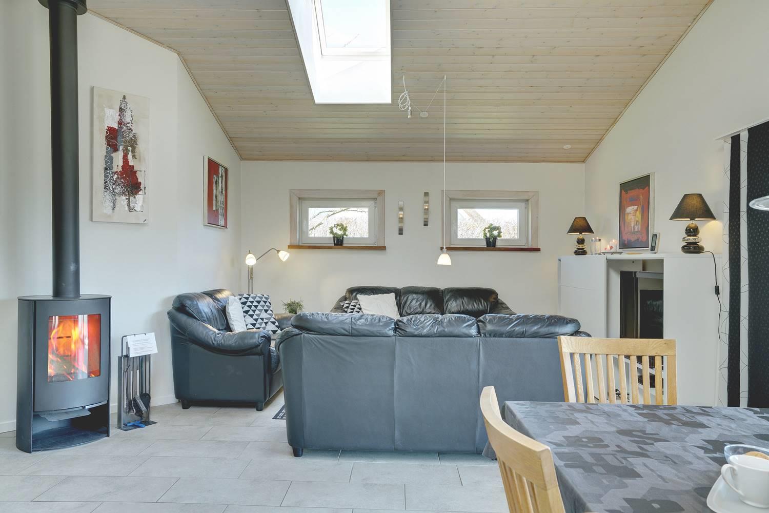 I får rig mulighed for at nyde hinandens selskab i husets lyse opholdsrum med integreret køkken, brændeovn og ovenlysvinduer, og når I trænger til en privat stund, kan I trække jer tilbage til de fire soveværelser, som alle er rummelige og udstyret med komfortable dobbeltsenge. Der er desuden sauna og to badeværelser i huset det ene med spa. Sommerhuset har varmepumpe, hvilket giver et meget lavt energiforbrug under opholdet. Der er gulvvarme i hele huset undtagen i soveværelserne.