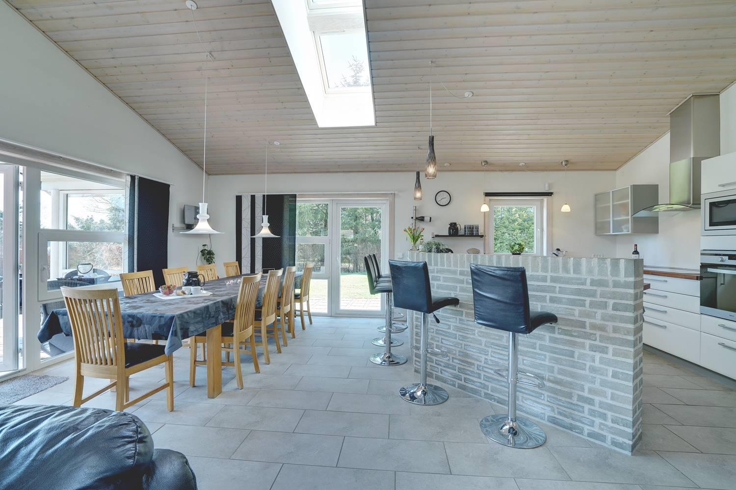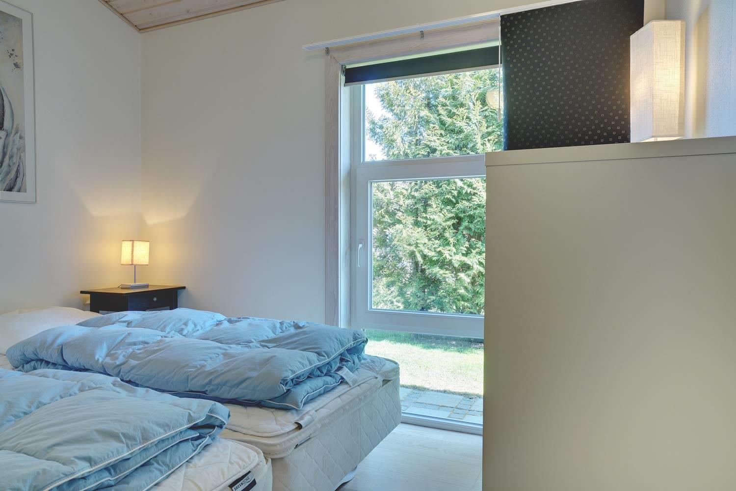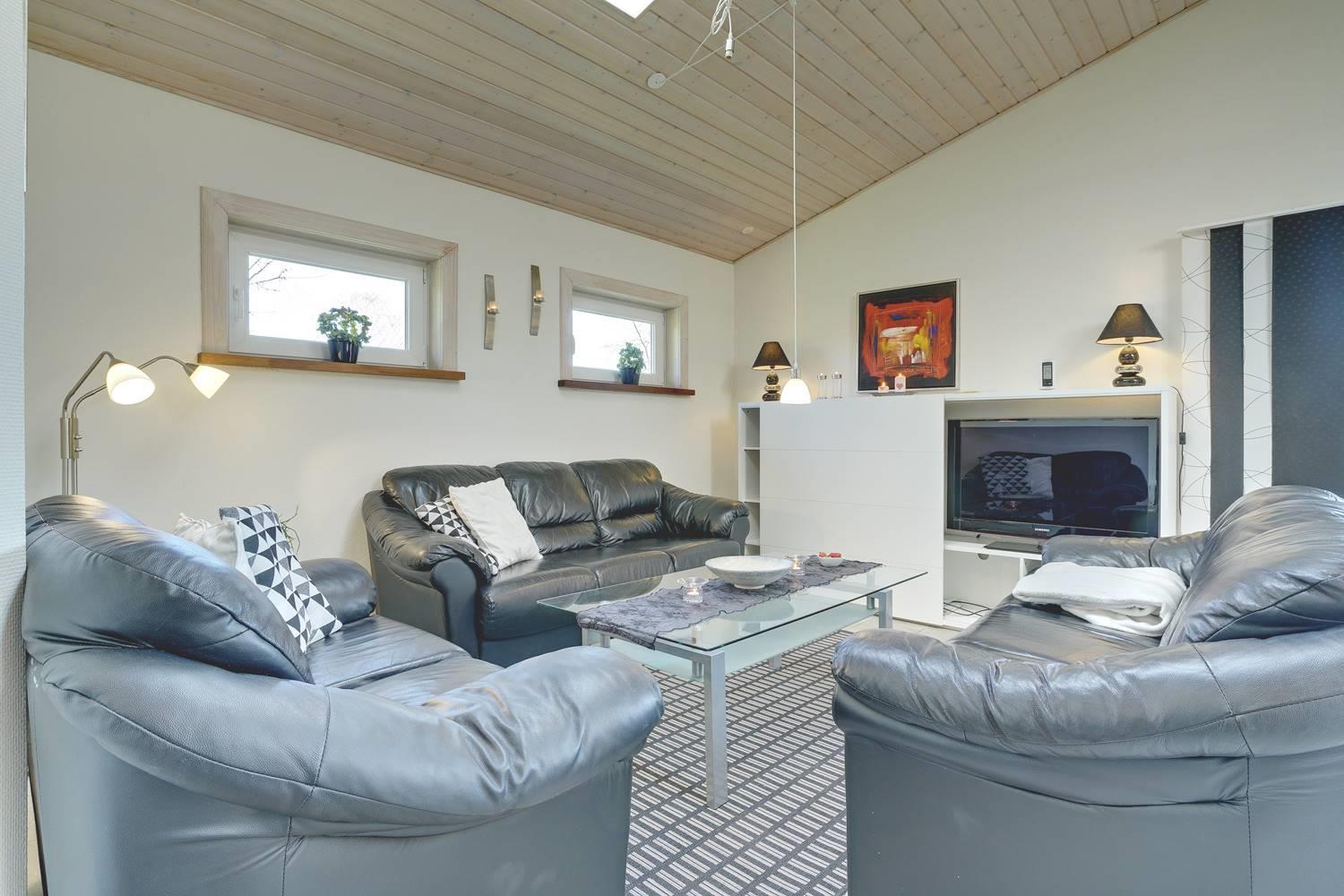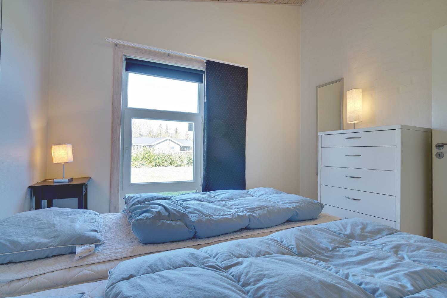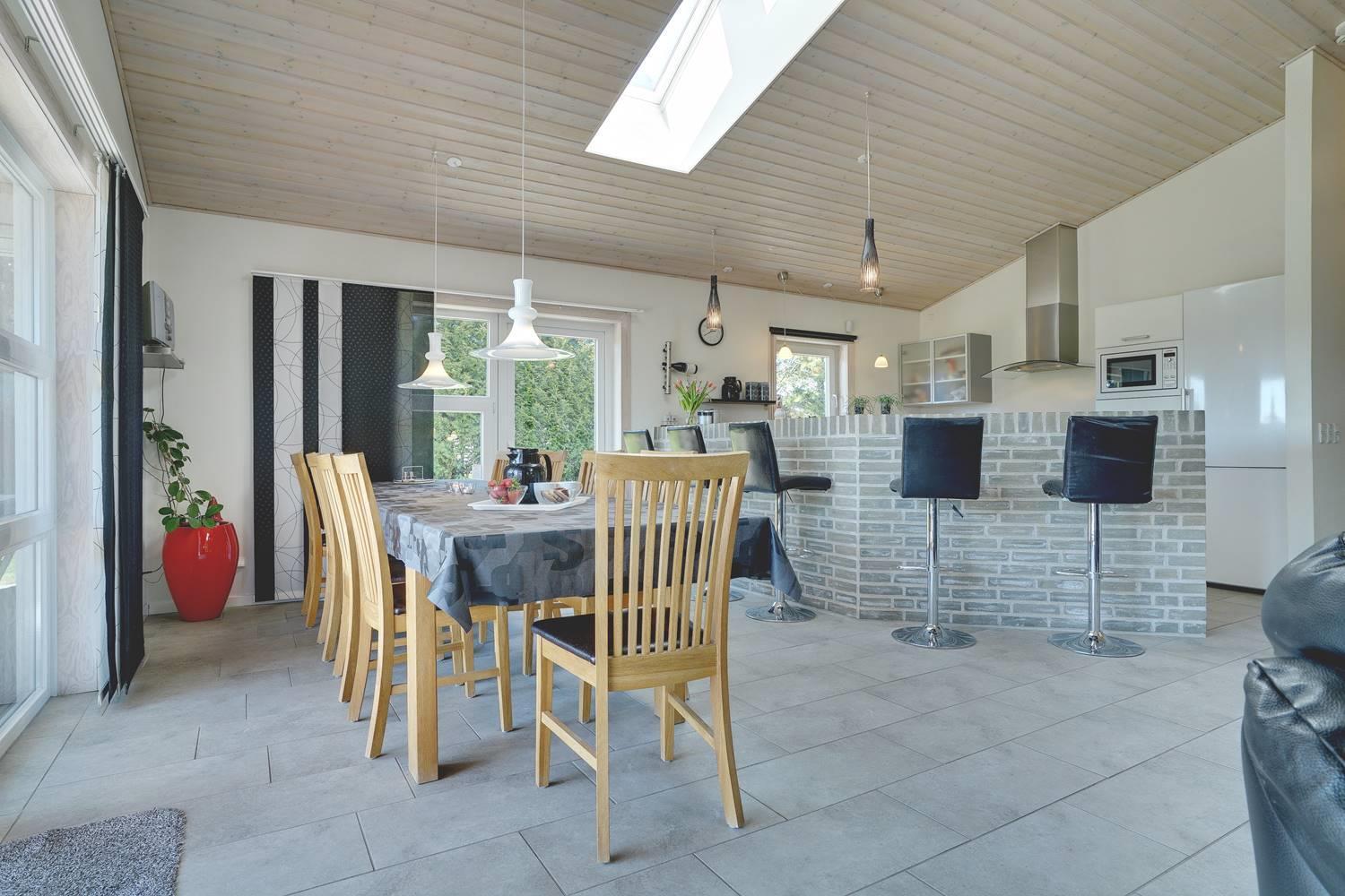 I får rig mulighed for at nyde hinandens selskab i husets lyse opholdsrum med integreret køkken, brændeovn og ovenlysvinduer, og når I trænger til en privat stund, kan I trække jer tilbage til de fire soveværelser, som alle er rummelige og udstyret med komfortable dobbeltsenge. Der er desuden sauna og to badeværelser i huset det ene med spa. Sommerhuset har varmepumpe, hvilket giver et meget lavt energiforbrug under opholdet. Der er gulvvarme i hele huset undtagen i soveværelserne.