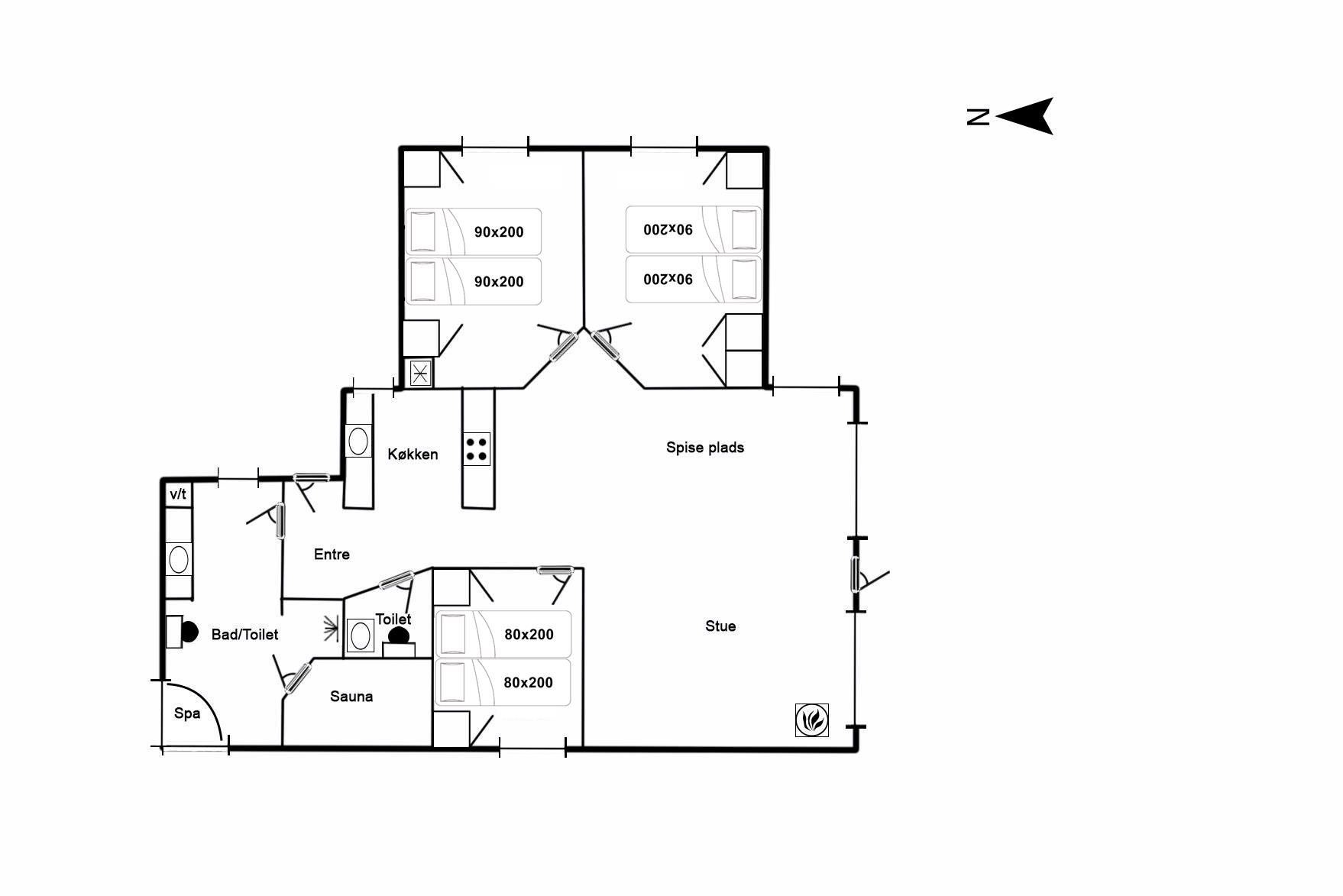 Sengestørrelse: 2 dobbeltsenge med 2 madrasser 90 x 200 cm + 1 dobbeltseng med 2 madrasser 80 x 200 cm.