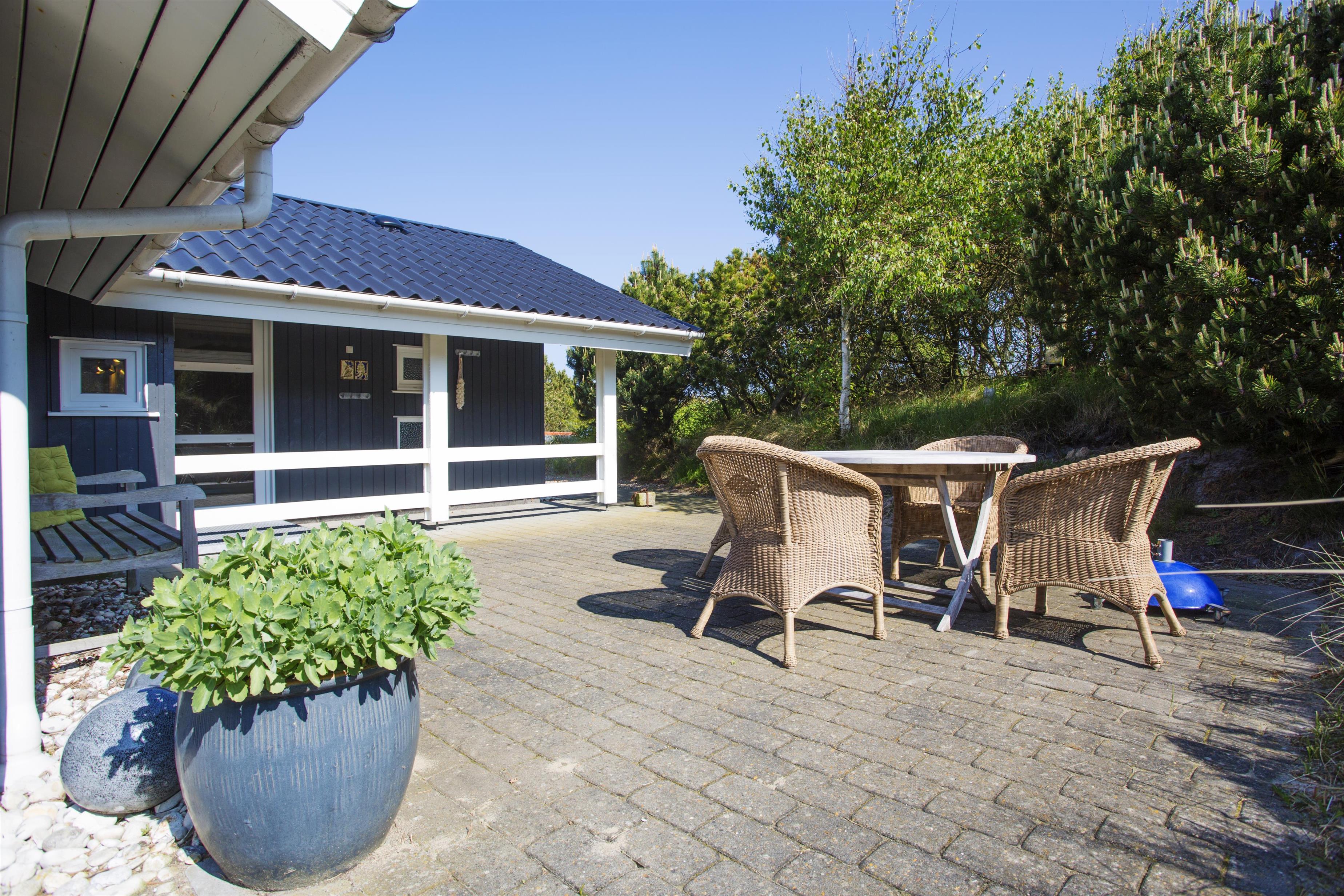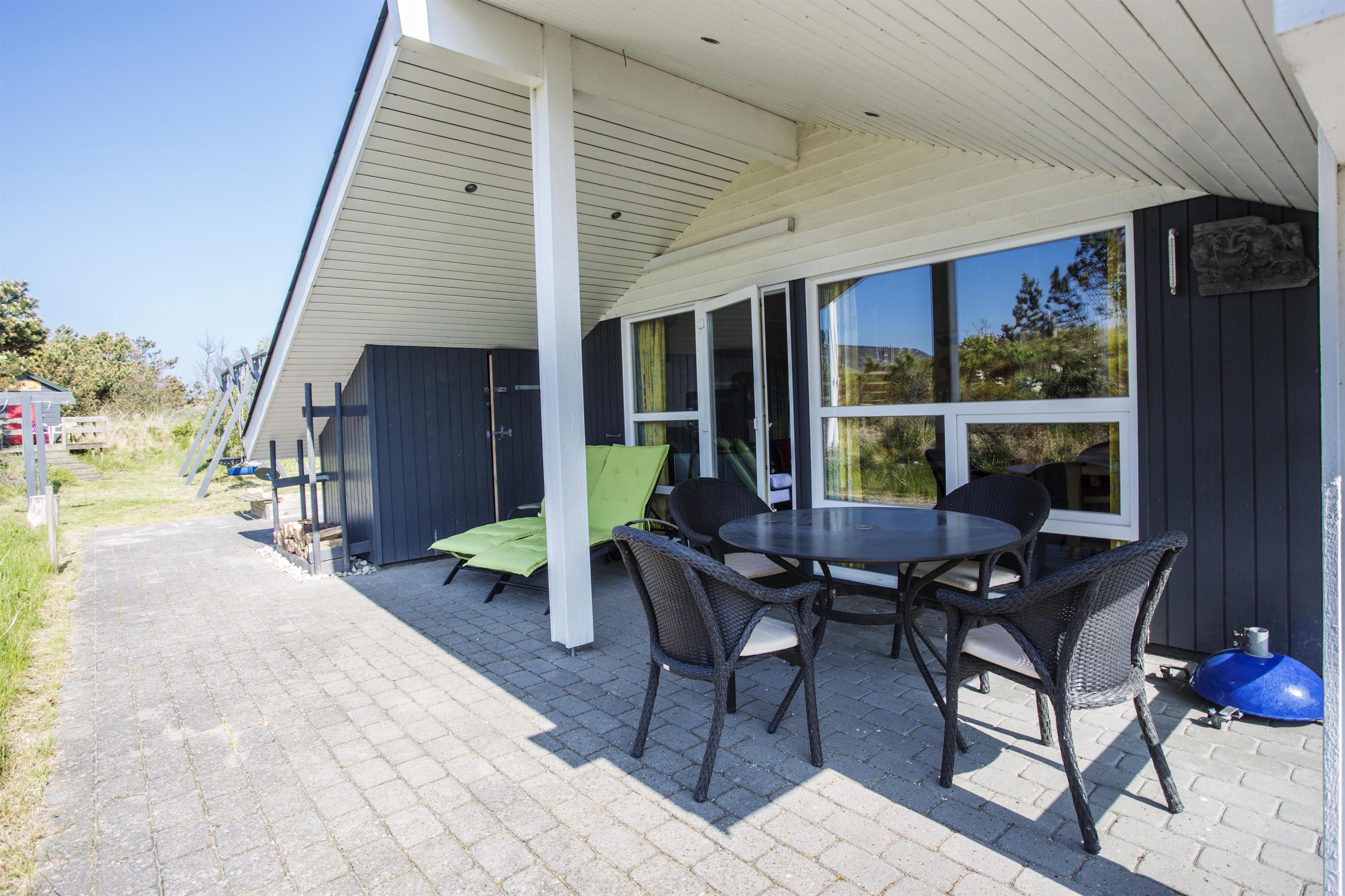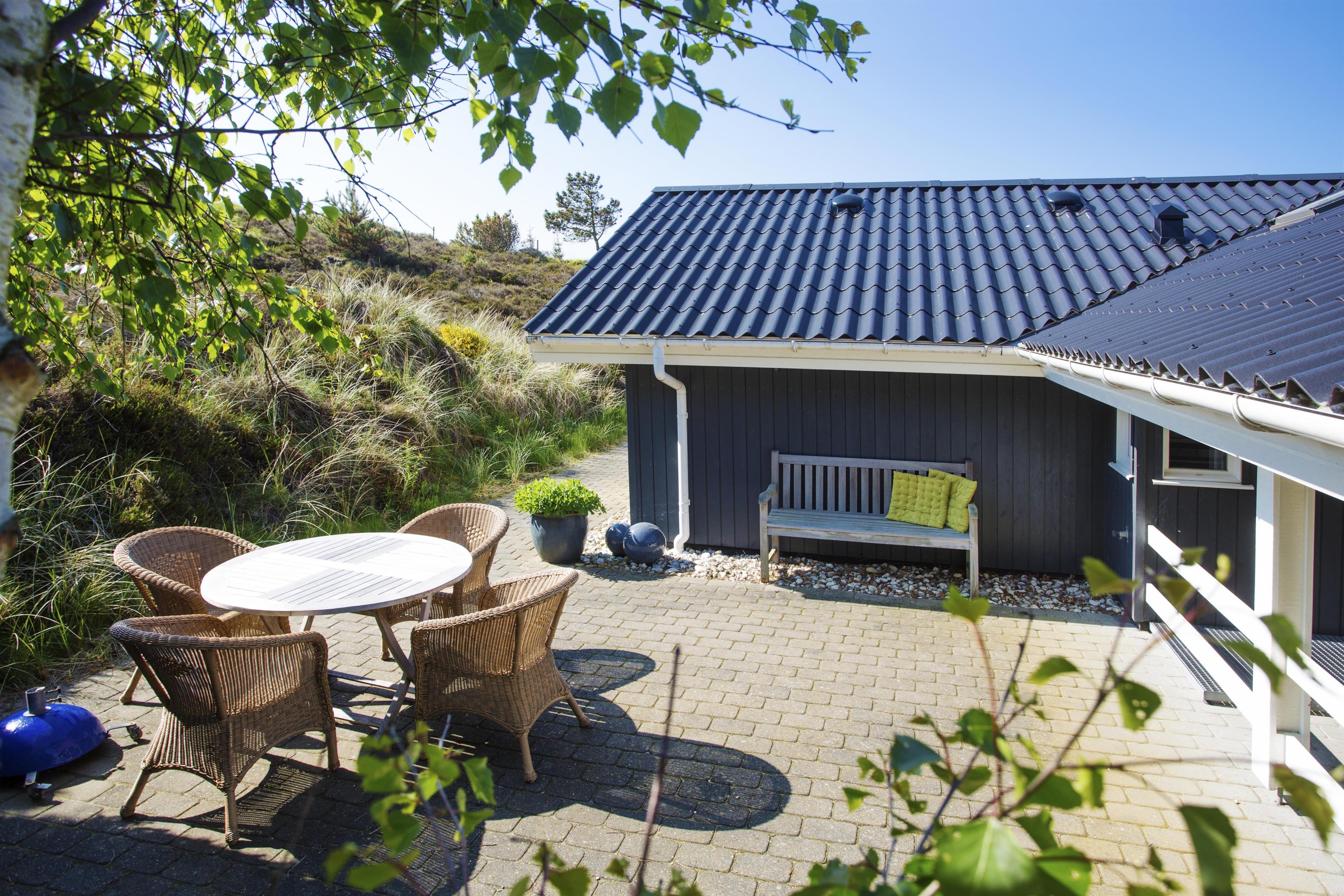 Rundt om huset sørger en klitvold for læ. En stor og delvis overdækket terrasse inviterer til solbadning. Her er der garanti for fred og ro.