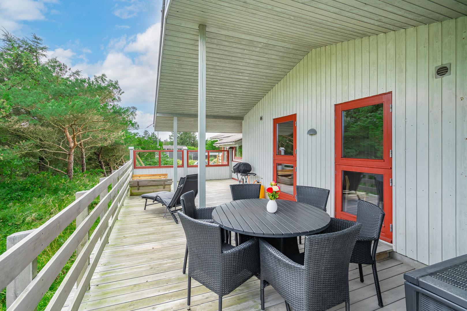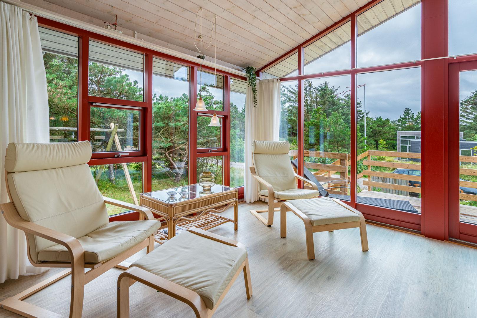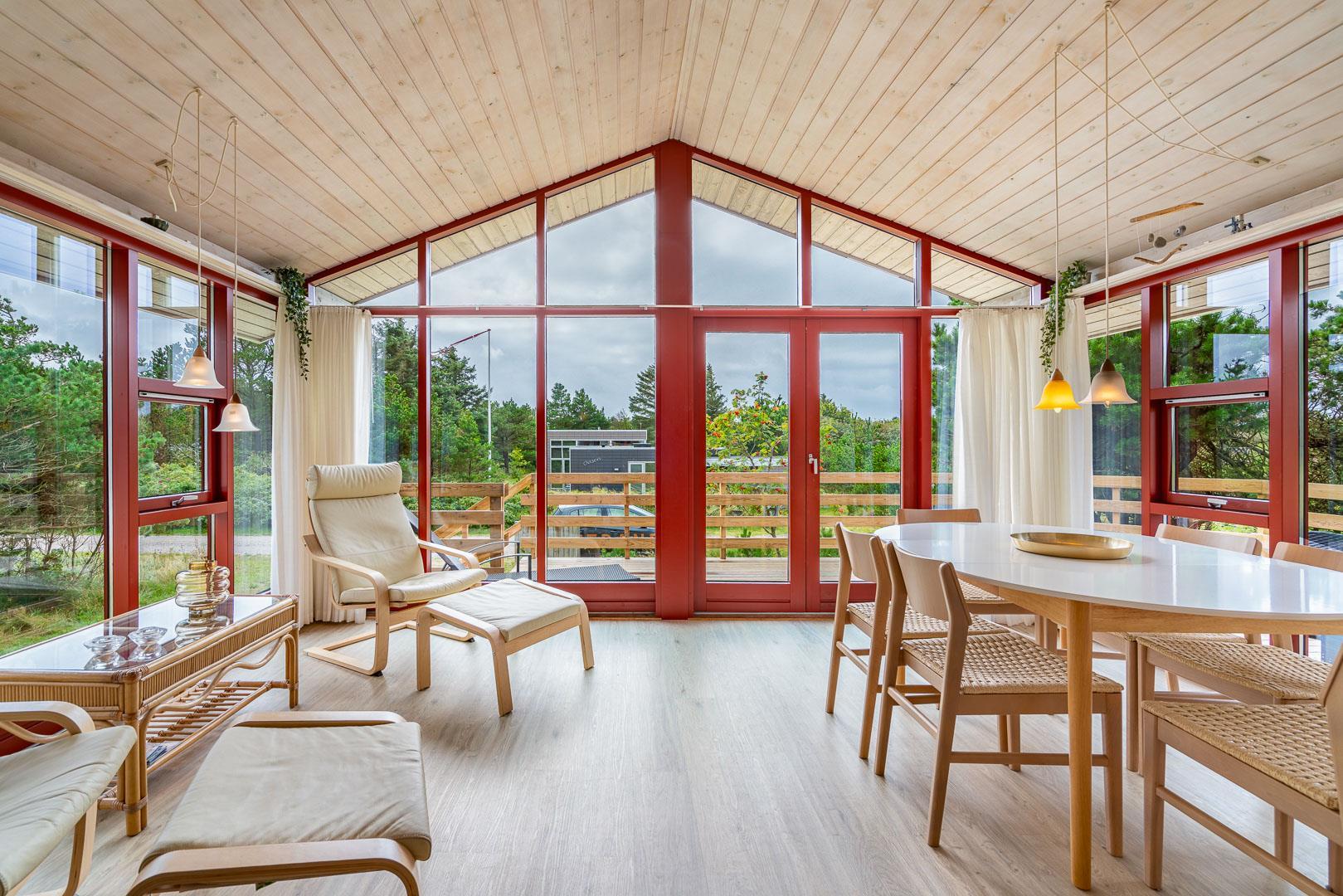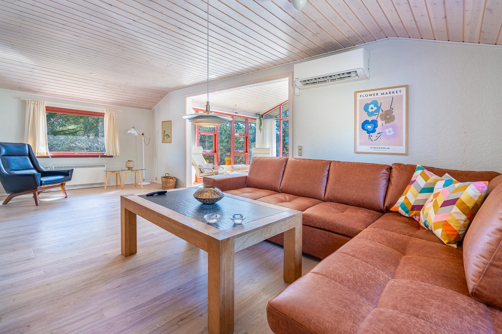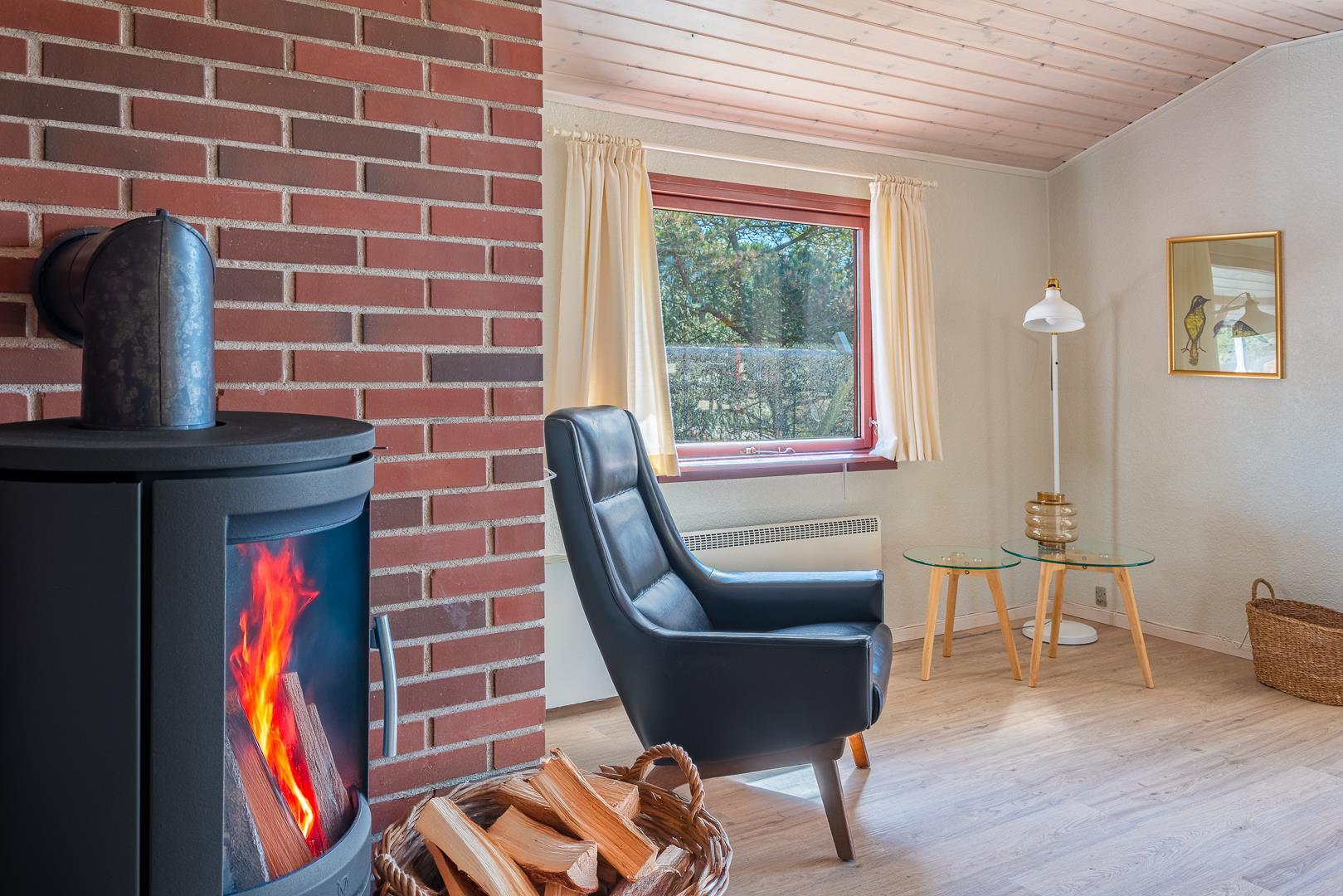 I stuen skaber brændeovnen en hyggelig stemning, og vinterhaven giver adgang til en stor terrasse, hvor man kan nyde solen eller et måltid i det fri. Den overdækkede terrasse med udsigt til hedelandskabet og Blåbjerg Plantage giver mulighed for at være ude – selv når vejret skifter.