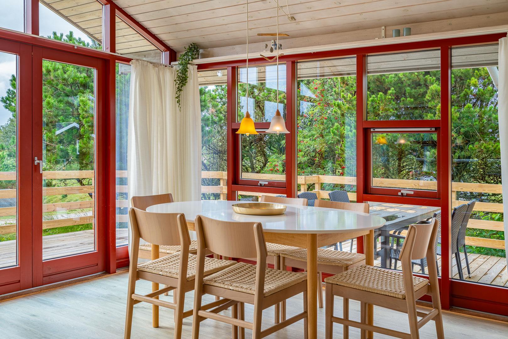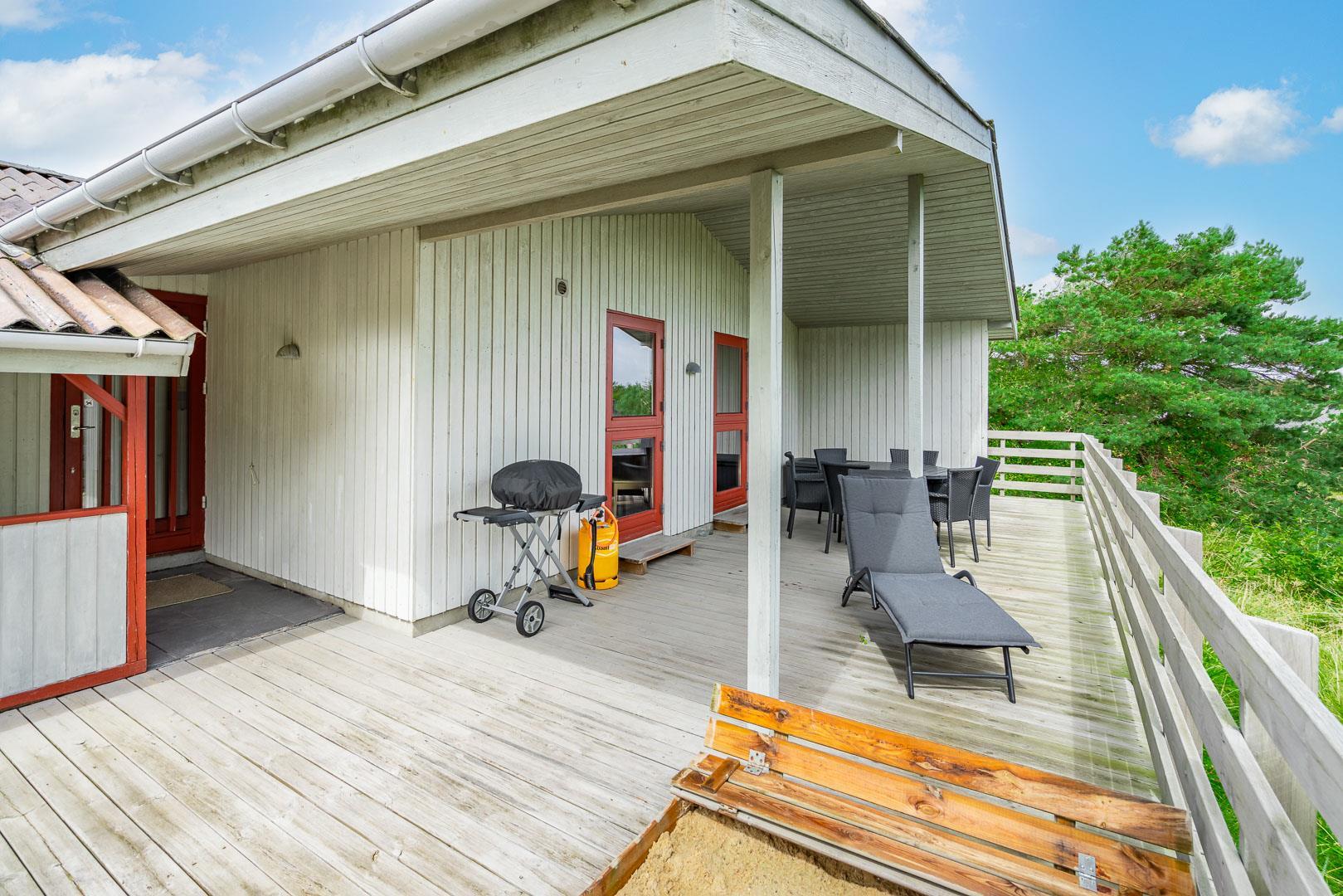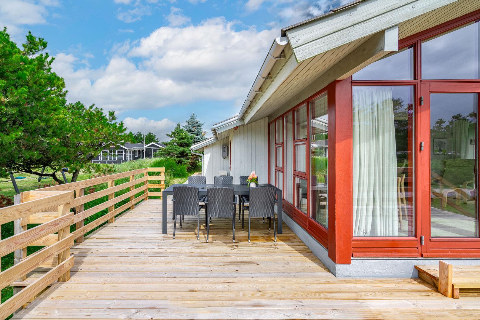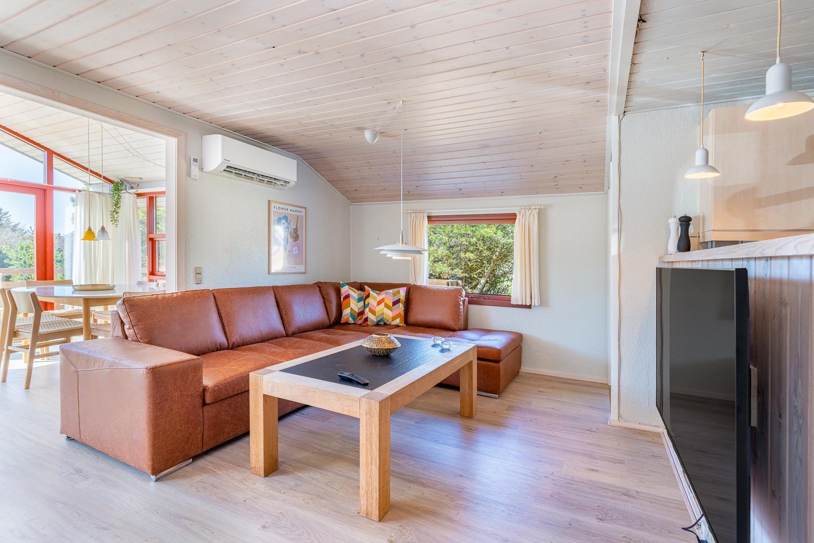 I stuen skaber brændeovnen en hyggelig stemning, og vinterhaven giver adgang til en stor terrasse, hvor man kan nyde solen eller et måltid i det fri. Den overdækkede terrasse med udsigt til hedelandskabet og Blåbjerg Plantage giver mulighed for at være ude – selv når vejret skifter.