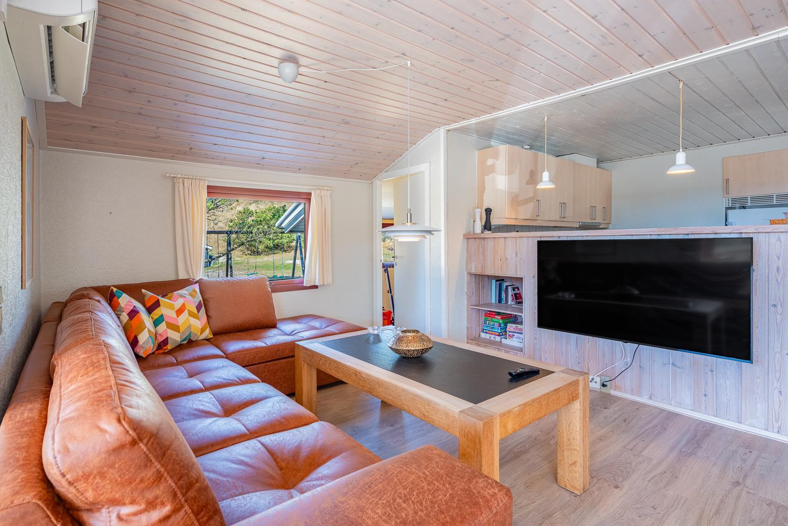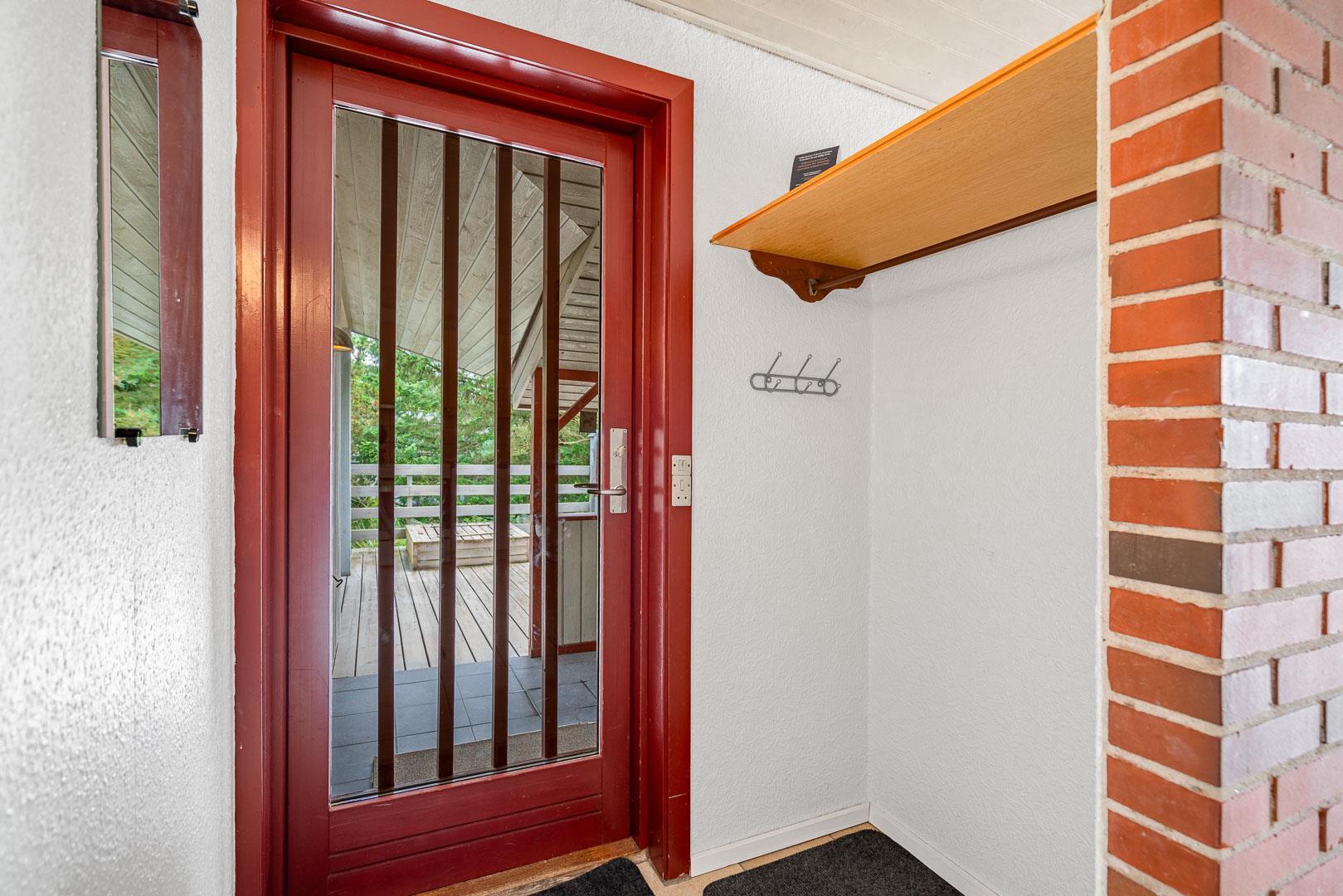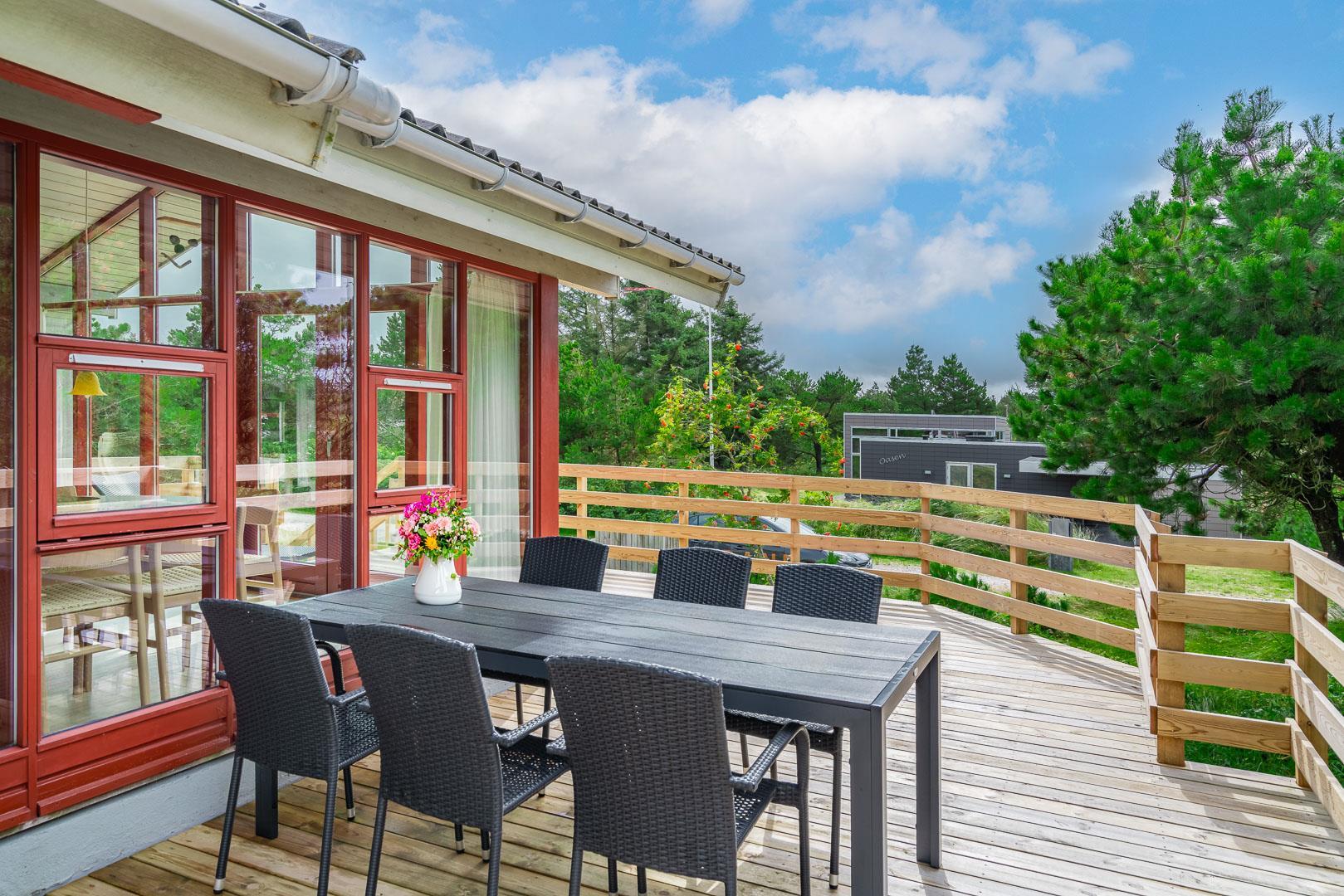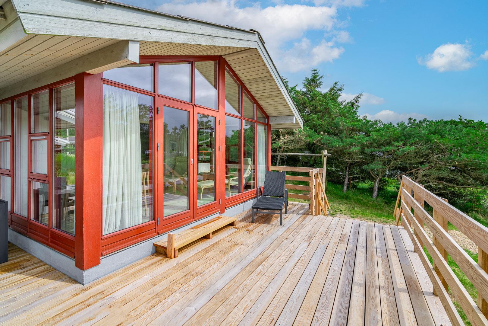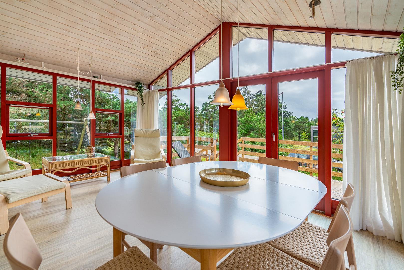 I stuen skaber brændeovnen en hyggelig stemning, og vinterhaven giver adgang til en stor terrasse, hvor man kan nyde solen eller et måltid i det fri. Den overdækkede terrasse med udsigt til hedelandskabet og Blåbjerg Plantage giver mulighed for at være ude – selv når vejret skifter.