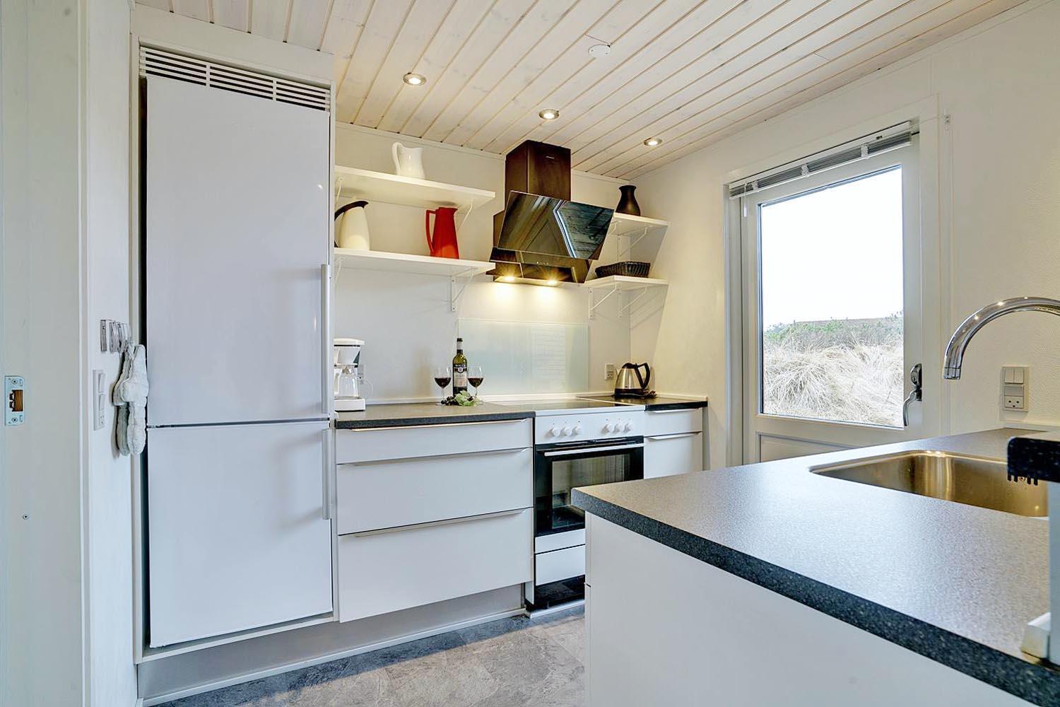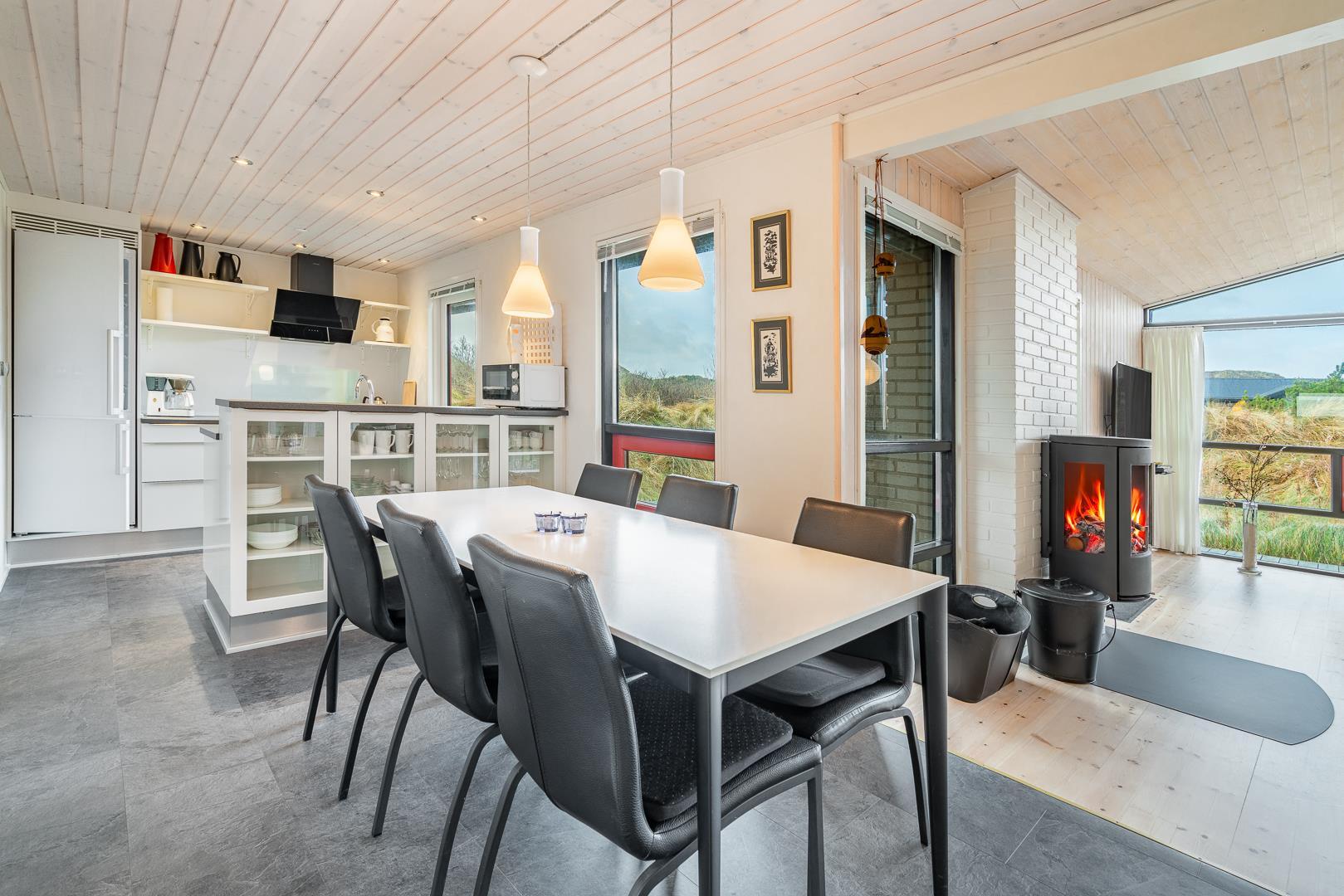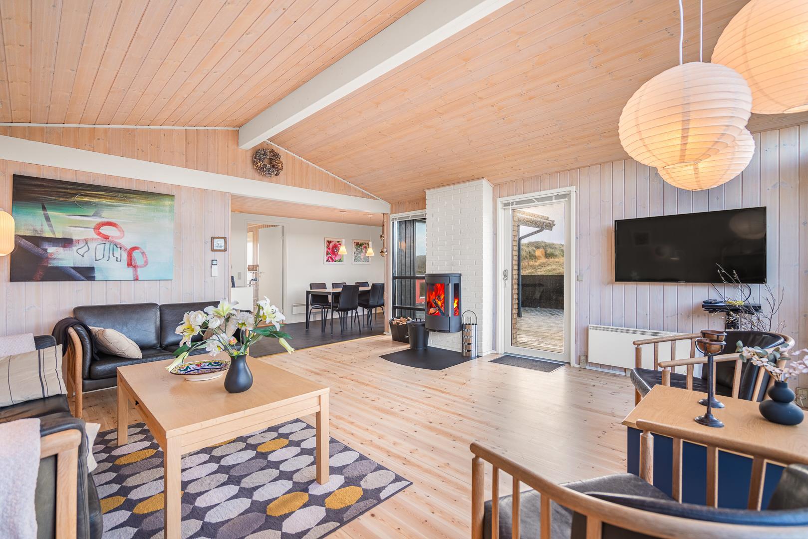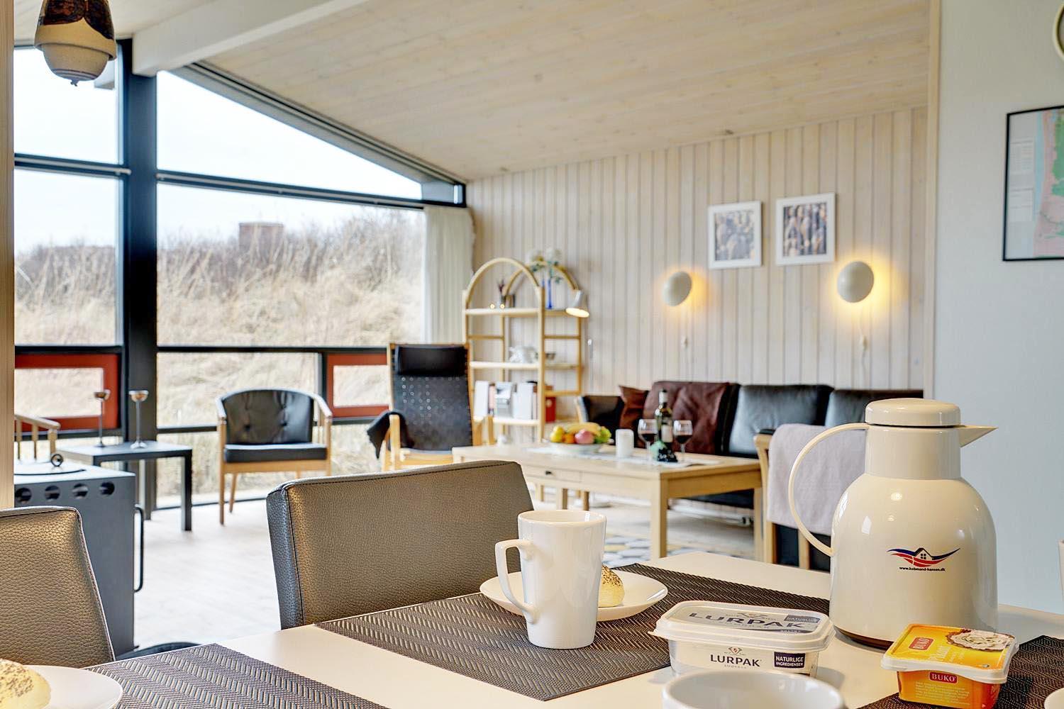 På en skøn og ugeneret klitgrund ligger dette dejlige feriehus. Rummelig stue med trægulv og stort vinduesparti som giver et godt lysindfald i huset. Fra stuen eller den ugenerede terrasse kan den skønne udsigt over klitterne nydes. Der er godt køkken som ligger i åben forbindelse med stuen.