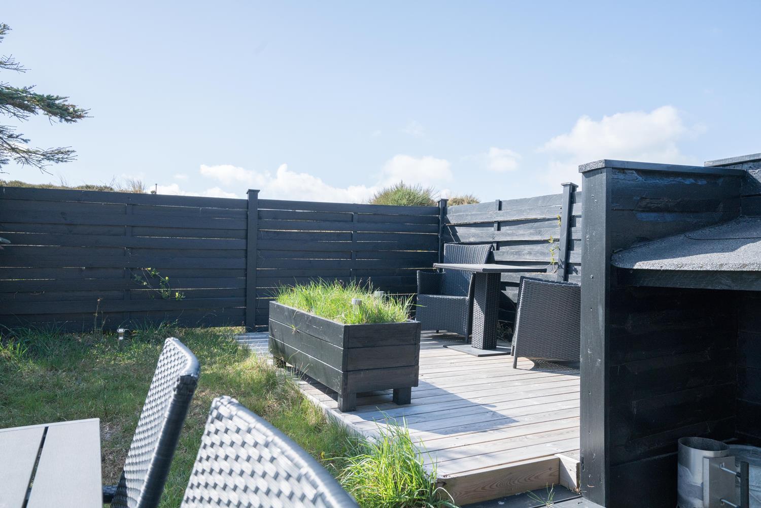 Udenfor venter en dejlig naturgrund med fri udsigt over klitterne. På den afskærmede terrasse kan du nyde morgenkaffen, solbade eller afslutte dagen til lyden af Vesterhavets brusen.