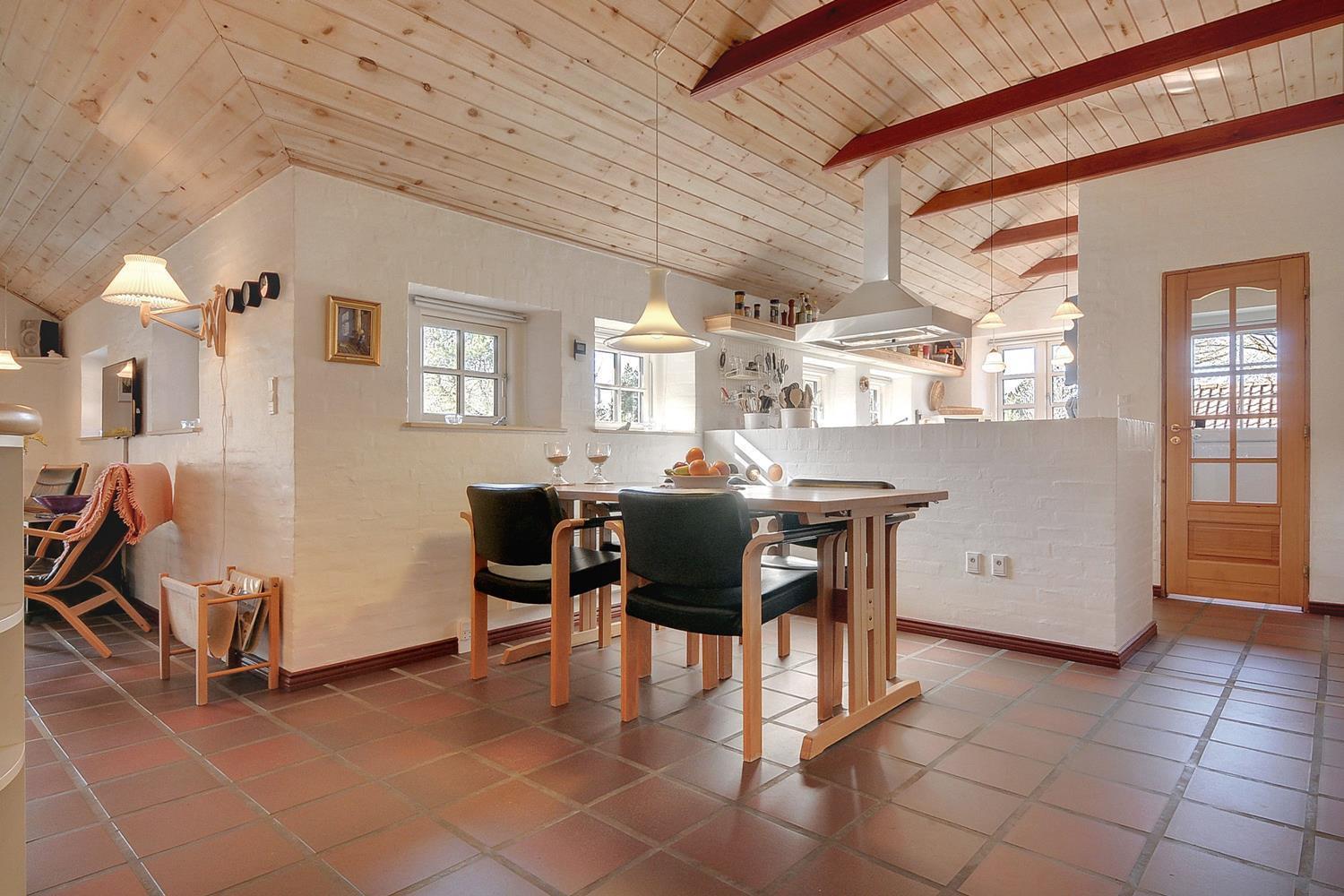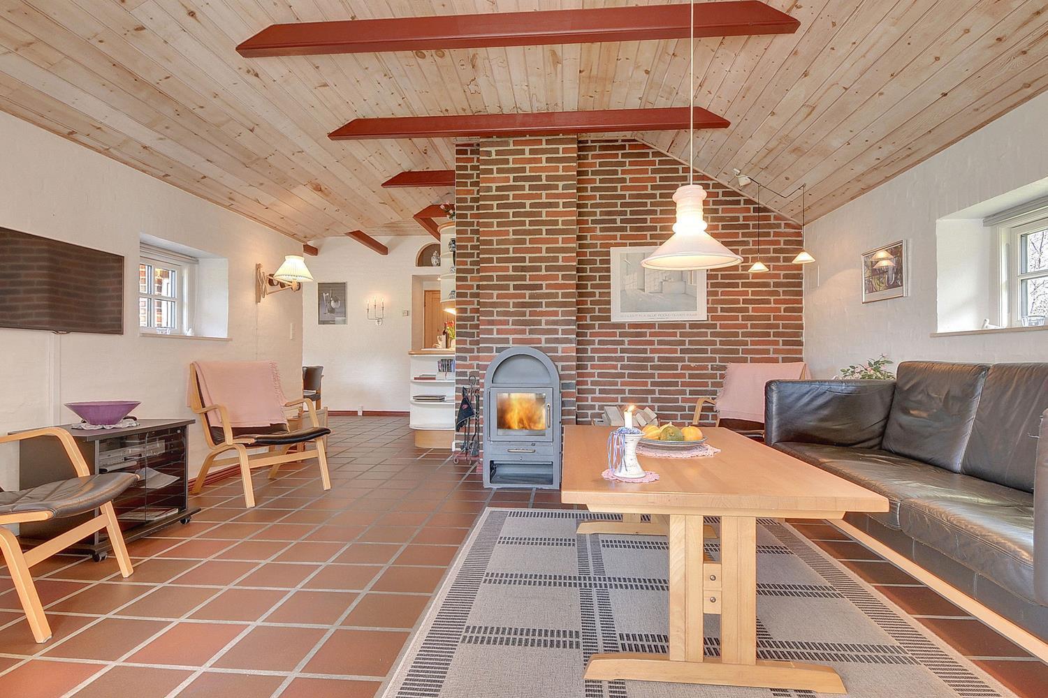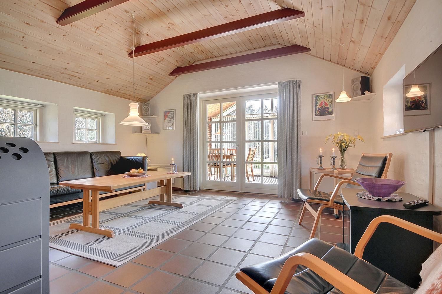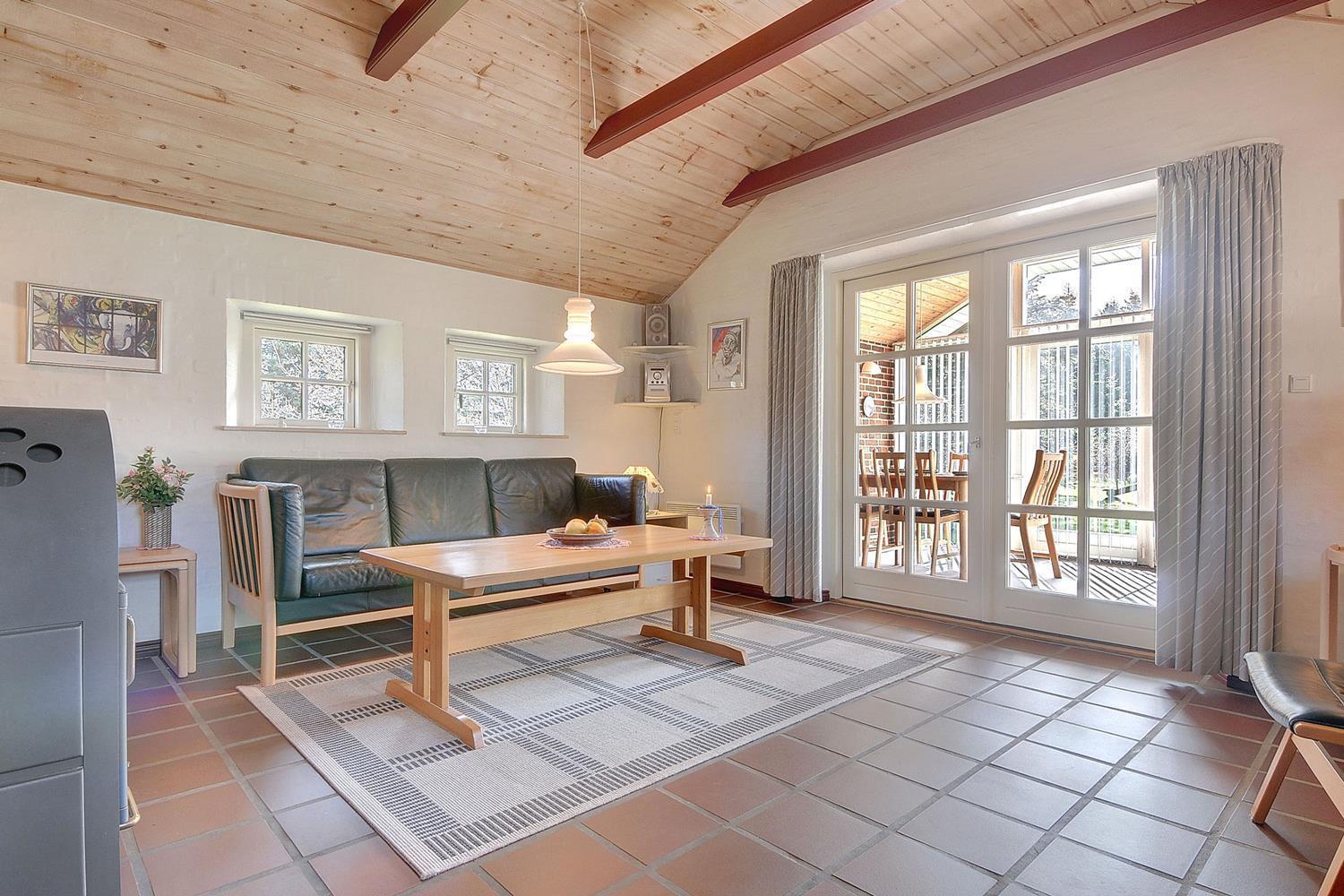 Stuen er lys og venlig med åben forbindelse til køkkenet. Her kan I samles efter en aktiv dag, tænde op i brændeovnen og nyde den rolige atmosfære. En moderne varmepumpe sørger for et behageligt indeklima året rundt.