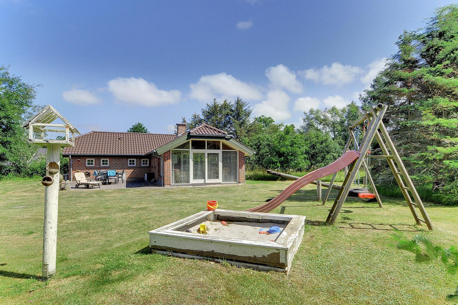 For børnene er haven et lille paradis med gynge og sandkasse, mens de voksne kan slappe af med en kop kaffe og duften af fyrretræer i luften. Hunden vil også trives med masser af plads at boltre sig på.