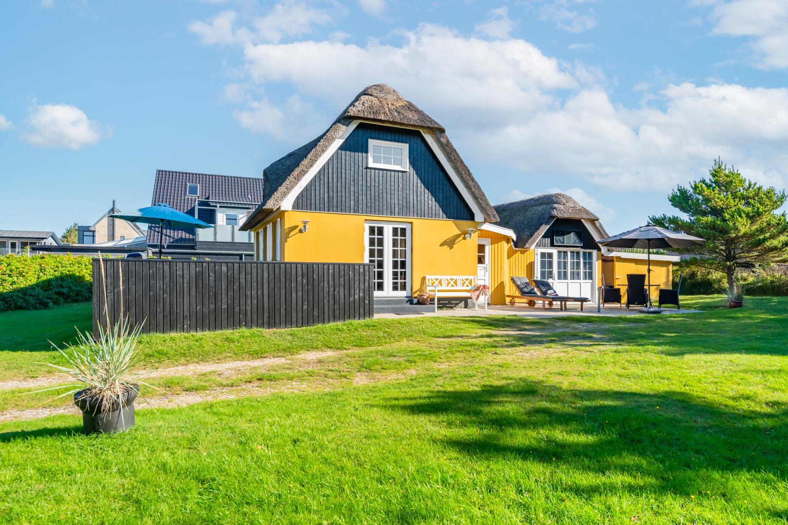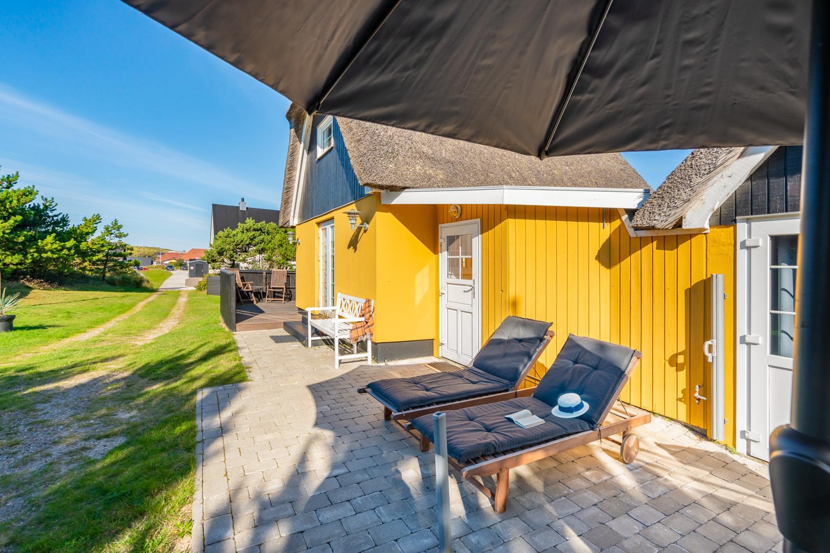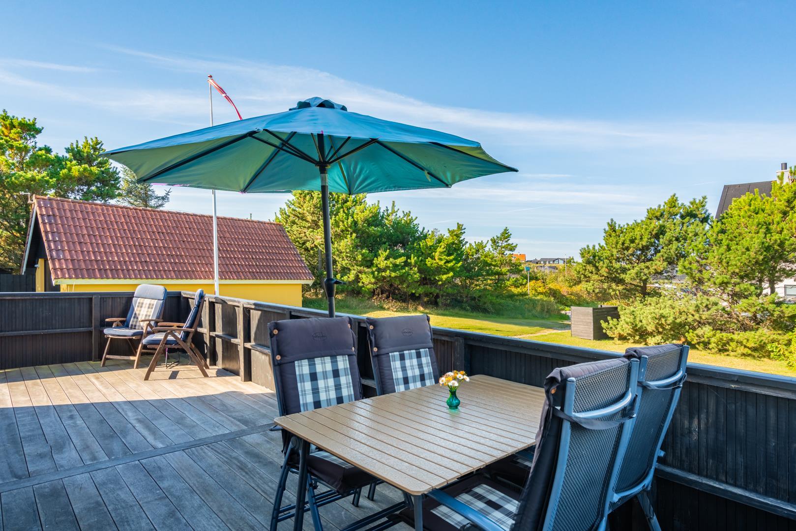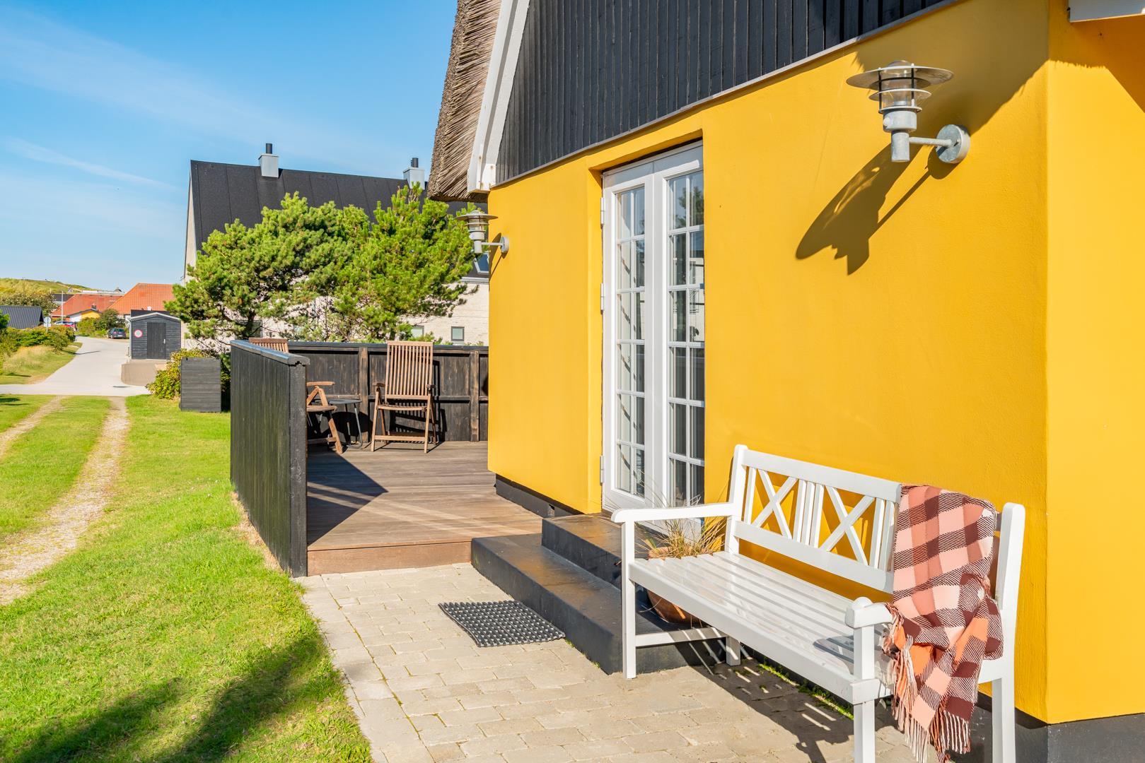 Ældre, men hyggeligt og velholdt feriehus beliggende på en stor naturgrund et minuts gang fra Henne Strands butikker og caféer. Huset er pænt indrettet med gode møbler, entre/udestue med god plads til sko og overtøj og her er der også en lille spiseplads. Der nyt dejligt køkken med induktionsplader og indbygningsovn. På 1 sal finder man husets 2 soverum med dobbeltsenge - trappen er stejl op til 1 salen. Der er flere gode terrasser ved huset og på grunden er der god plads til leg og spil. Et dejligt sommerhus til et par eller den lille familie, det er også tilladt at tage hunden med.