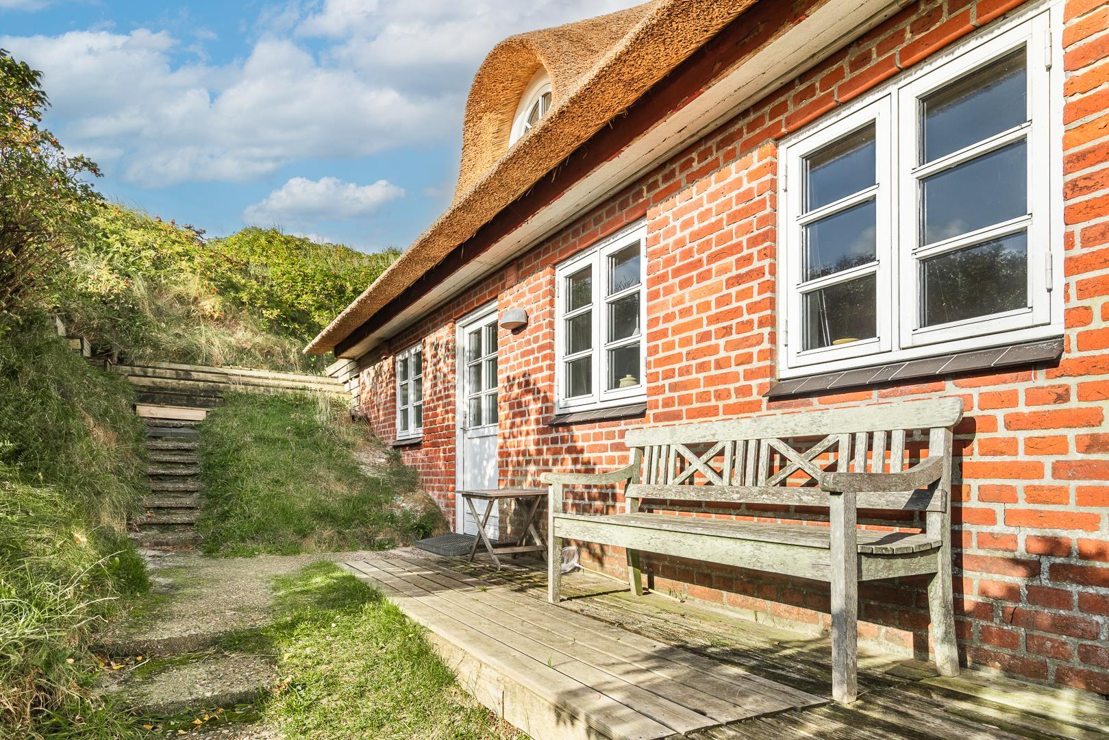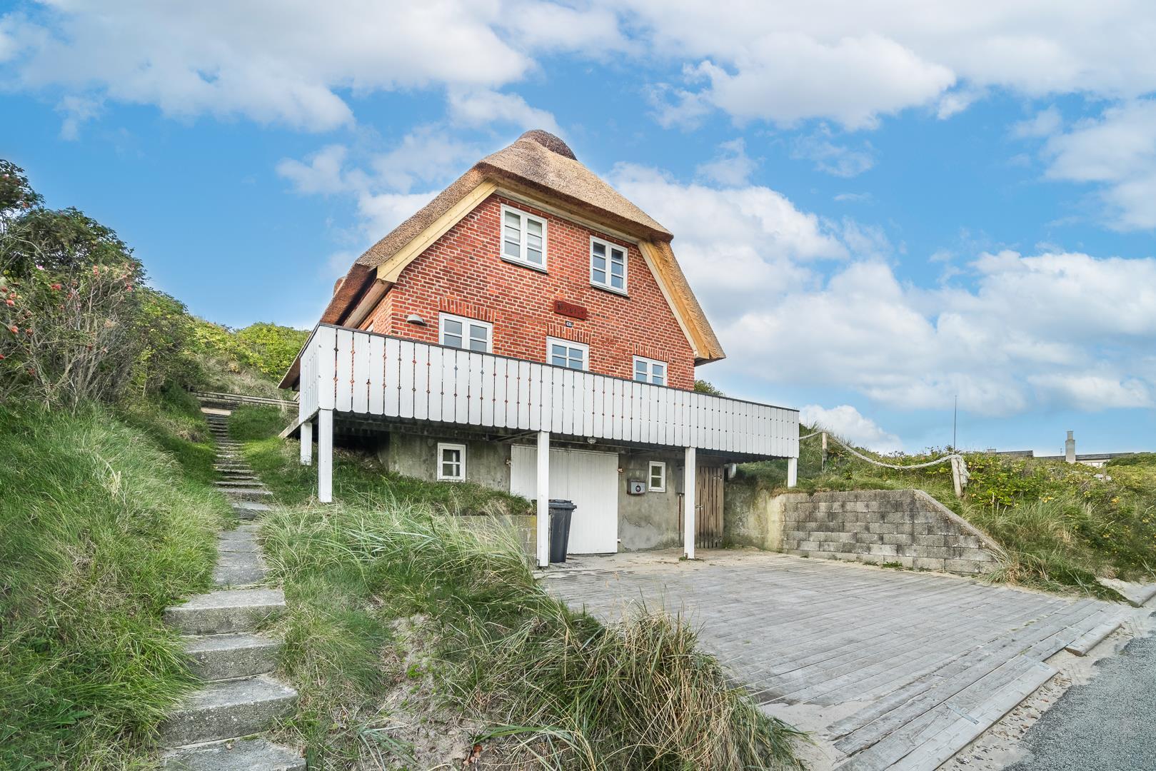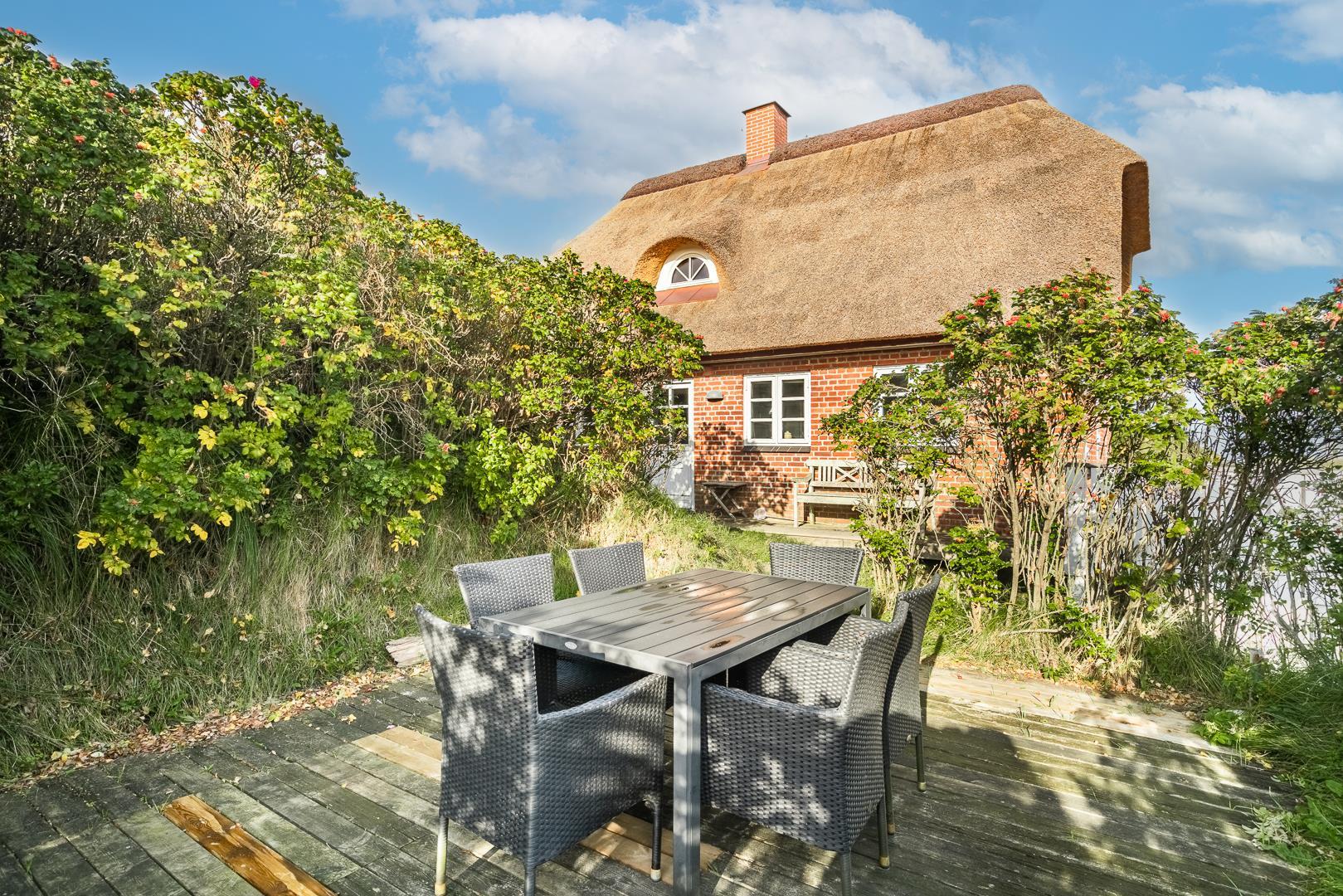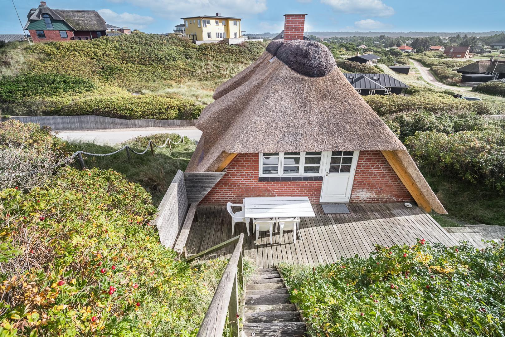 På en kuperet klitgrund ligger dette meget charmerende sommerhus med stråtag og med kun få minutters gang fra Vesterhavet og Henne Strands centrum.