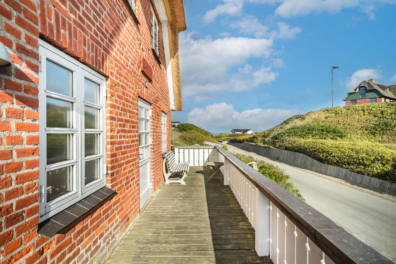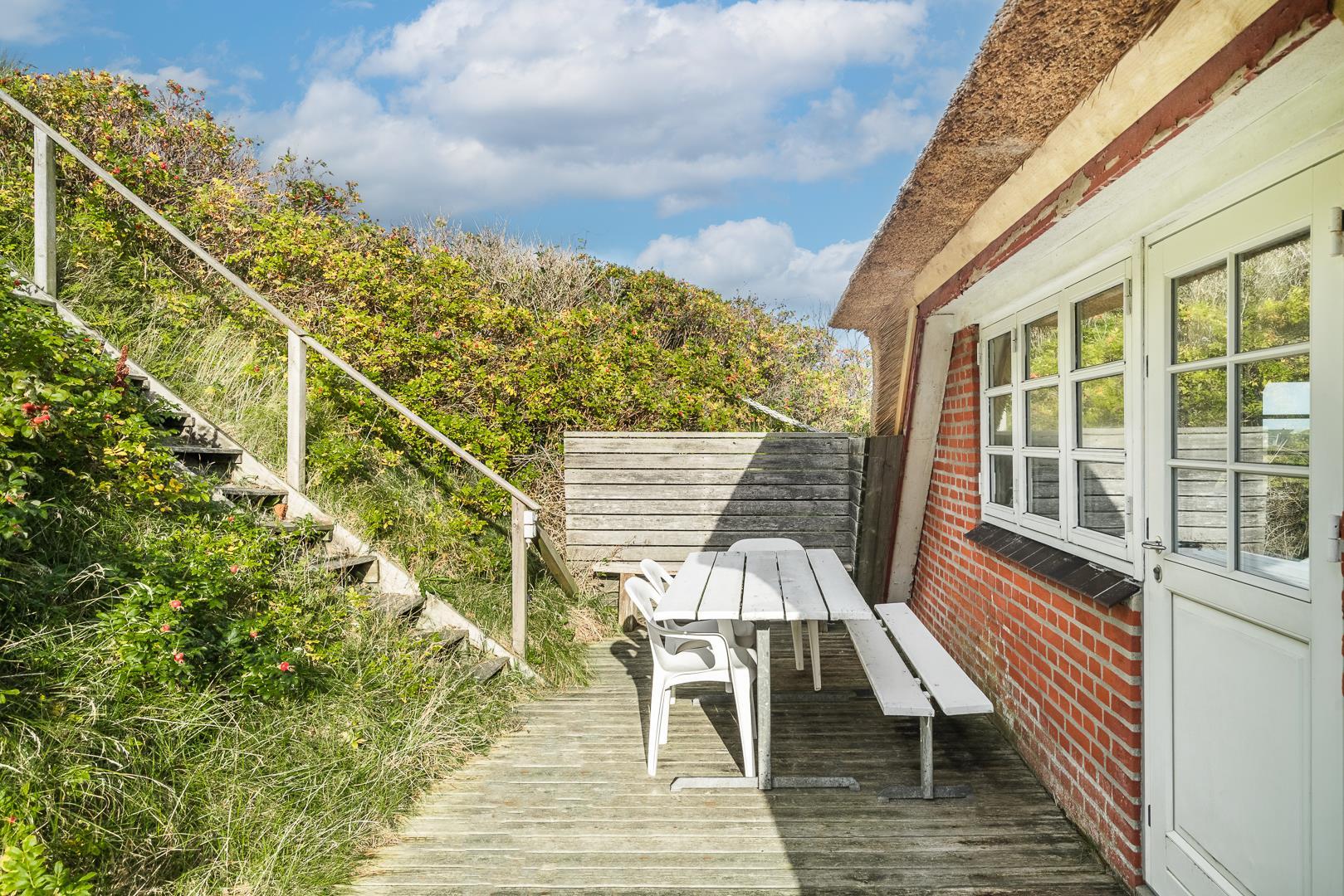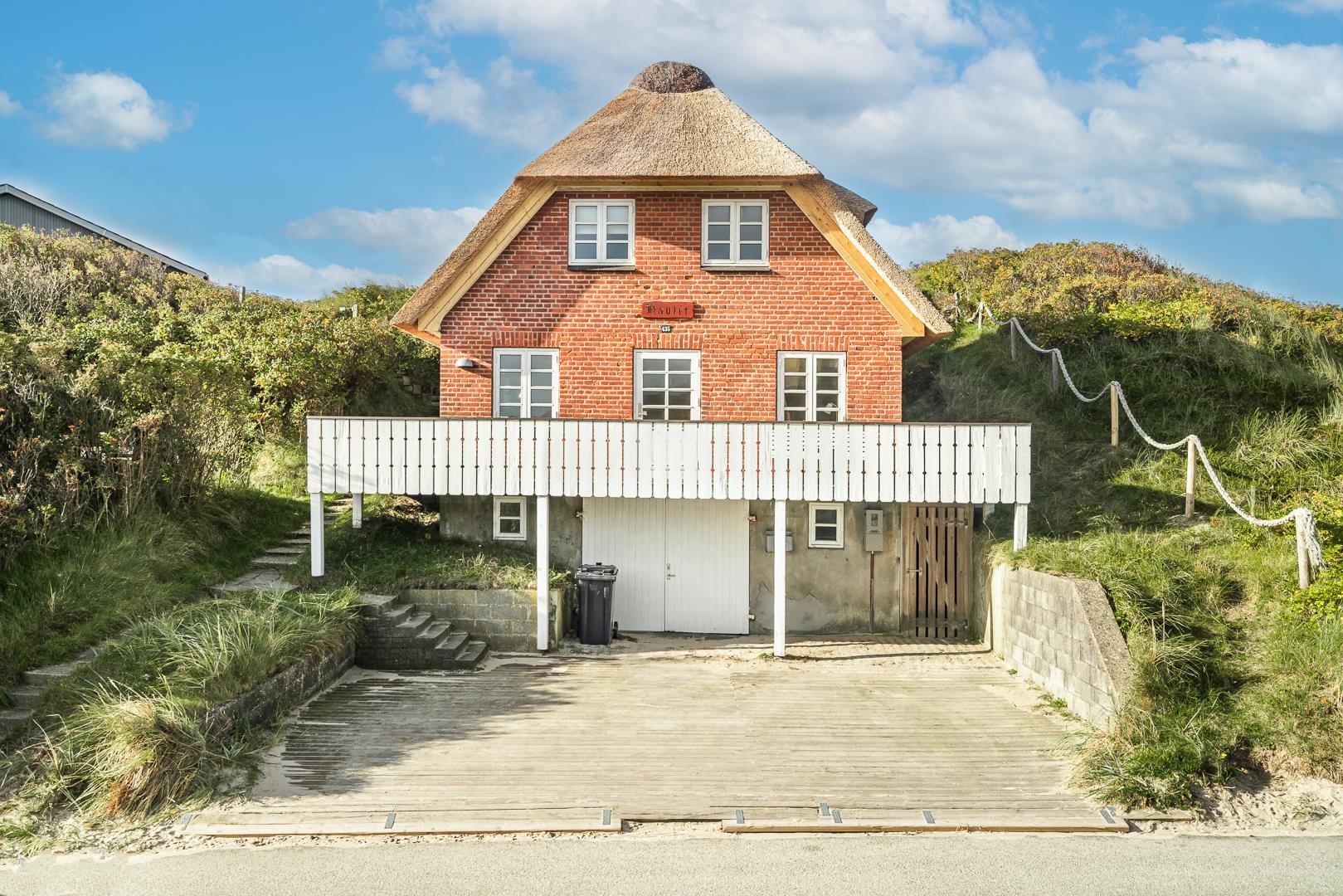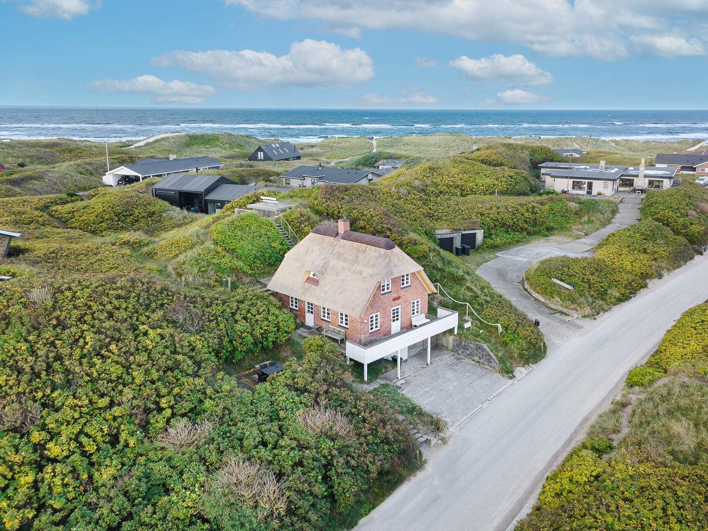 På en kuperet klitgrund ligger dette meget charmerende sommerhus med stråtag og med kun få minutters gang fra Vesterhavet og Henne Strands centrum.