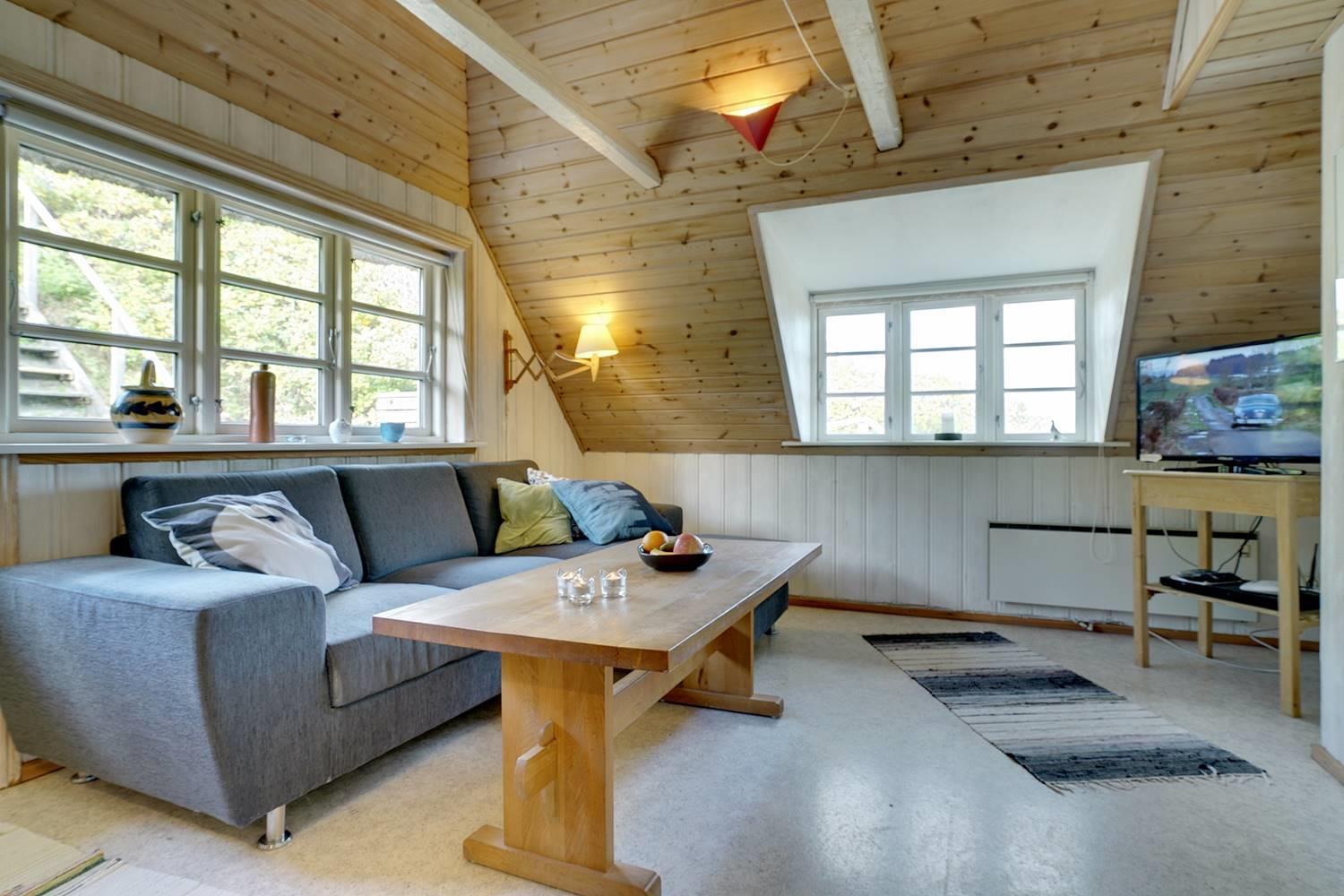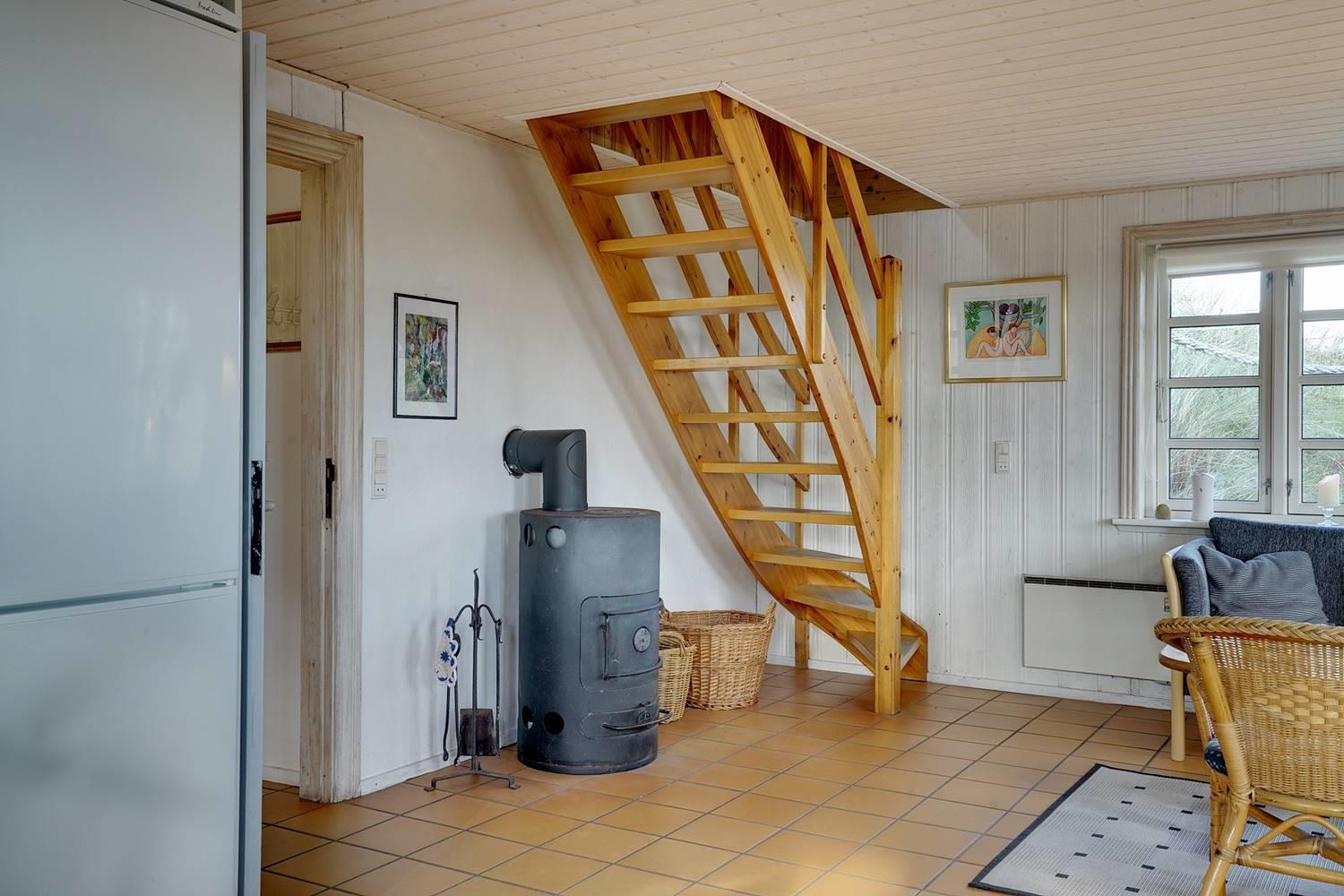 Der er stort køkken/alrum med klinkegulv og brændeovn og på 1. sal er der TV-stue, toilet og gode 2 soverum.
