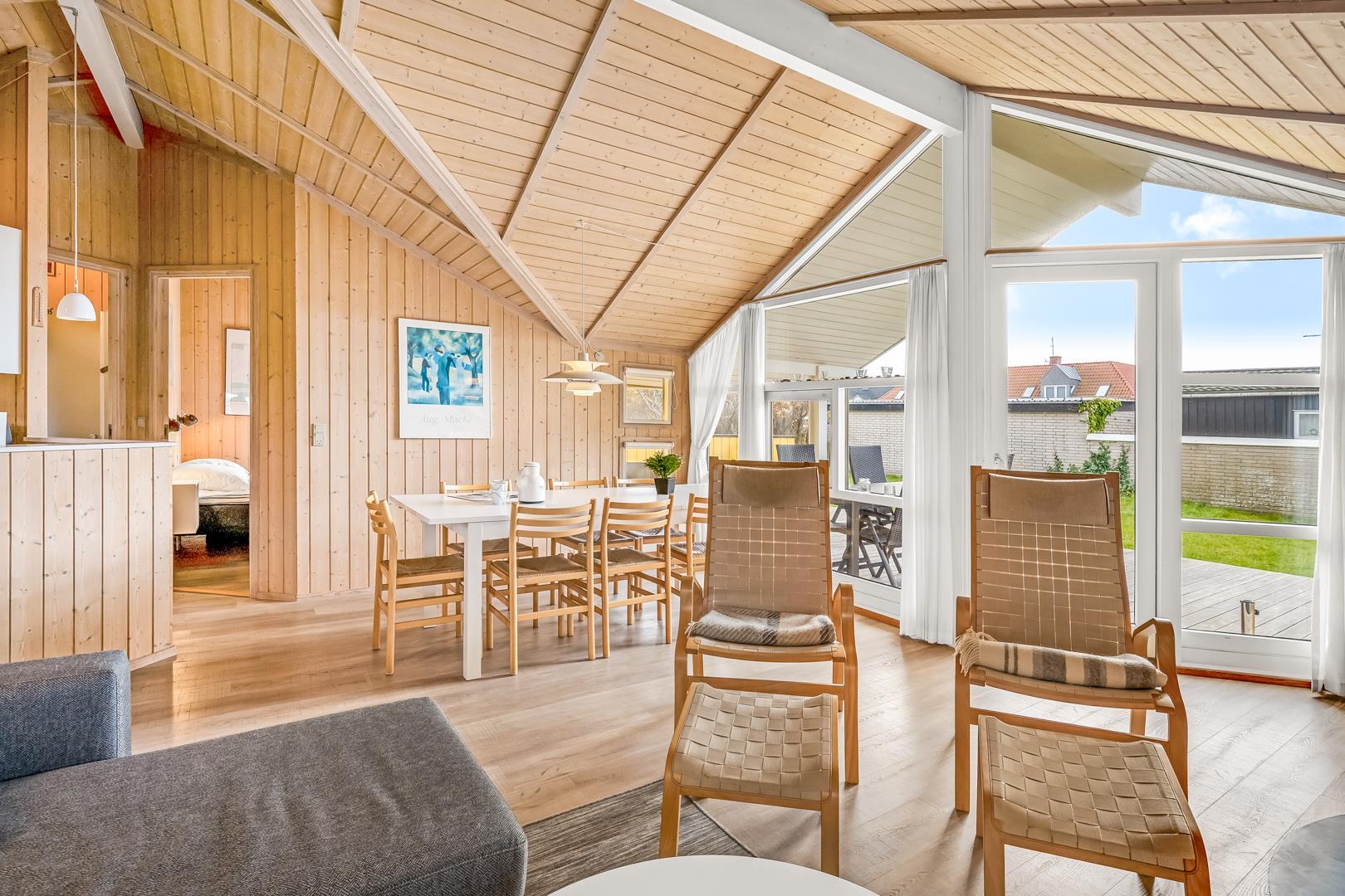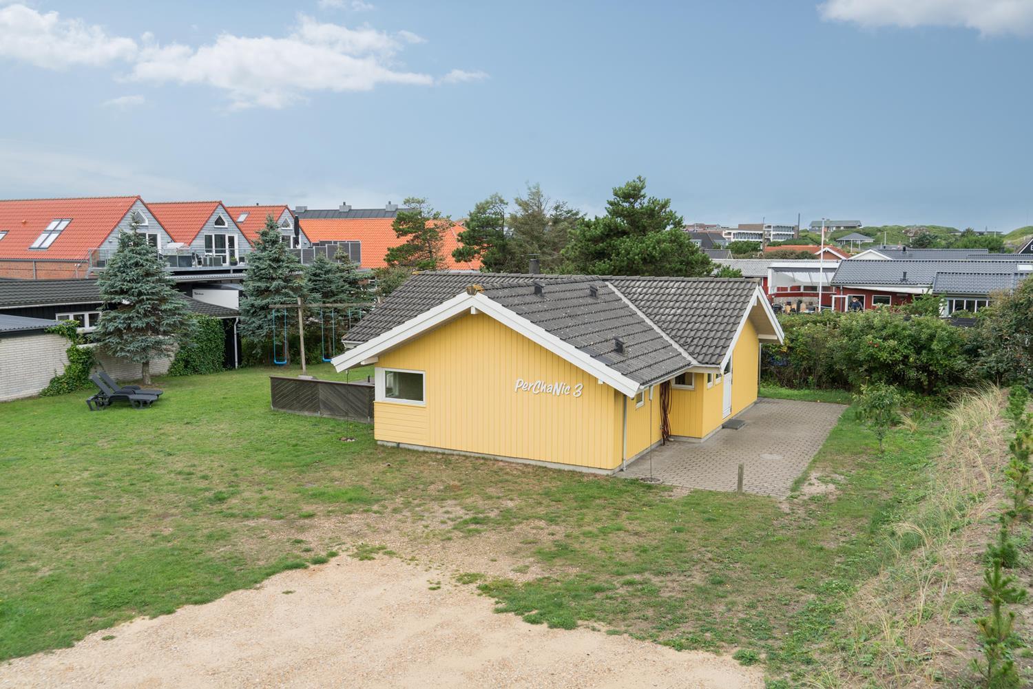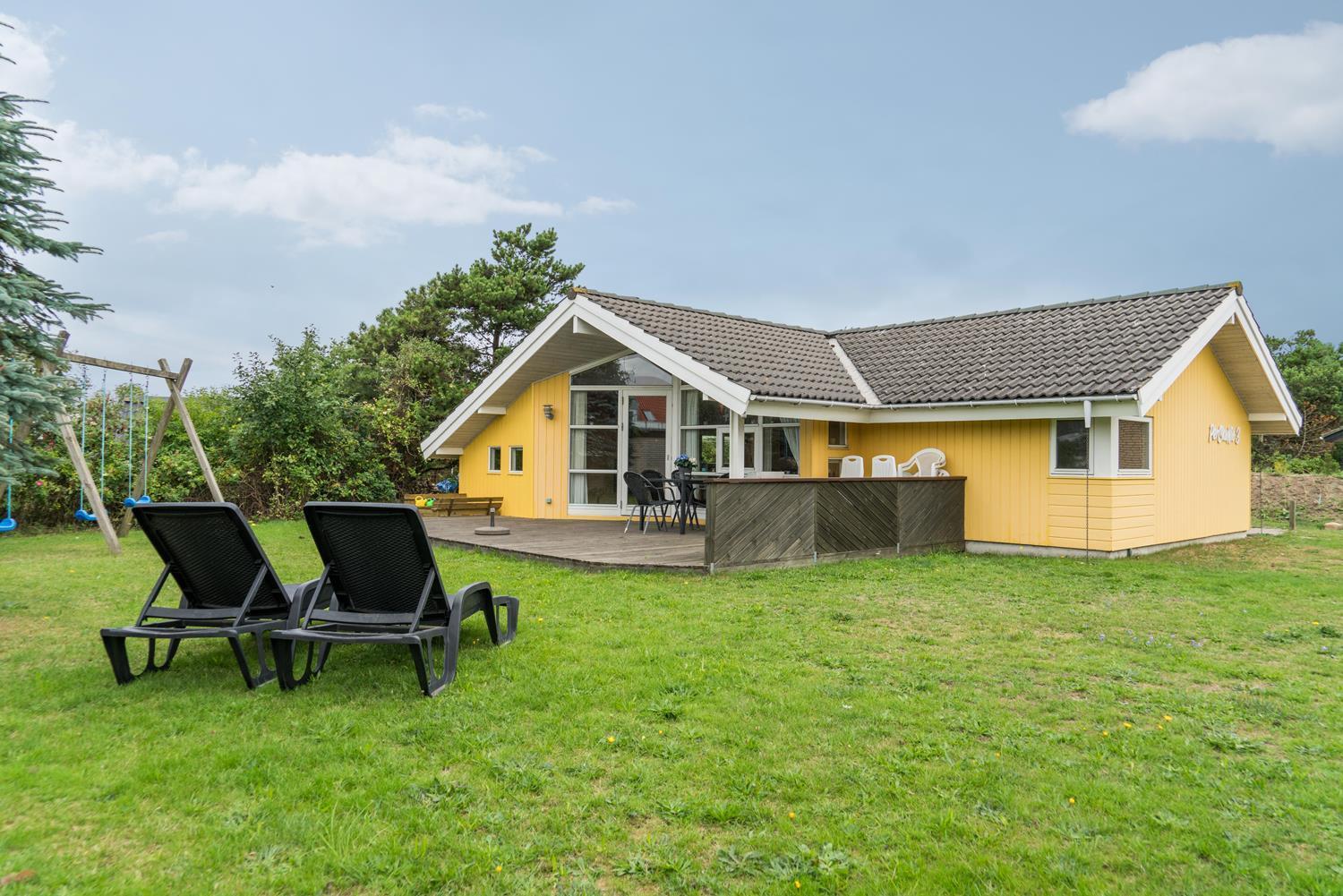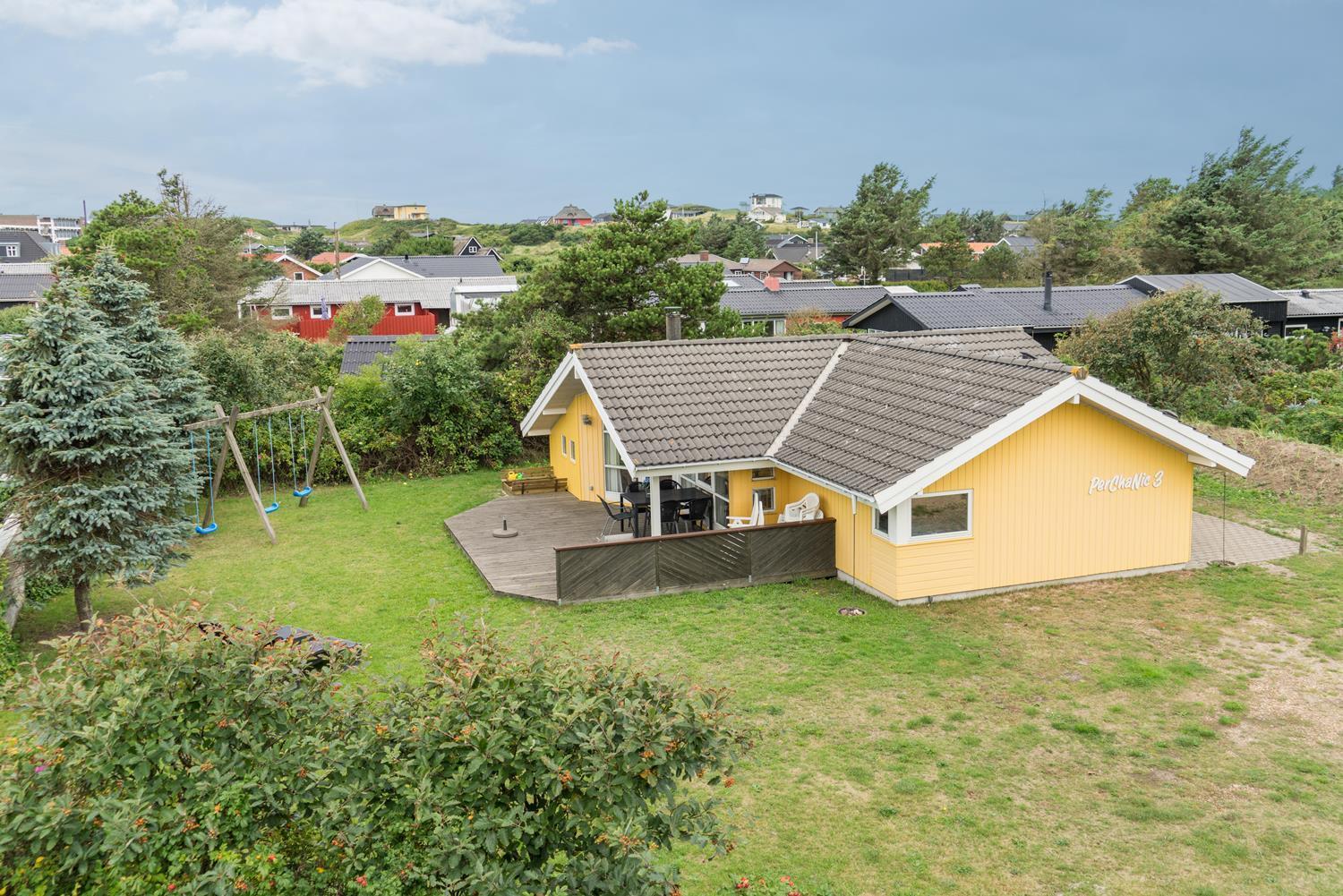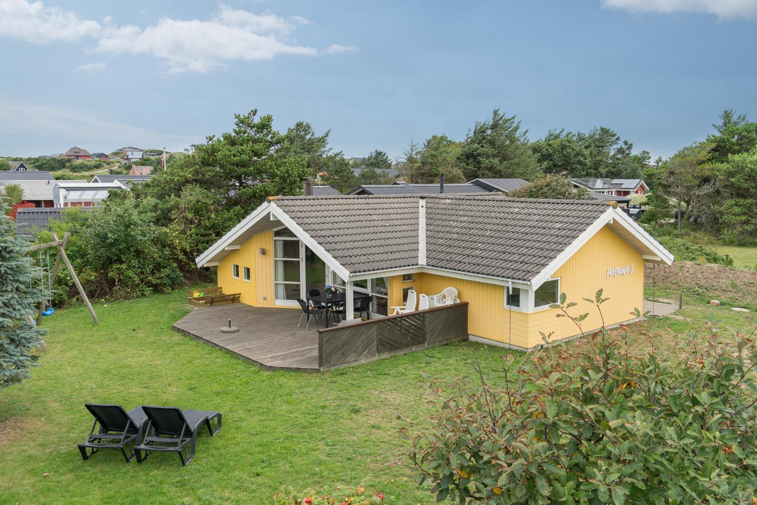På en børnevenlig naturgrund tæt ved Henne Strand´s centrum ligger dette meget velholdte feriehus. Huset er indrettet med gode møbler og senge. Det flotte køkken ligger i åben forbindelse med stuen. Det store vinduesparti give et godt lysindfald i stuen. Dejlig træterrasse som er delvis overdækket.