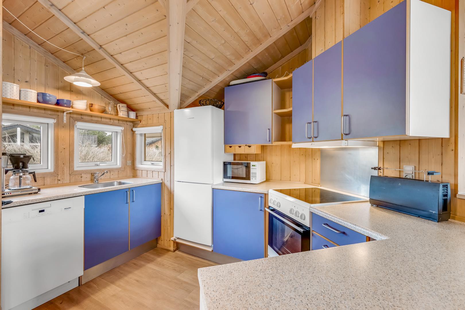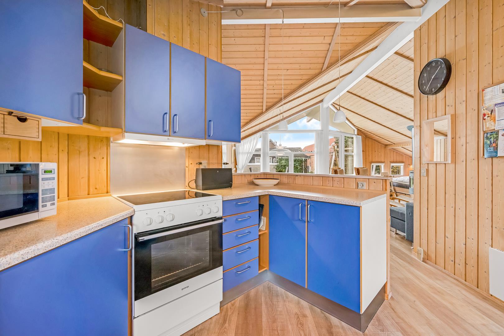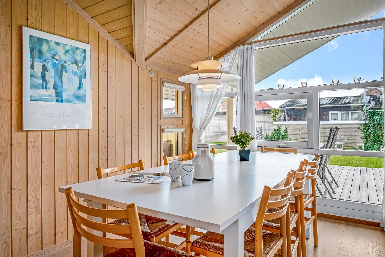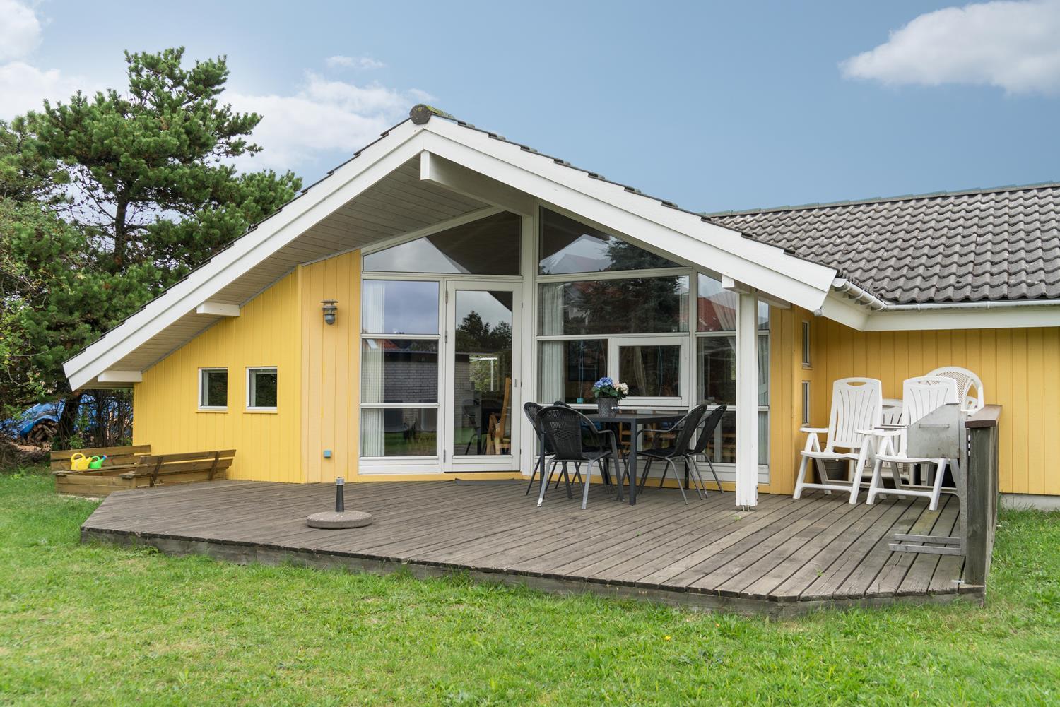 På en børnevenlig naturgrund tæt ved Henne Strand´s centrum ligger dette meget velholdte feriehus. Huset er indrettet med gode møbler og senge. Det flotte køkken ligger i åben forbindelse med stuen. Det store vinduesparti give et godt lysindfald i stuen. Dejlig træterrasse som er delvis overdækket.
