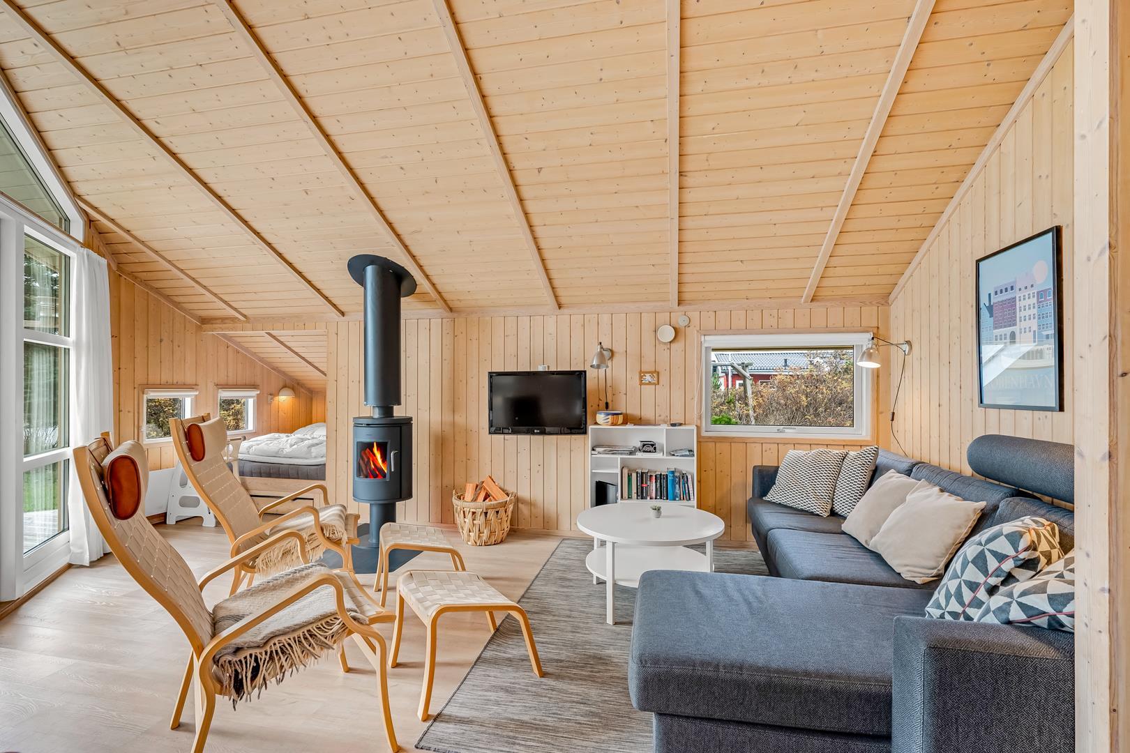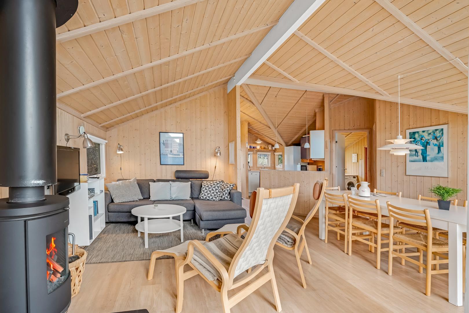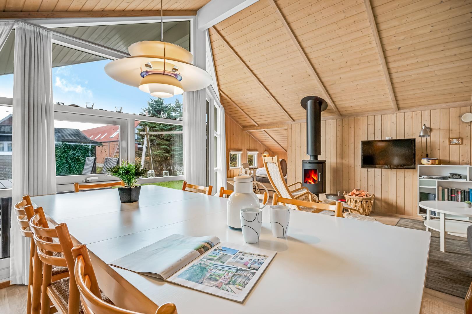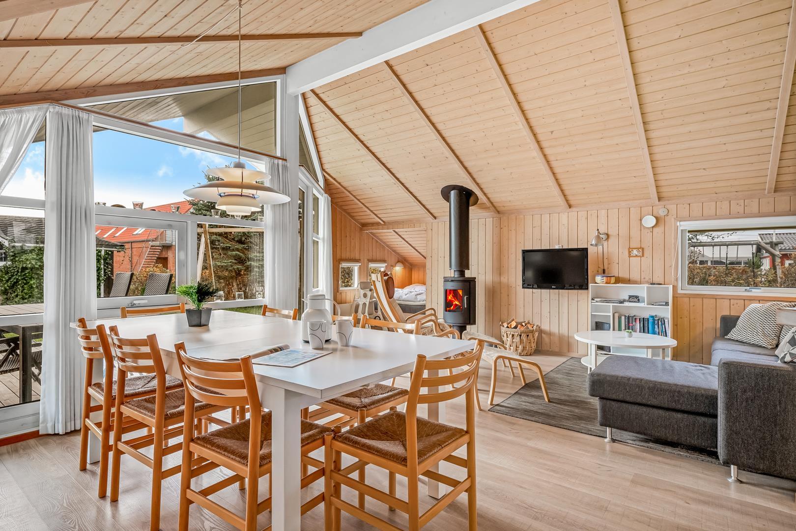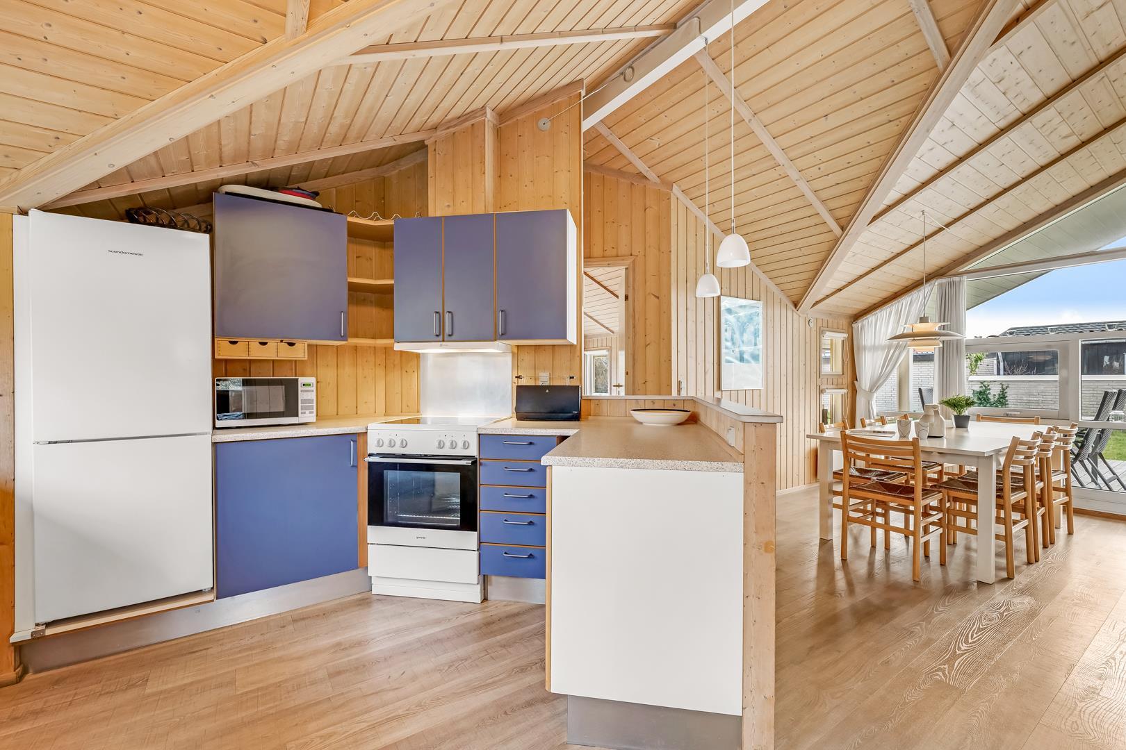 På en børnevenlig naturgrund tæt ved Henne Strand´s centrum ligger dette meget velholdte feriehus. Huset er indrettet med gode møbler og senge. Det flotte køkken ligger i åben forbindelse med stuen. Det store vinduesparti give et godt lysindfald i stuen. Dejlig træterrasse som er delvis overdækket.