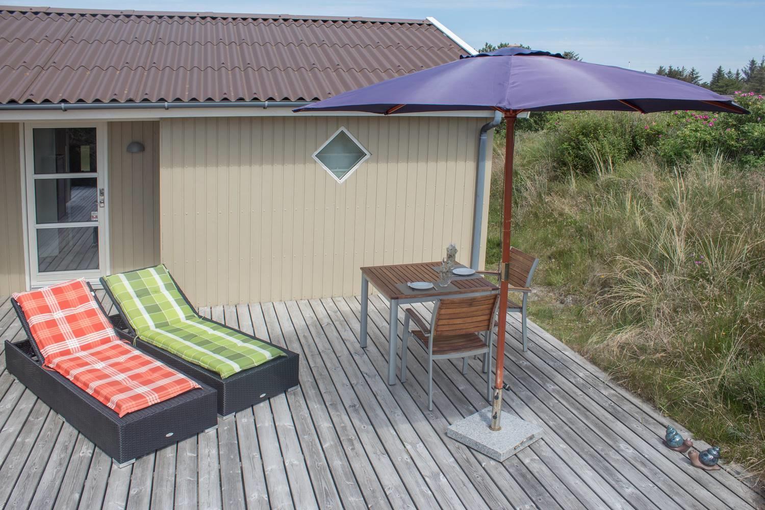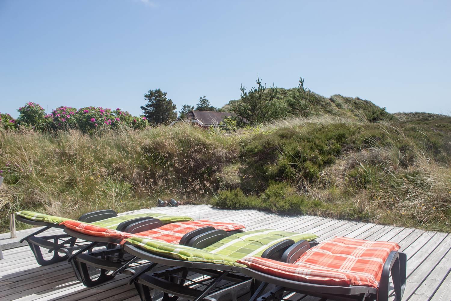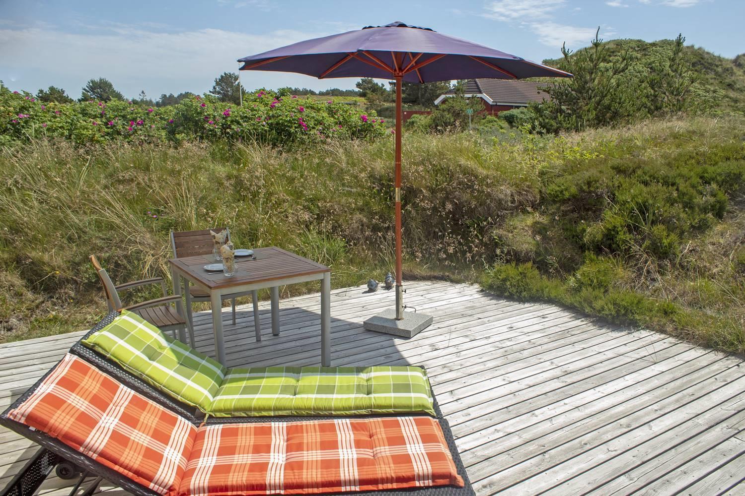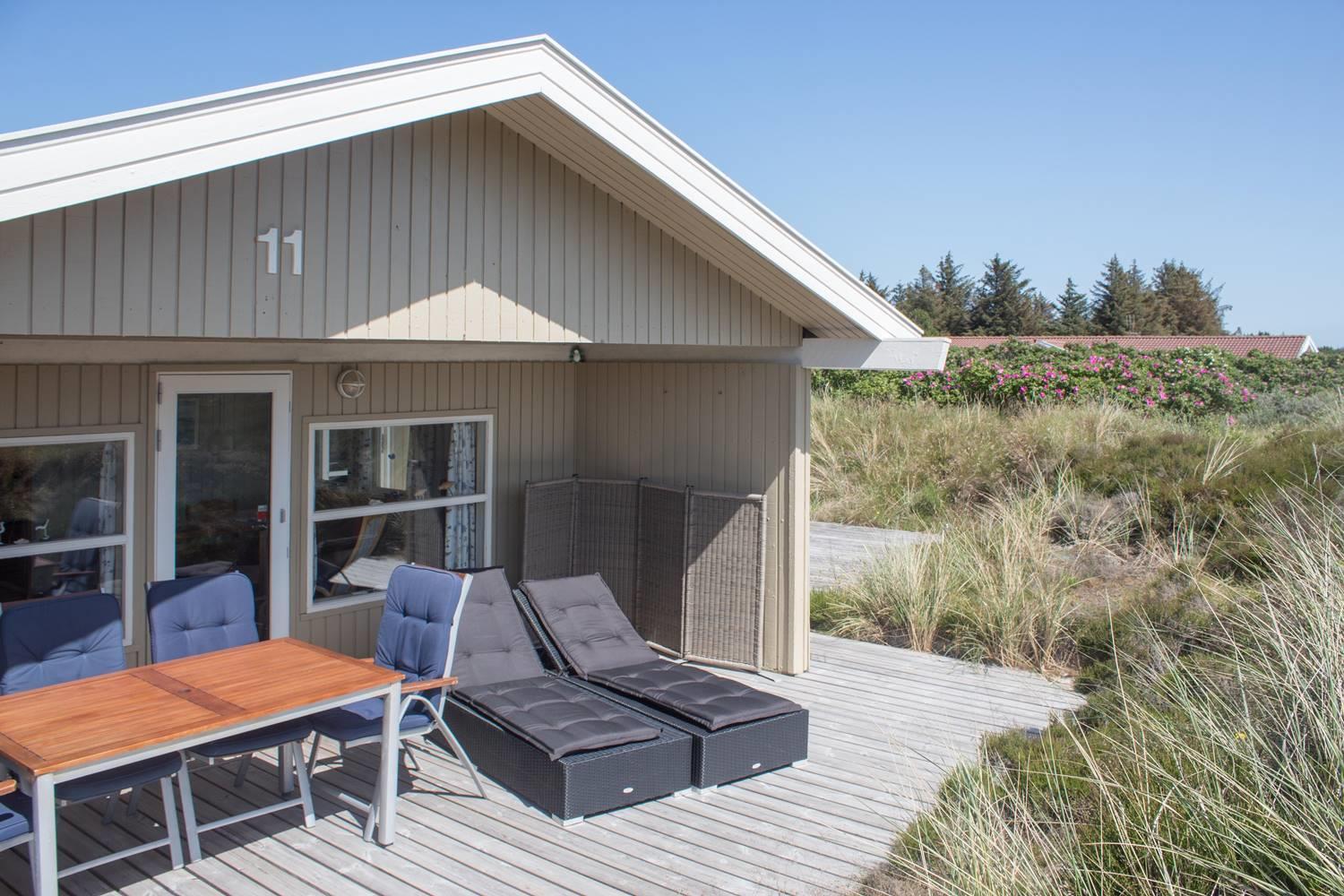 Hyggeligt feriehus i Henne Strand med sauna, spabad og store terrasser tæt på klitområder.