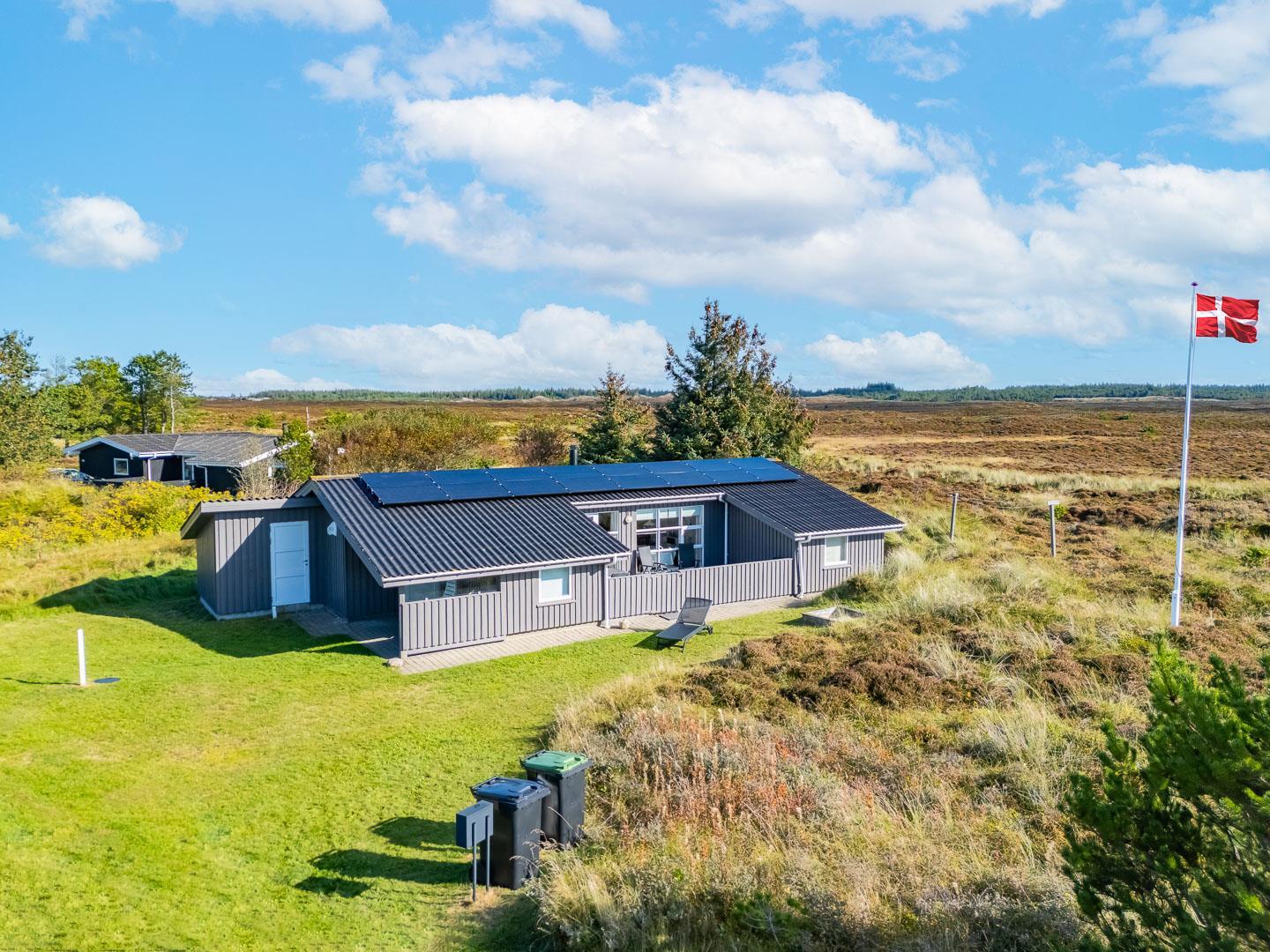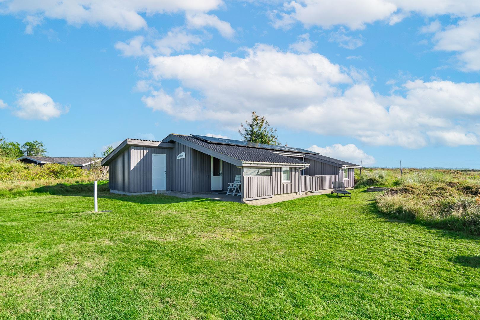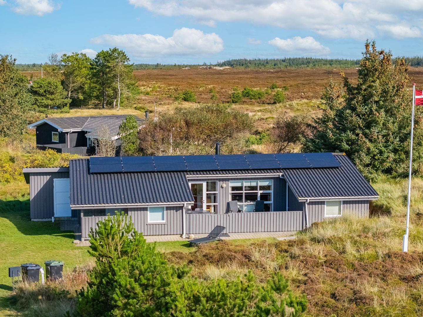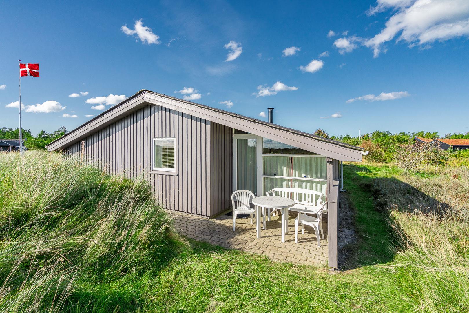 Hyggeligt feriehus beliggende på en stor, let kuperet natur-/klitgrund direkte ud til fredede arealer. Til huset hører helt lukket samt overdækket terrasse. Badeværelse med sauna. Veludstyret køkken med bl.a. opvaskemaskine og mikrobølgeovn. Stuen er hyggelig indrettet med gode møbler. 3 gode soverum. Der findes bla. barnestol, børnebadekar og puslebord samt sandkasse.