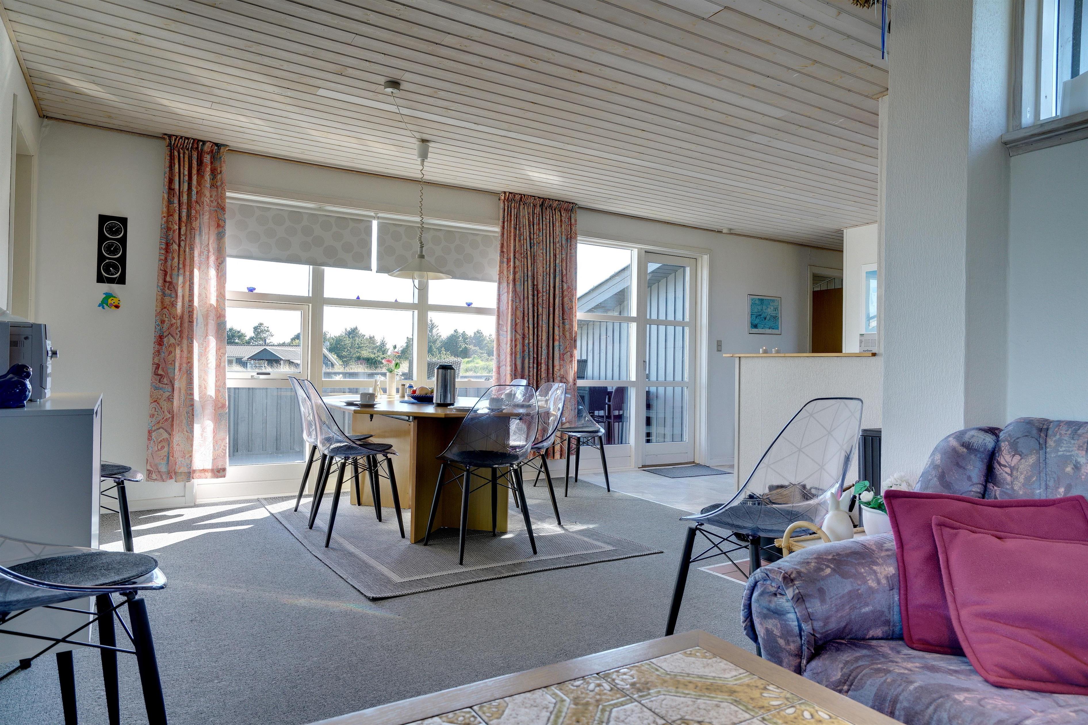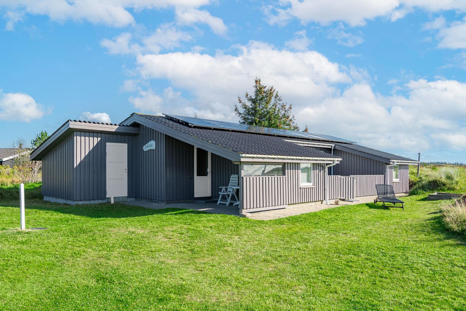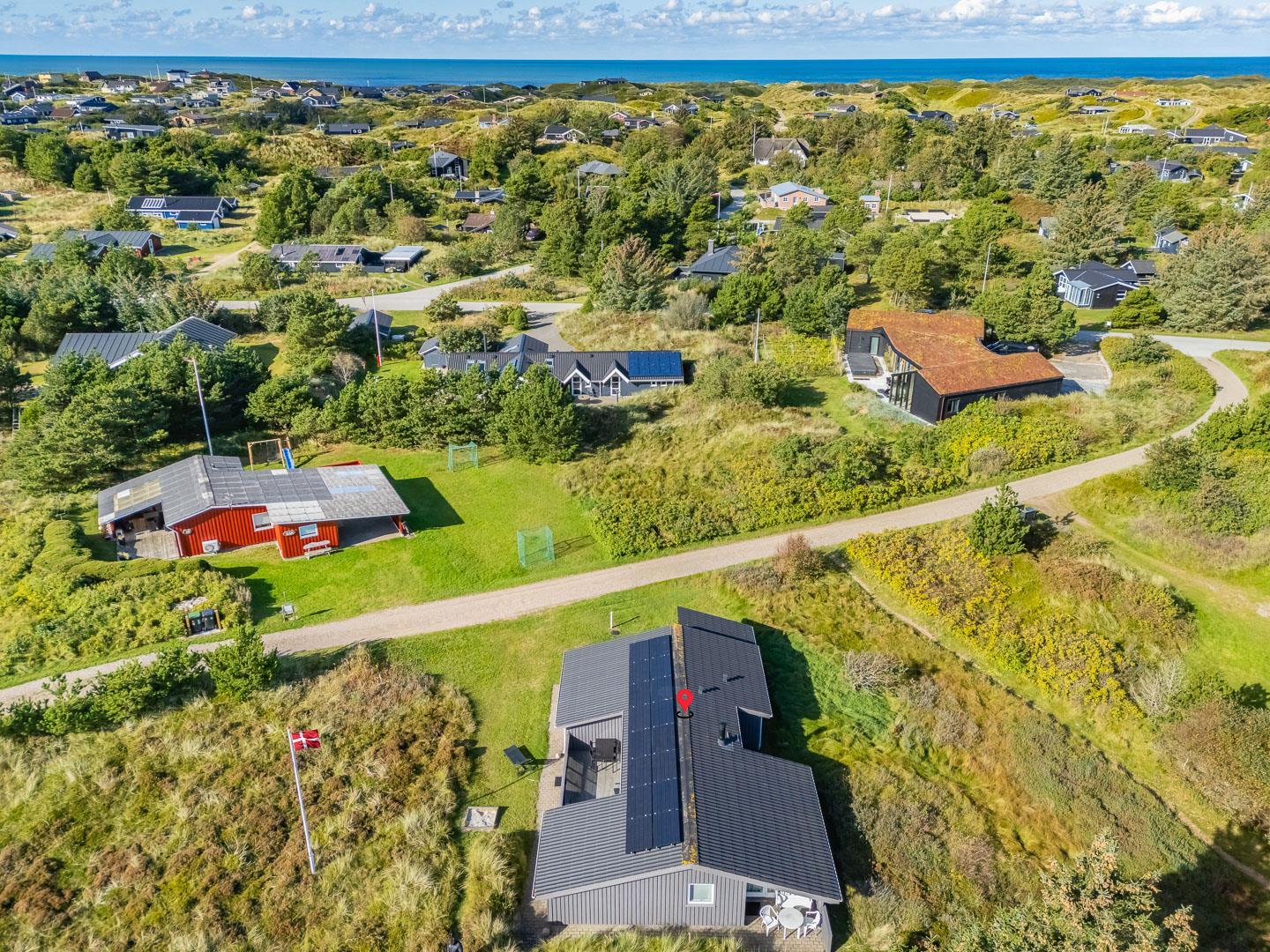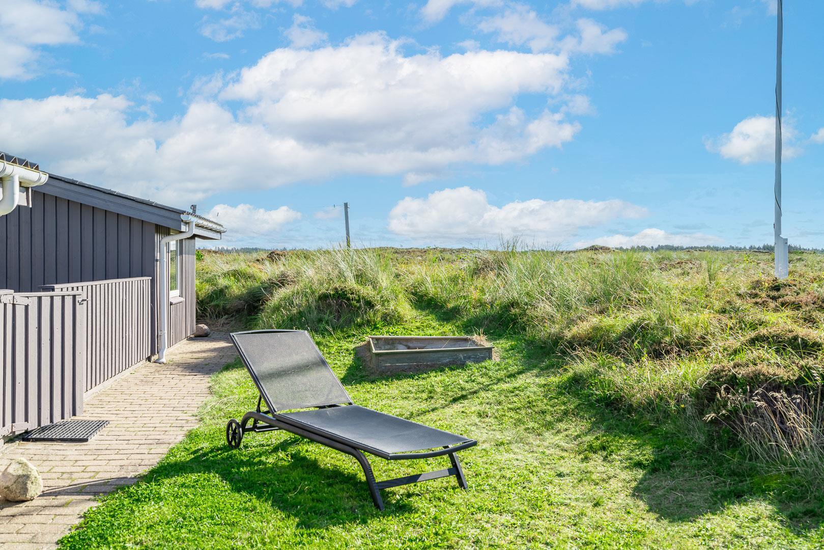 Hyggeligt feriehus beliggende på en stor, let kuperet natur-/klitgrund direkte ud til fredede arealer. Til huset hører helt lukket samt overdækket terrasse. Badeværelse med sauna. Veludstyret køkken med bl.a. opvaskemaskine og mikrobølgeovn. Stuen er hyggelig indrettet med gode møbler. 3 gode soverum. Der findes bla. barnestol, børnebadekar og puslebord samt sandkasse.