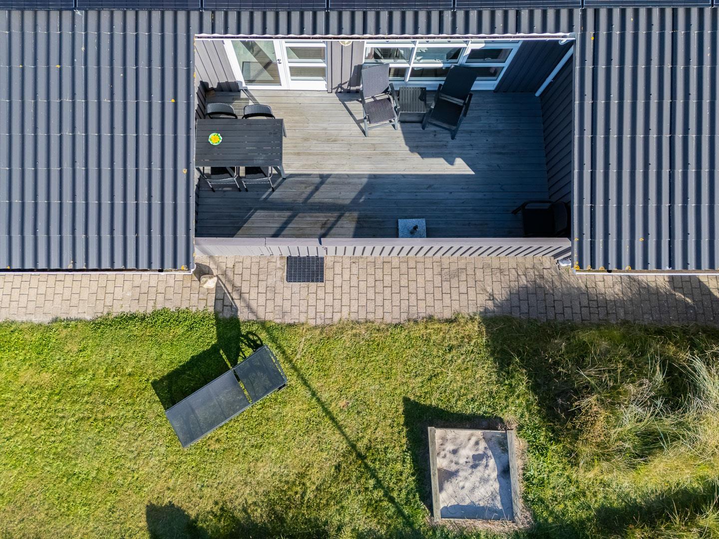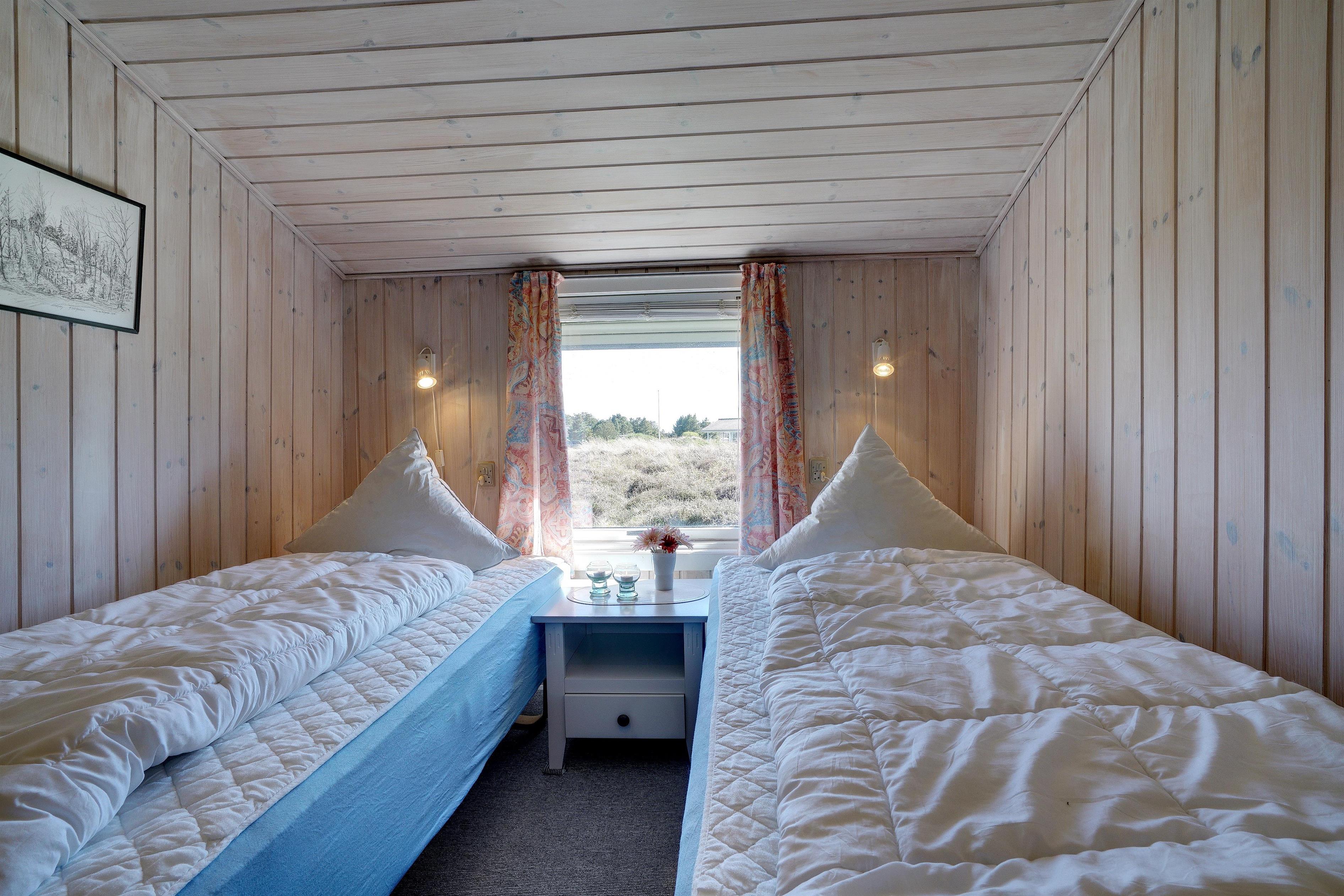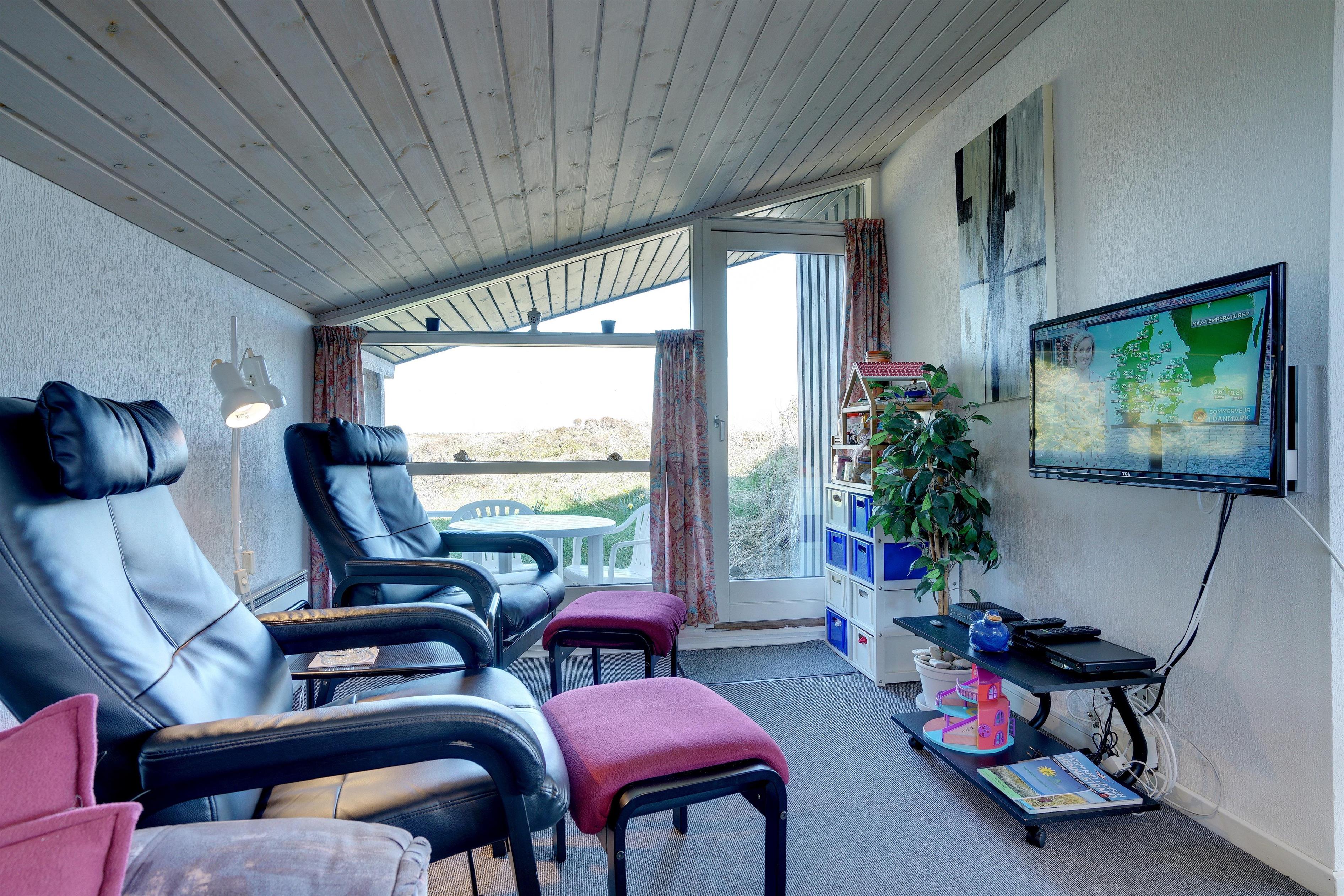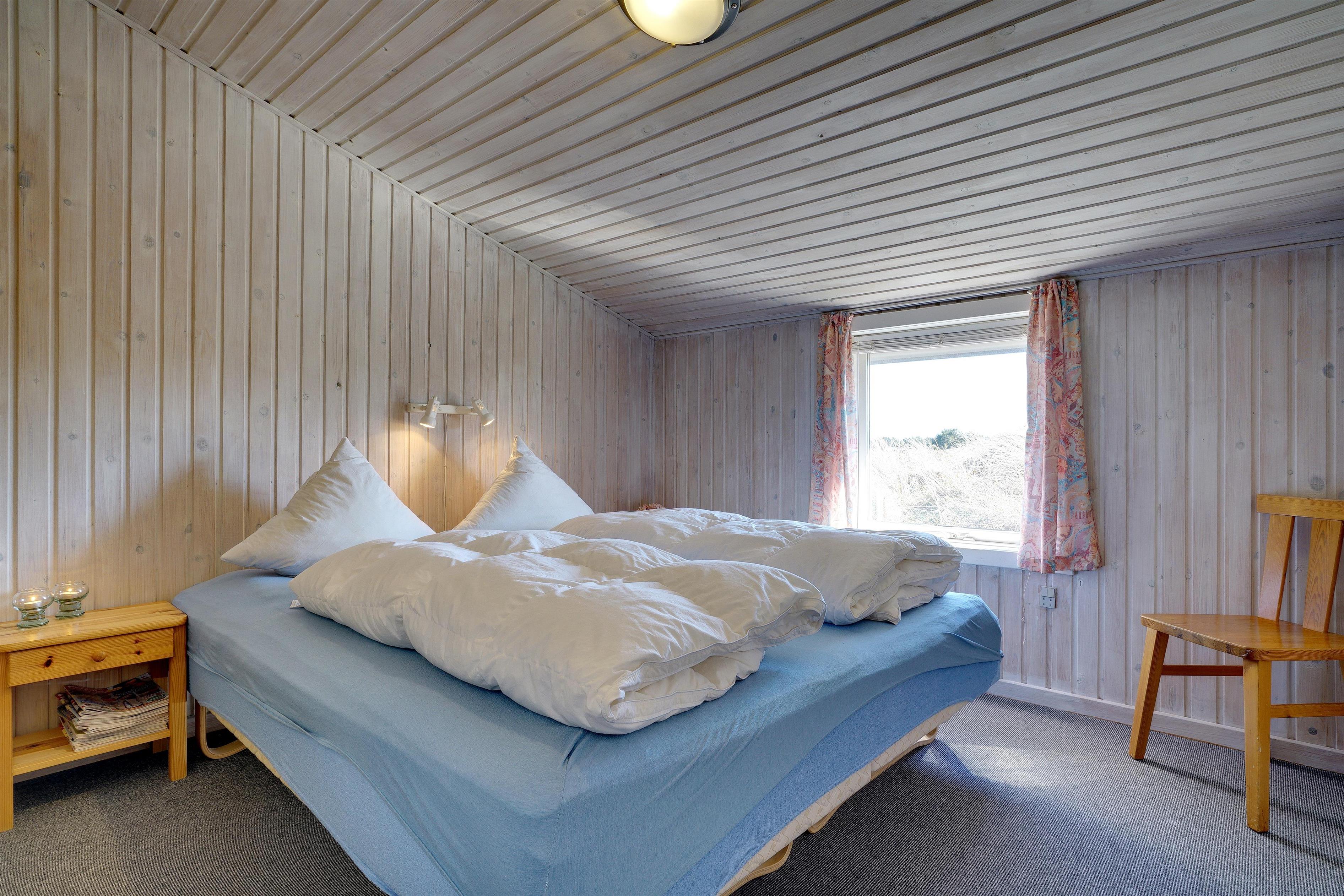 Hyggeligt feriehus beliggende på en stor, let kuperet natur-/klitgrund direkte ud til fredede arealer. Til huset hører helt lukket samt overdækket terrasse. Badeværelse med sauna. Veludstyret køkken med bl.a. opvaskemaskine og mikrobølgeovn. Stuen er hyggelig indrettet med gode møbler. 3 gode soverum. Der findes bla. barnestol, børnebadekar og puslebord samt sandkasse.