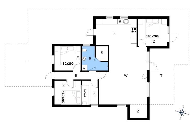 Du kommer ind i gangen, hvorfra der er døre til begge sider. Med i alt 4 gode værelser deraf 3 med dobbeltsenge (den ene har også en hems) + et køjeværelse og et lækkert badeværelse - er huset velegnet til 6 personer.