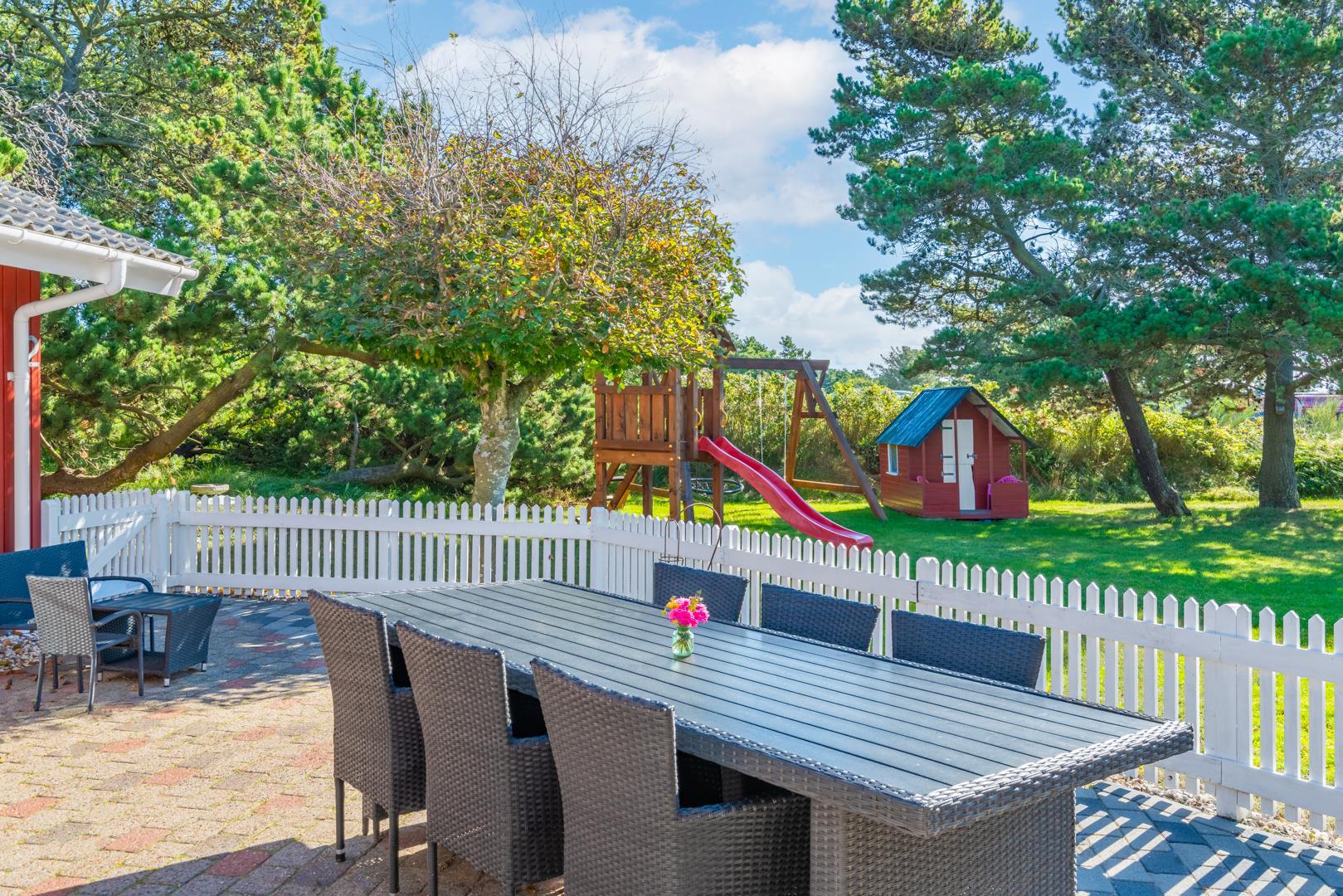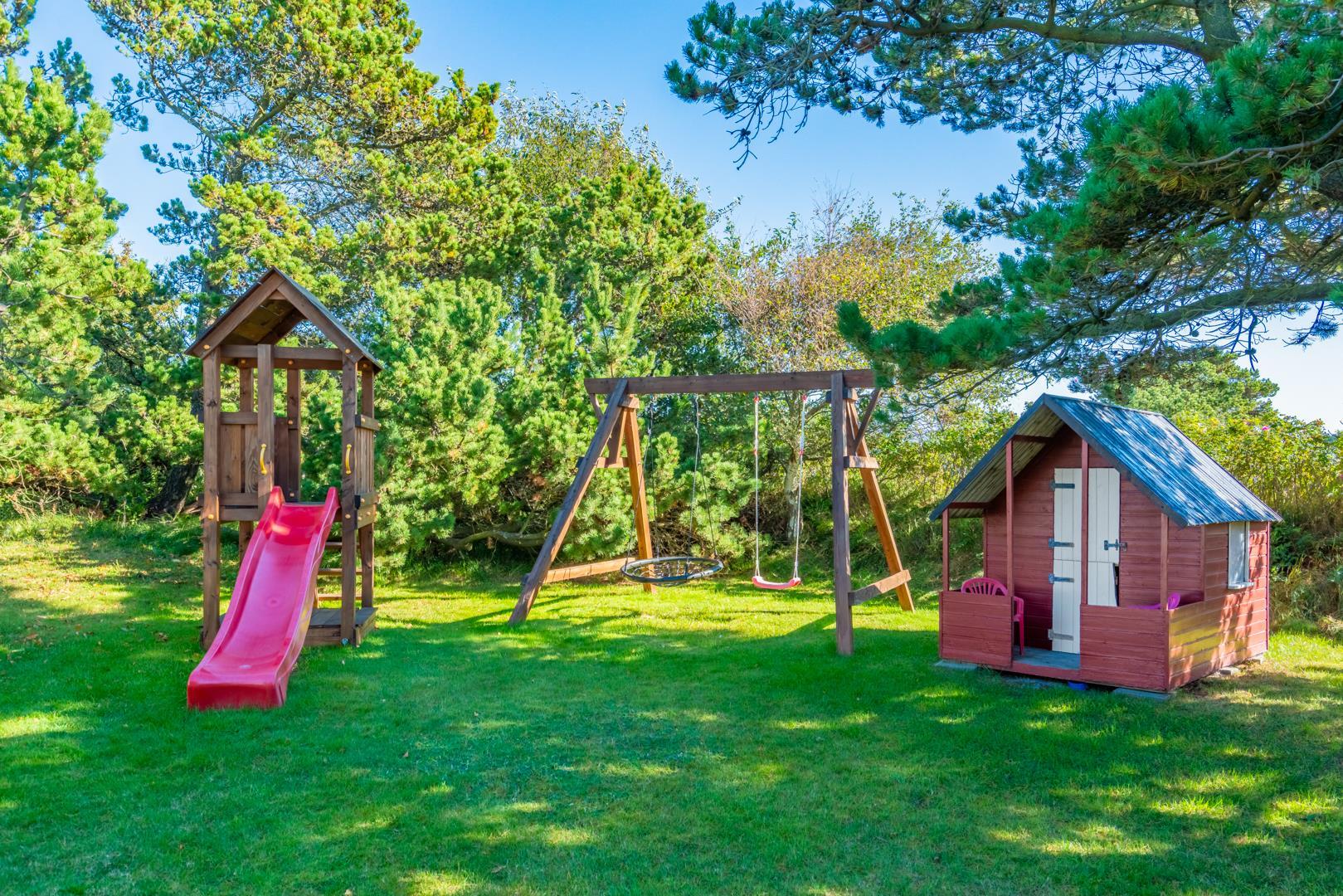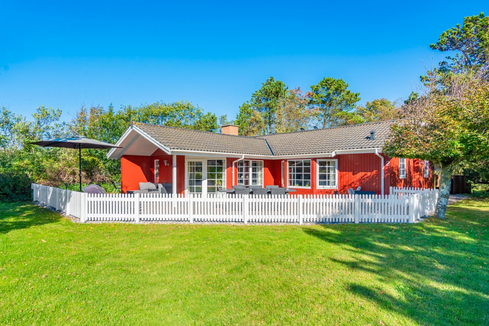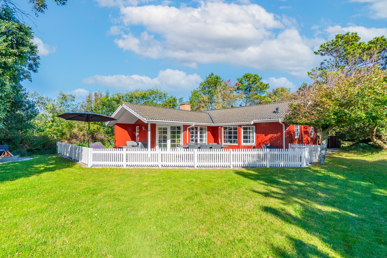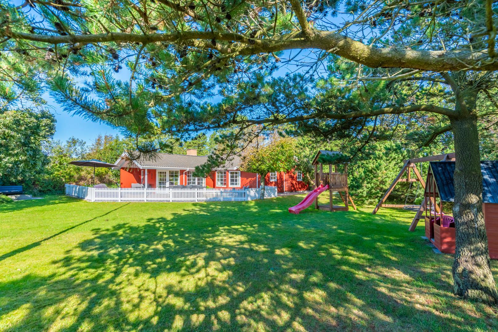 Dette meget velholdte og hyggelige indrettede feriehus med loft til kip er beliggende på en børnevenlig bevokset naturgrund. Huset har et stort moderne køkken/spisestue og stuen er indrettet med gode møbler. I det ene badeværelse er der installeret vaskemaskine og tørretumbler. Fra stuen er der udgang til dejlig lukket, ugeneret terrasse og børnene kan lege i legehuset som er på grunden.