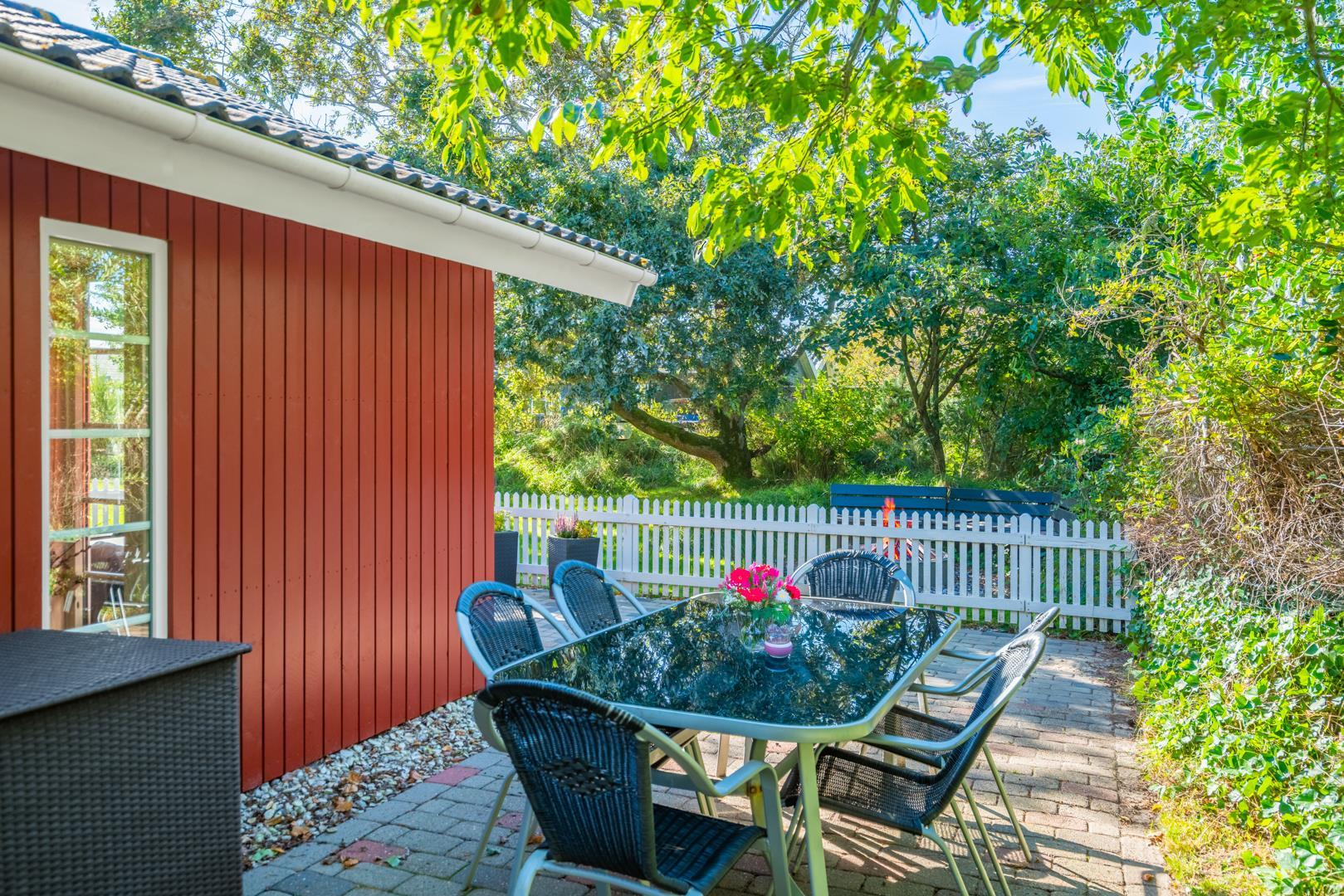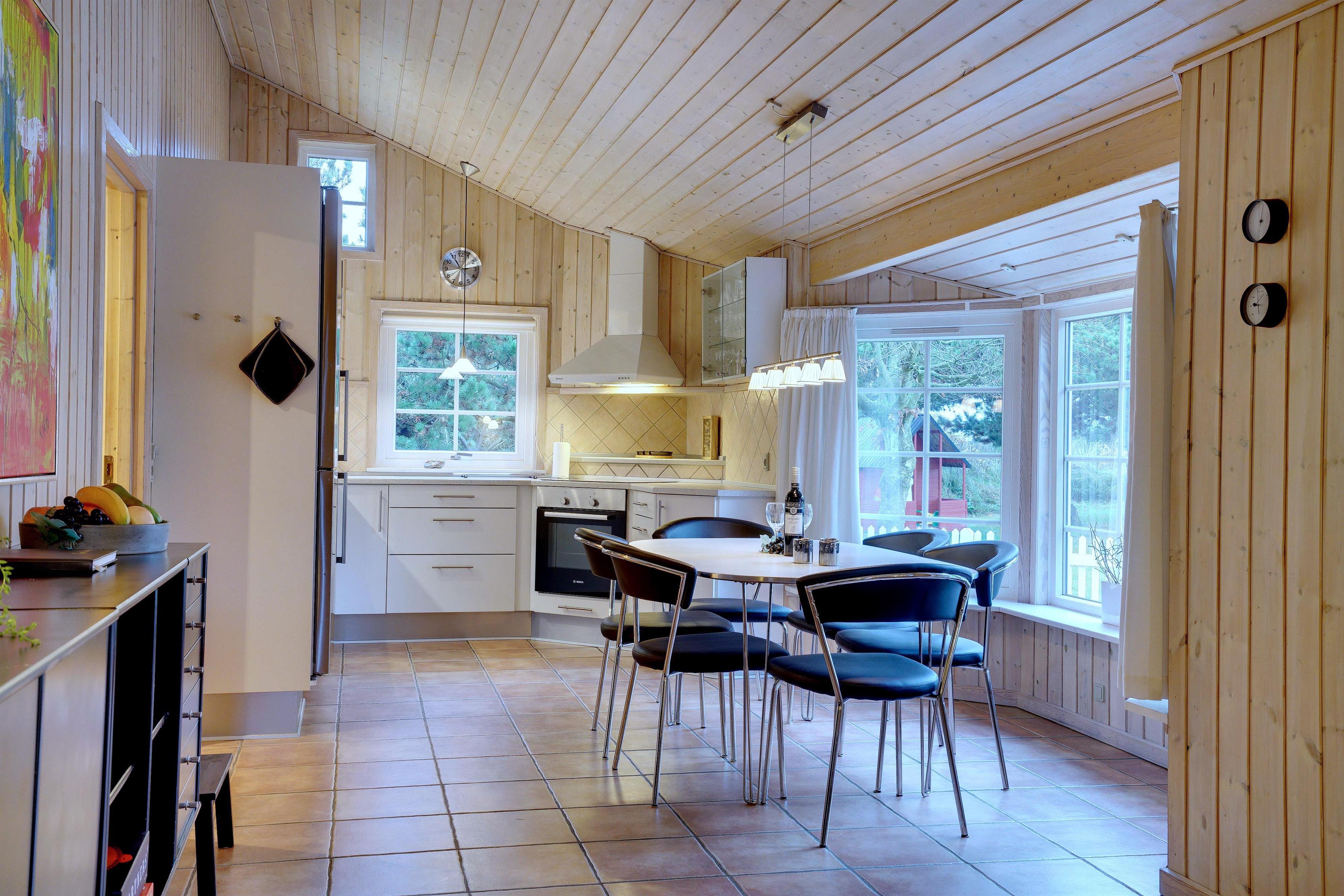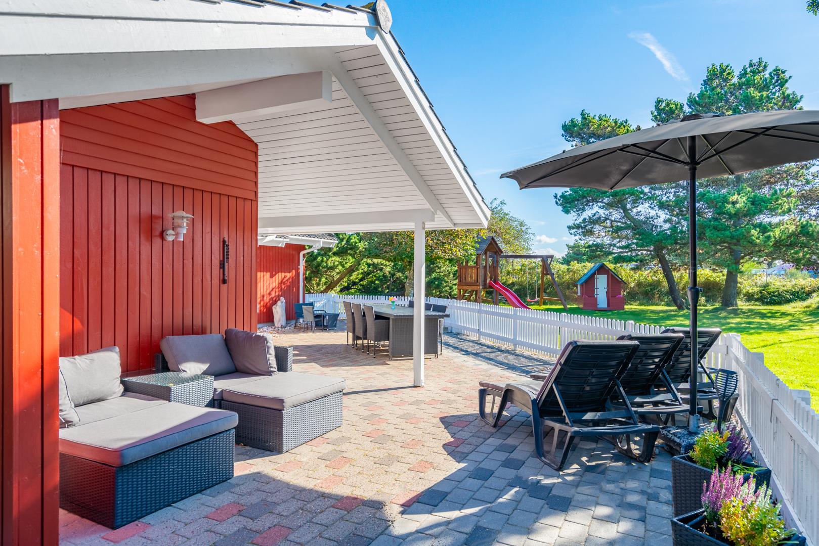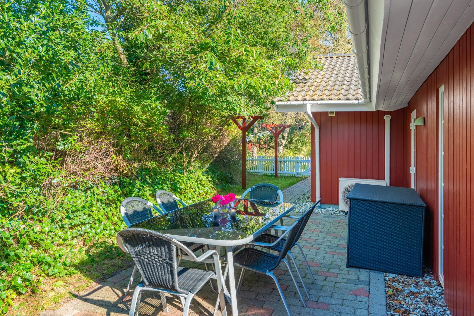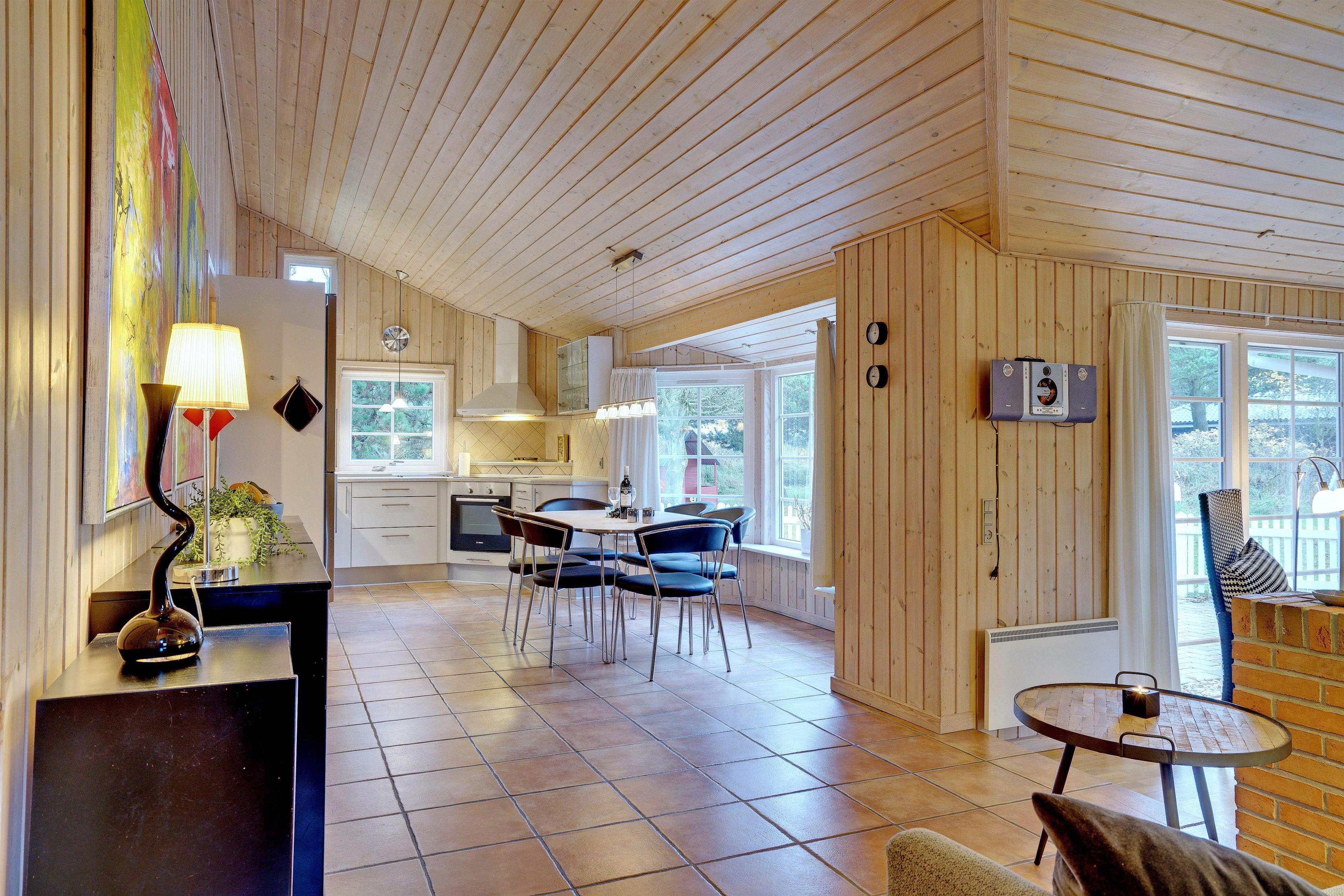 Dette meget velholdte og hyggelige indrettede feriehus med loft til kip er beliggende på en børnevenlig bevokset naturgrund. Huset har et stort moderne køkken/spisestue og stuen er indrettet med gode møbler. I det ene badeværelse er der installeret vaskemaskine og tørretumbler. Fra stuen er der udgang til dejlig lukket, ugeneret terrasse og børnene kan lege i legehuset som er på grunden.