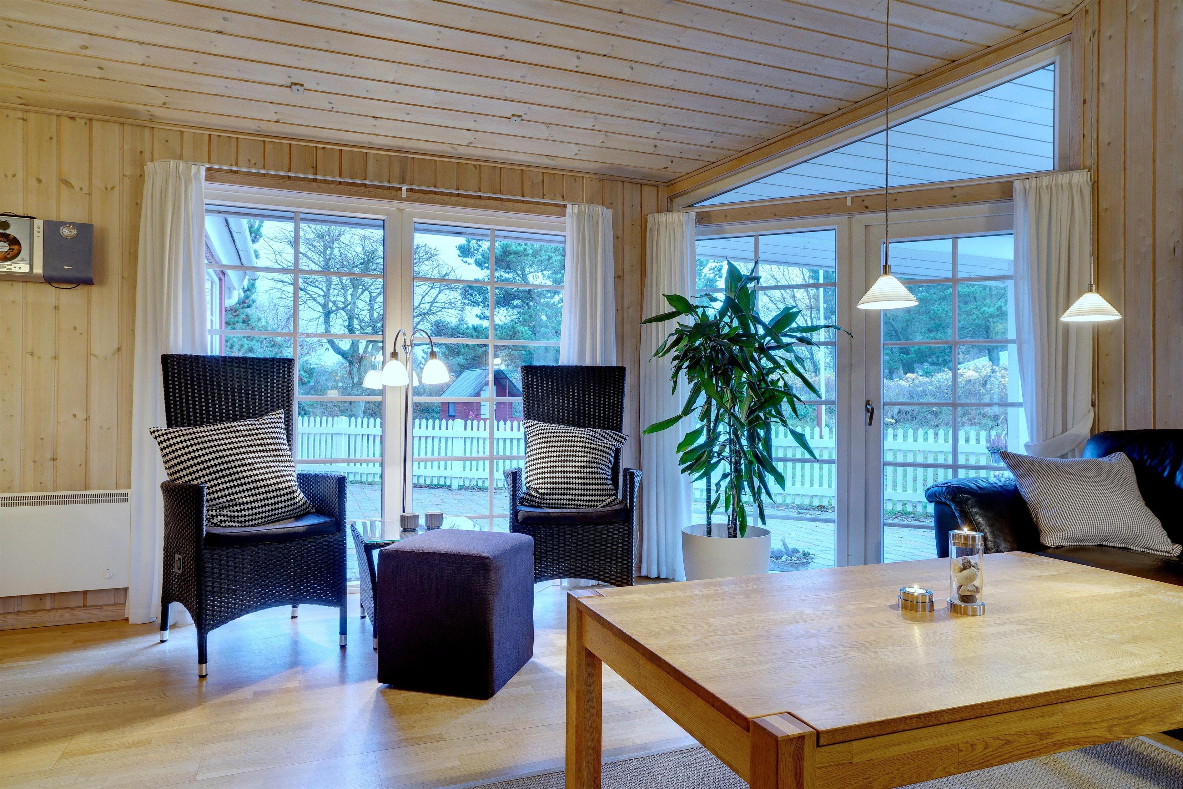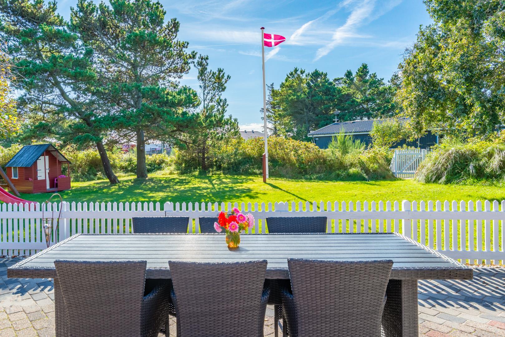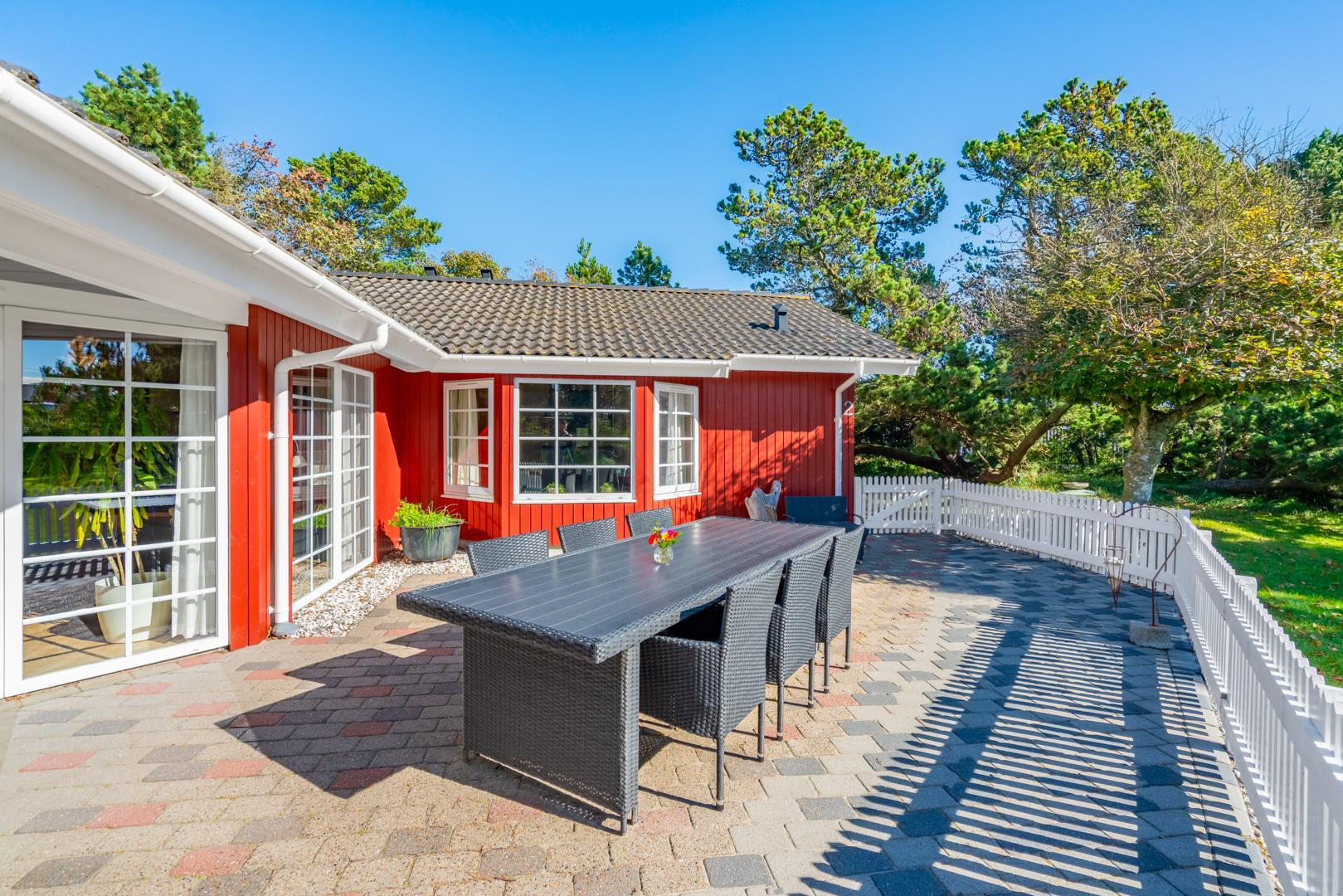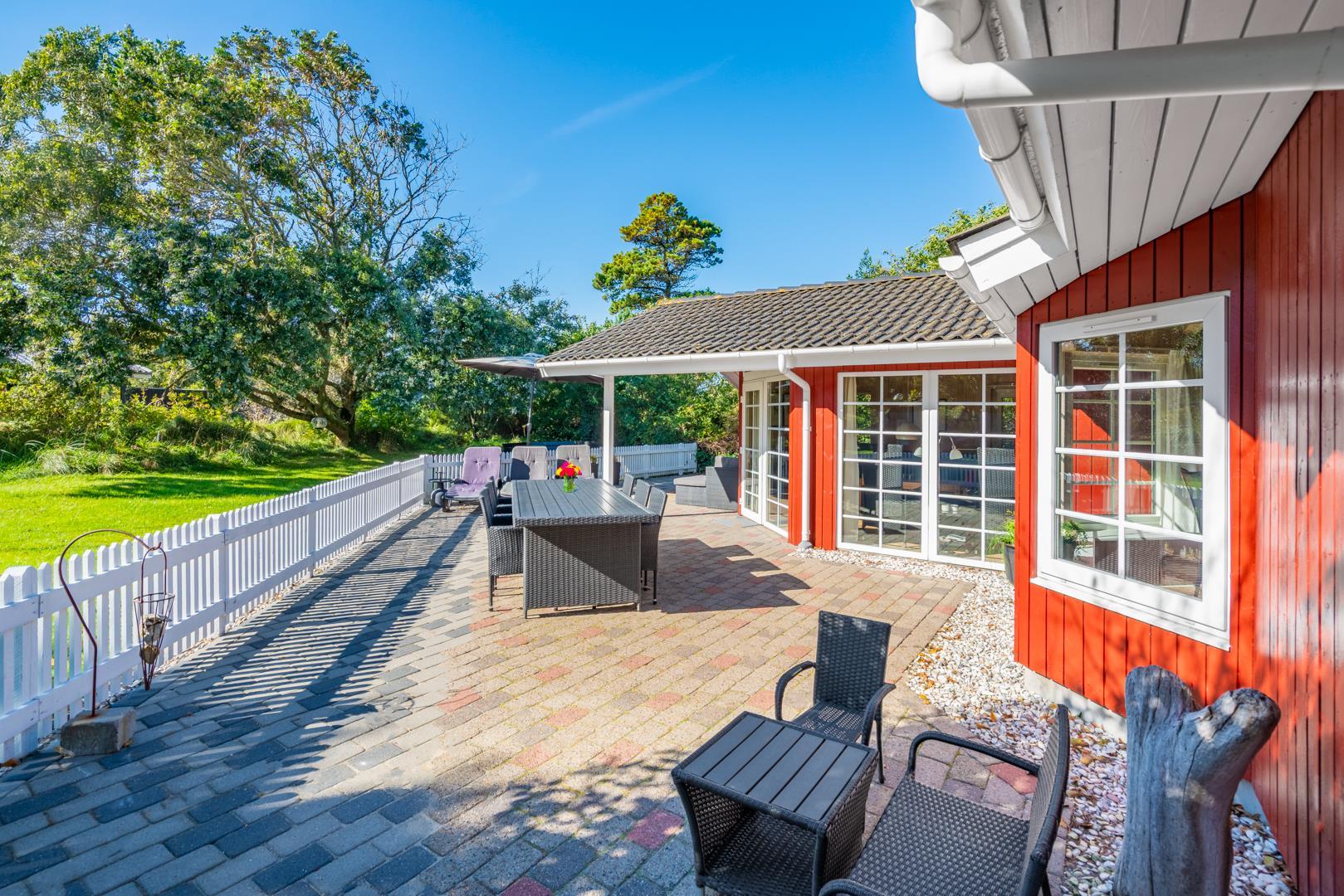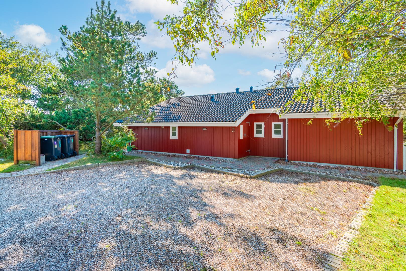 Dette meget velholdte og hyggelige indrettede feriehus med loft til kip er beliggende på en børnevenlig bevokset naturgrund. Huset har et stort moderne køkken/spisestue og stuen er indrettet med gode møbler. I det ene badeværelse er der installeret vaskemaskine og tørretumbler. Fra stuen er der udgang til dejlig lukket, ugeneret terrasse og børnene kan lege i legehuset som er på grunden.