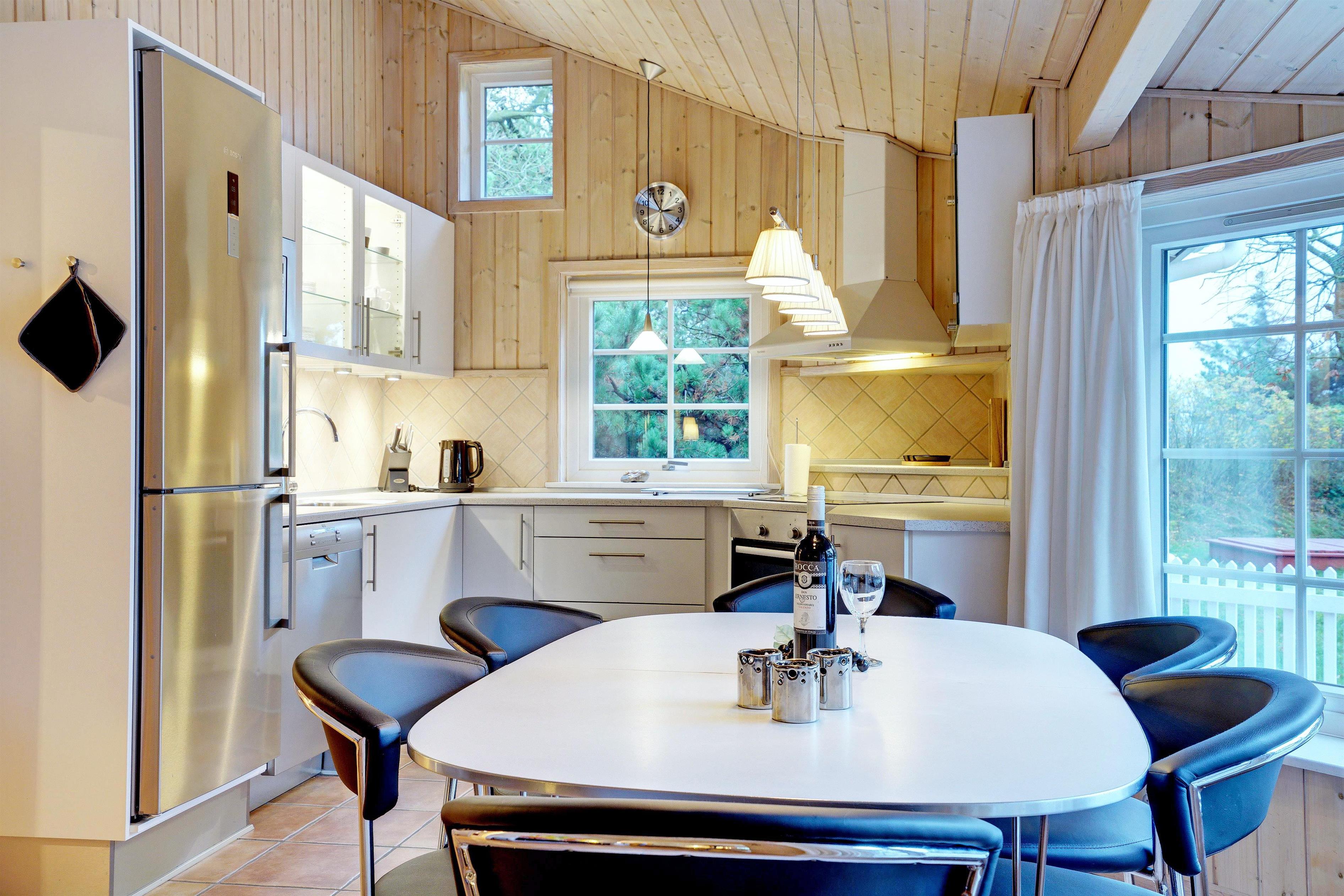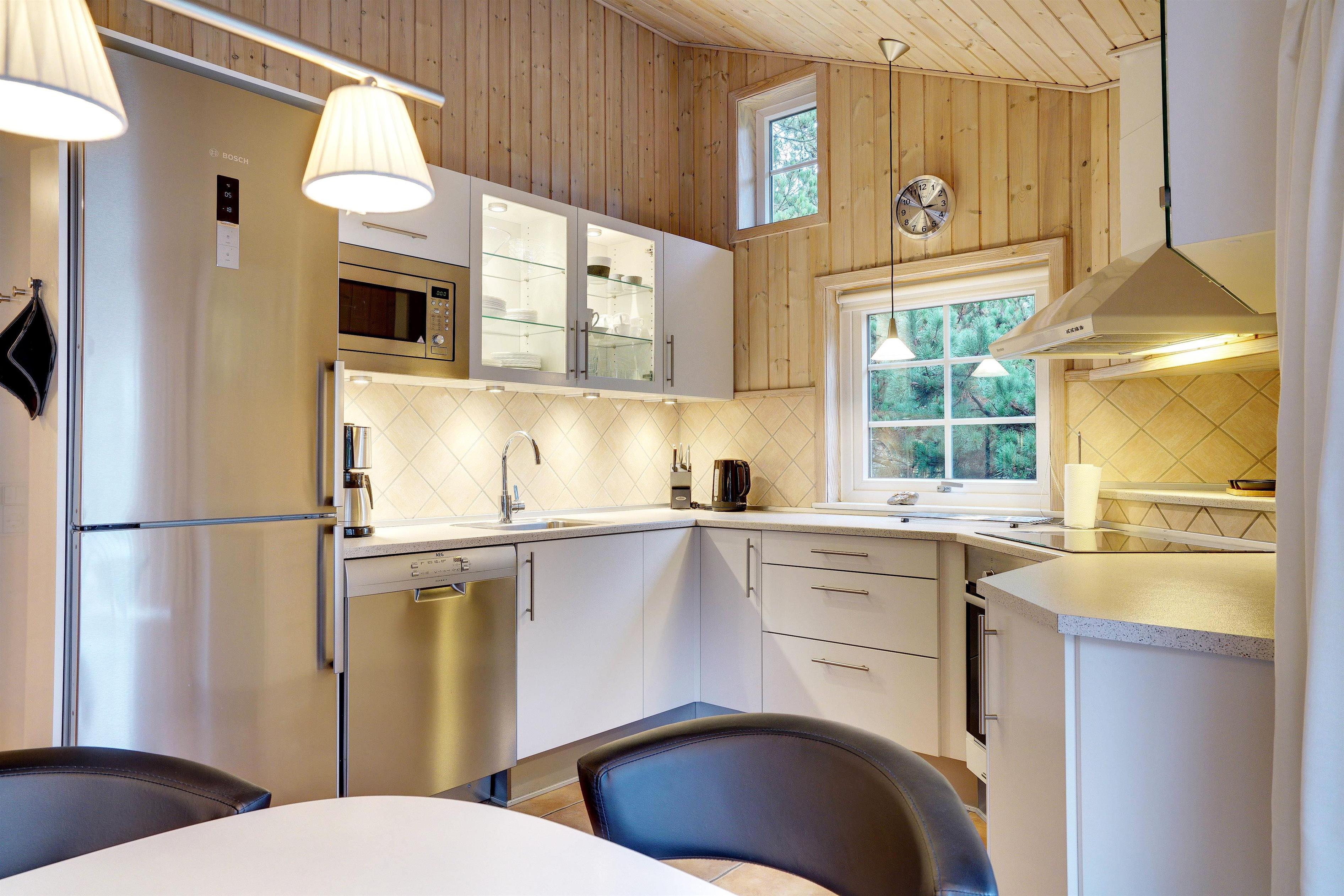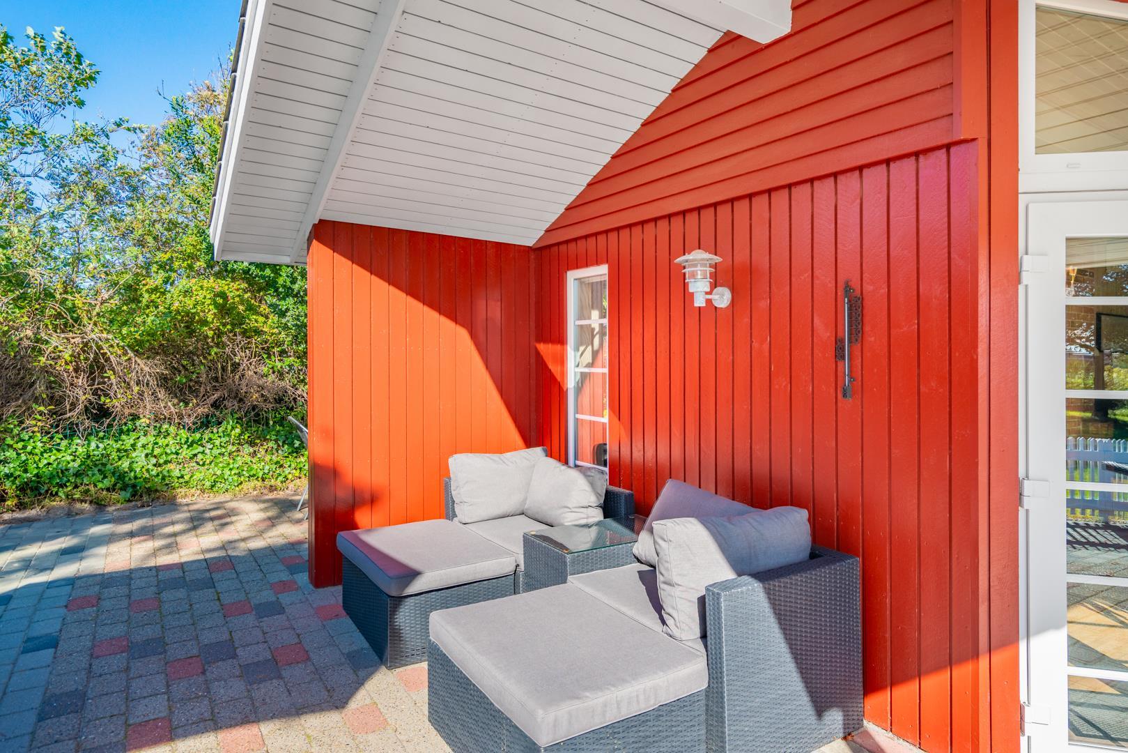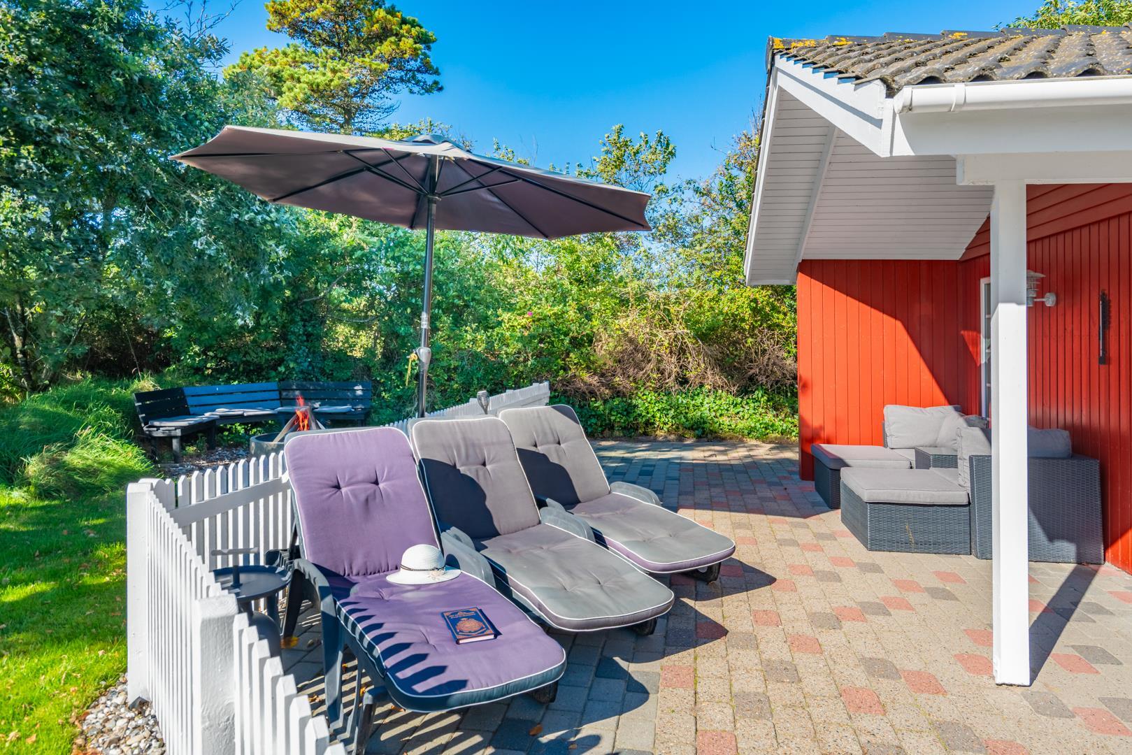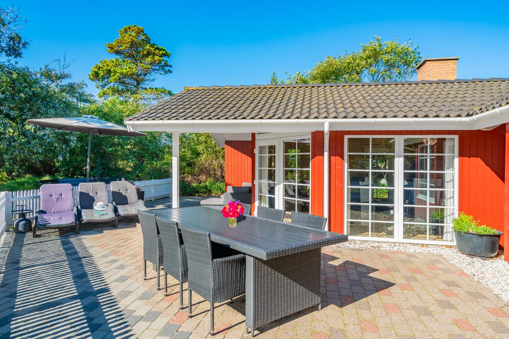 Dette meget velholdte og hyggelige indrettede feriehus med loft til kip er beliggende på en børnevenlig bevokset naturgrund. Huset har et stort moderne køkken/spisestue og stuen er indrettet med gode møbler. I det ene badeværelse er der installeret vaskemaskine og tørretumbler. Fra stuen er der udgang til dejlig lukket, ugeneret terrasse og børnene kan lege i legehuset som er på grunden.