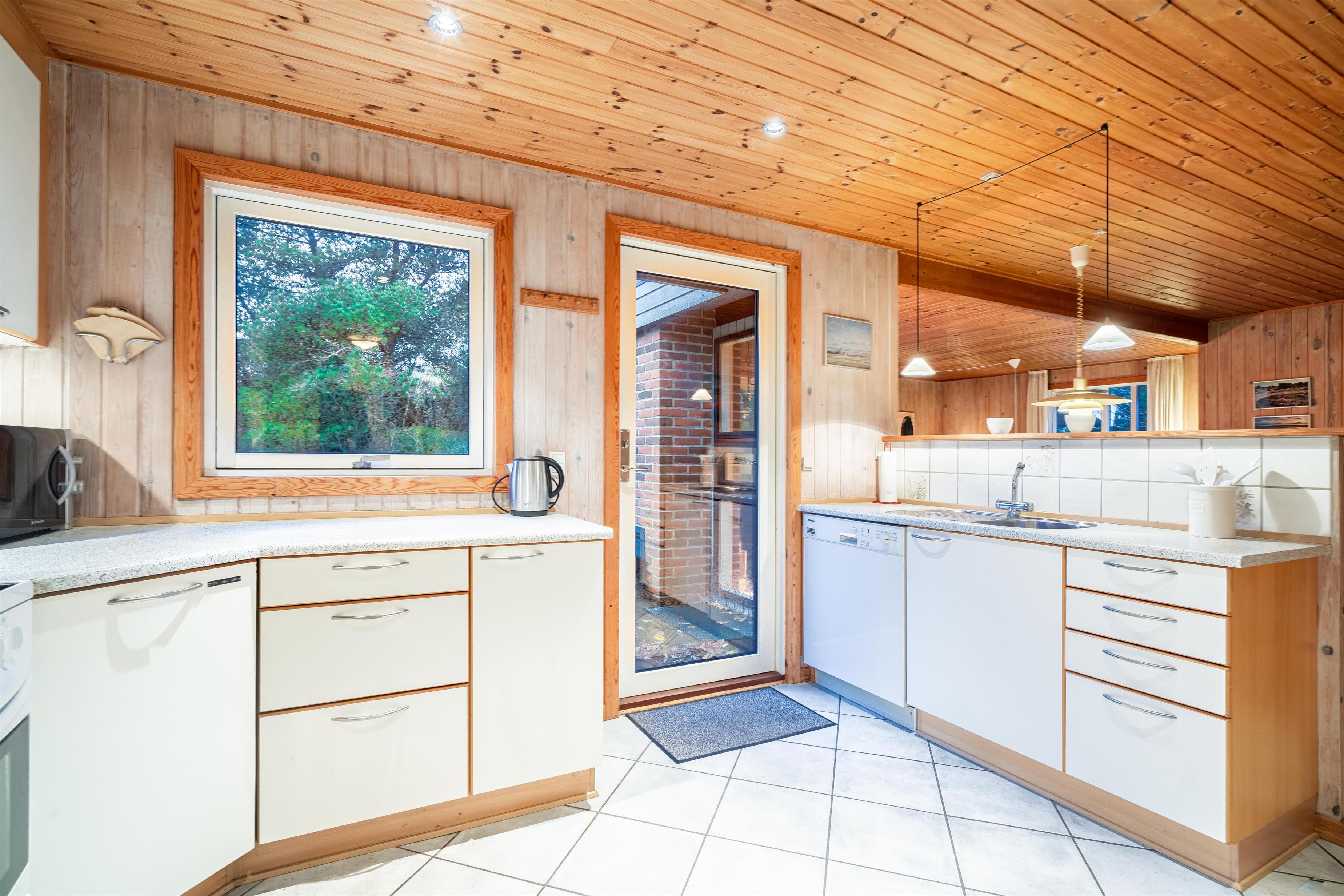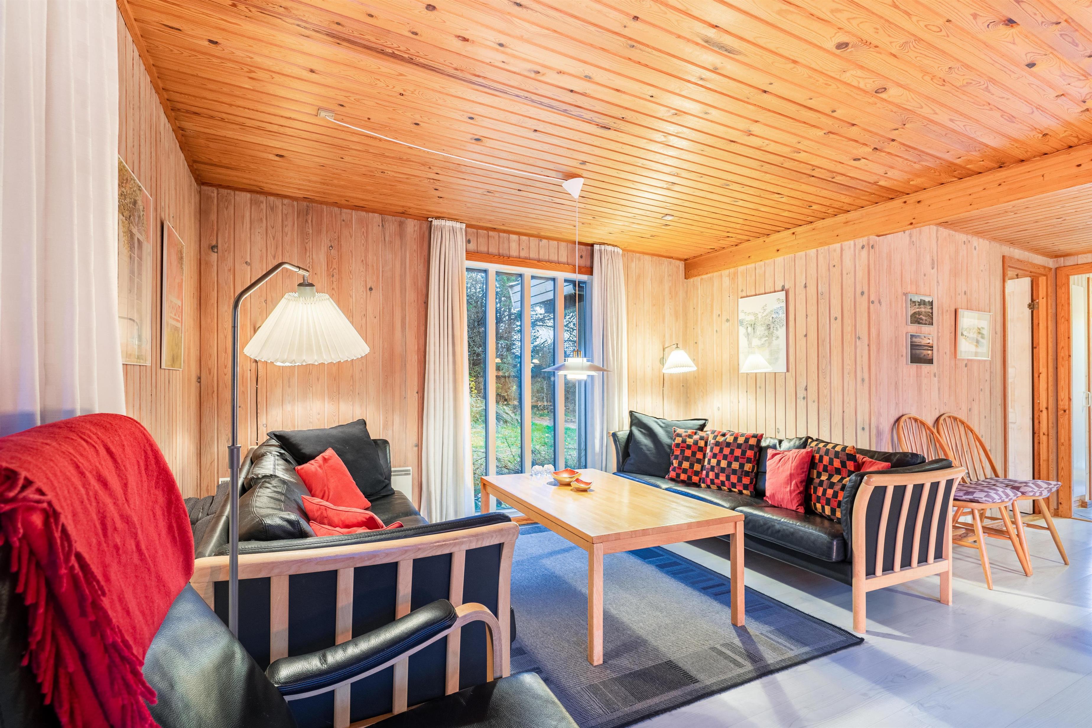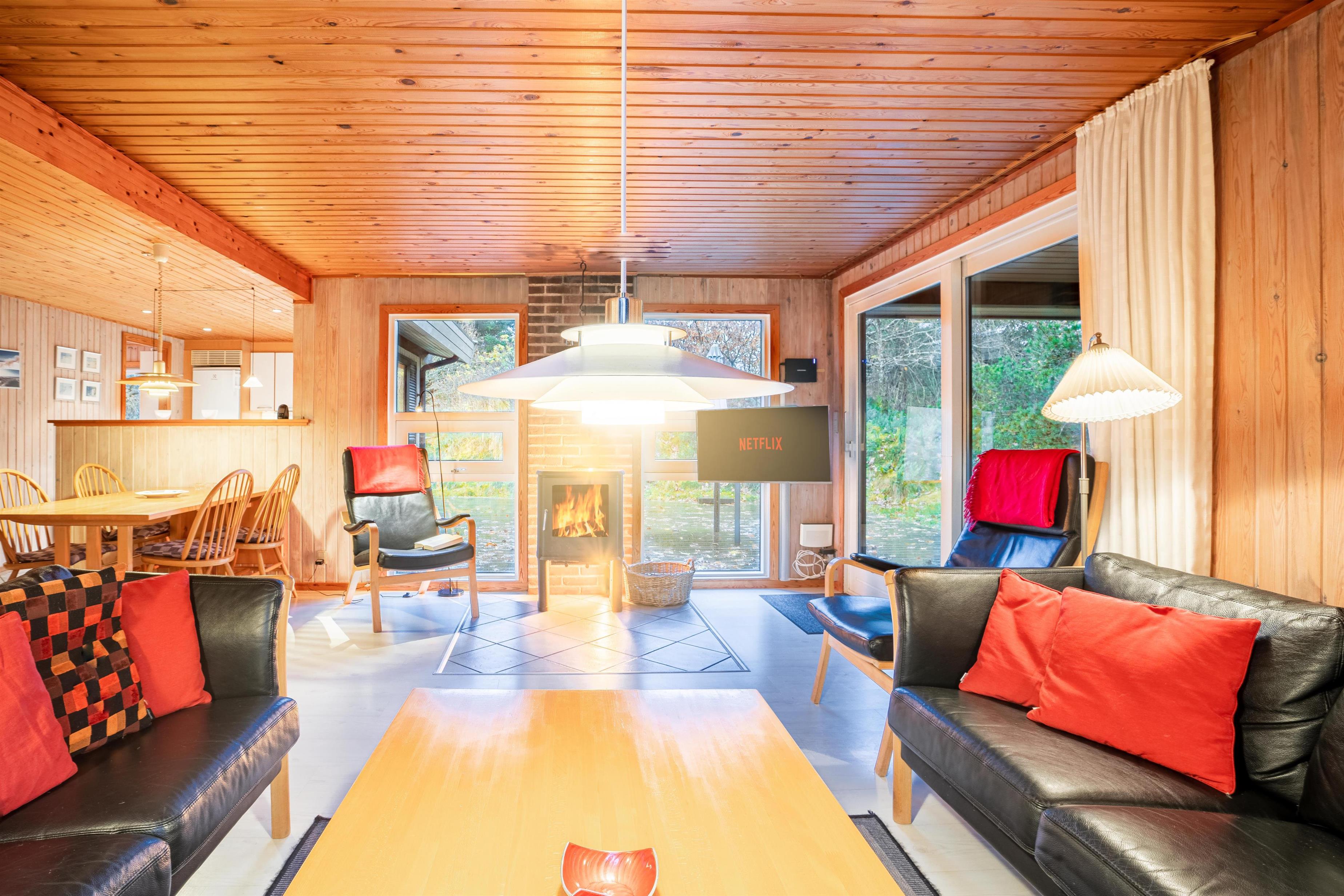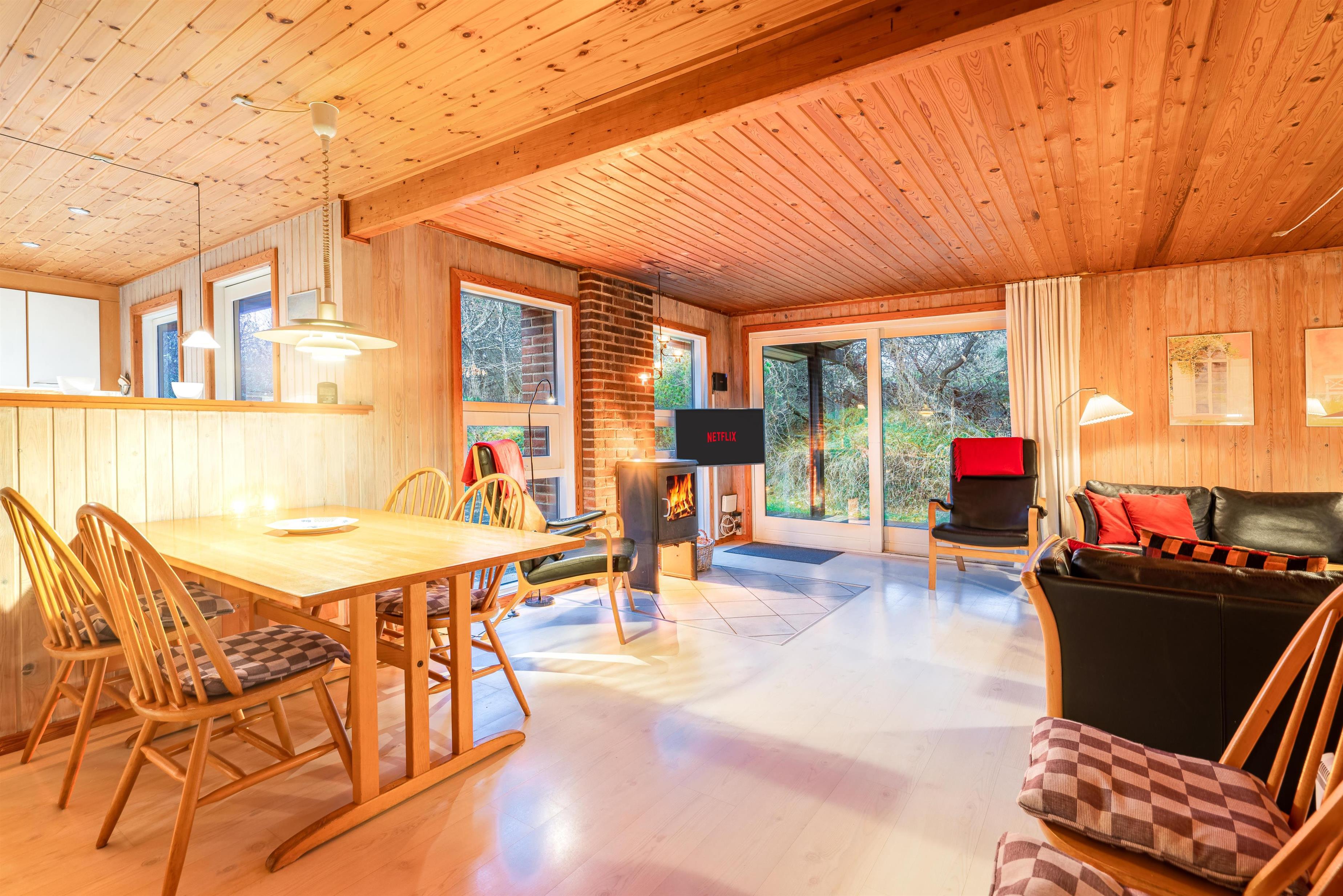 Meget velpasset og hyggelig indrettet feriehus beliggende på en dejlig rolig naturgrund med træer, buske og gode læmuligheder. Det flotte køkken ligger i åben forbindelse med stuen, som er indrettet med gode møbler. Der er fra stuen udgang til dejlig ugeneret terrasse. Godt badeværelse.