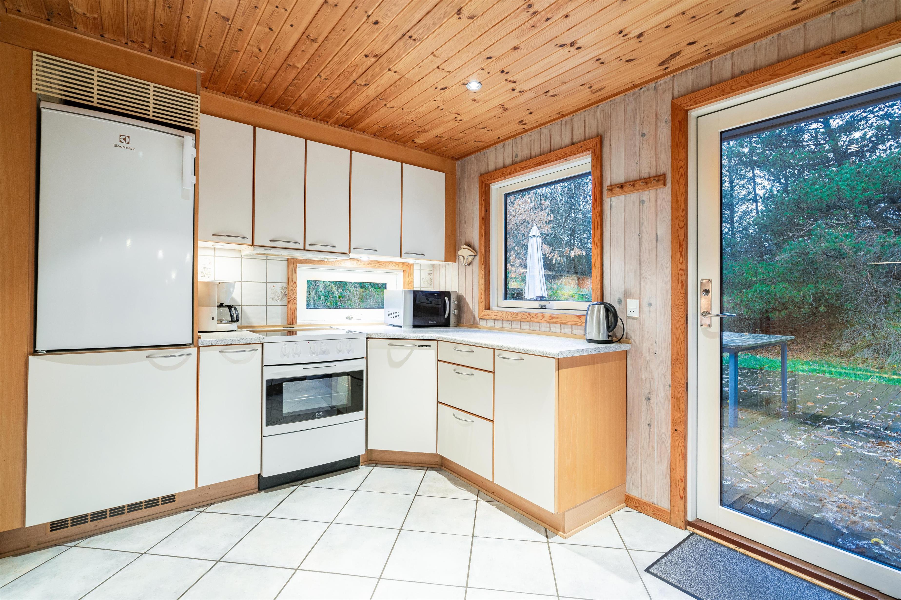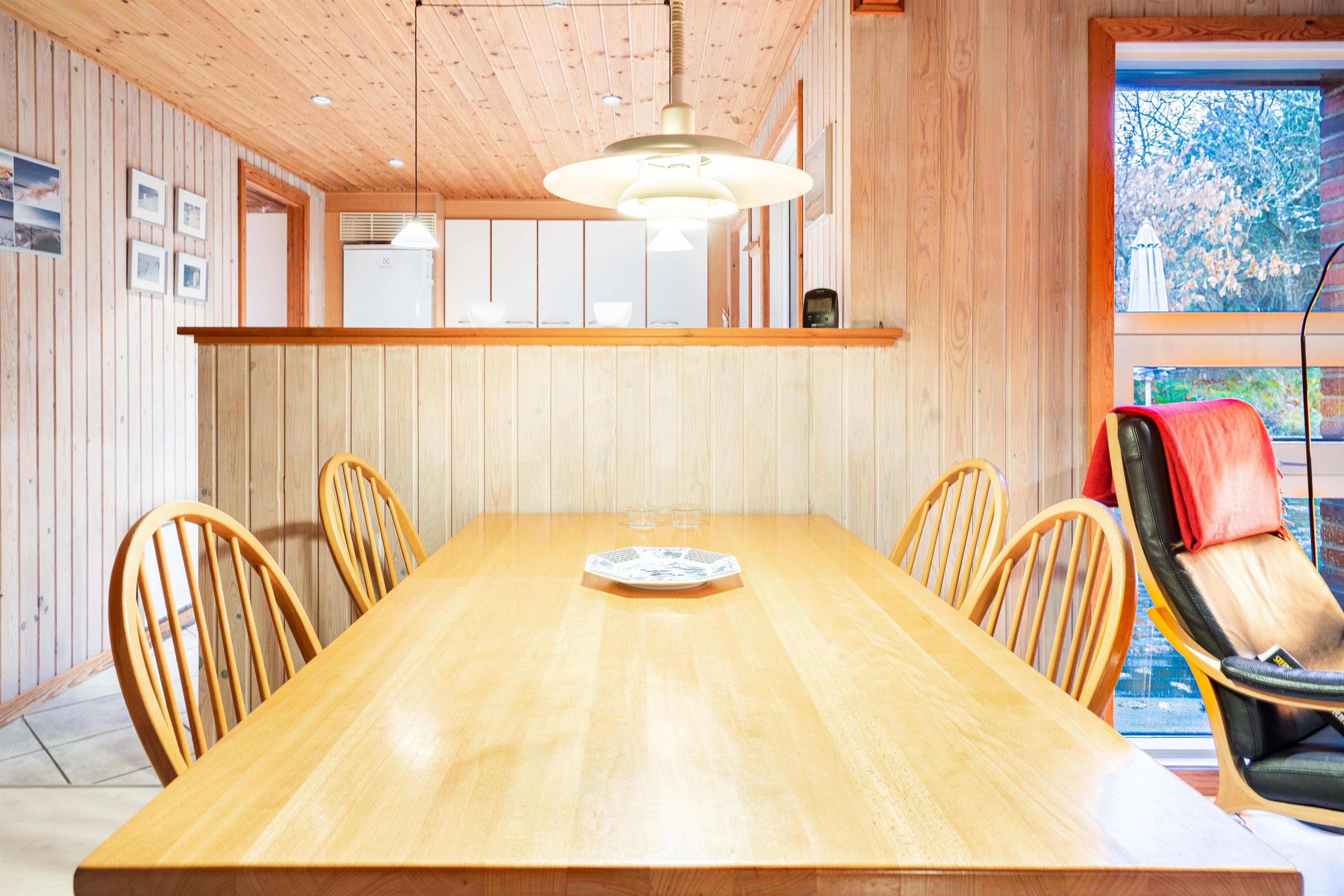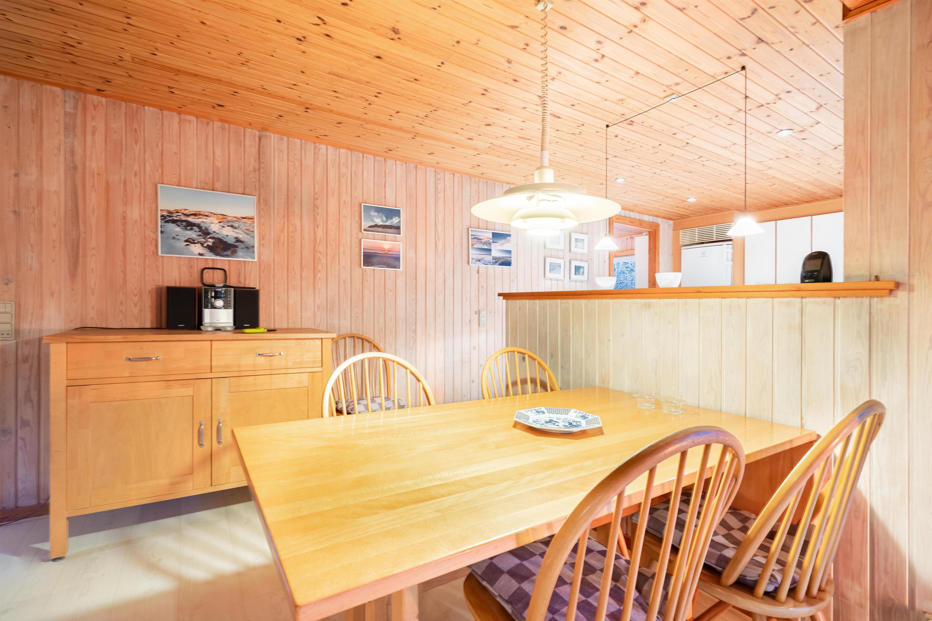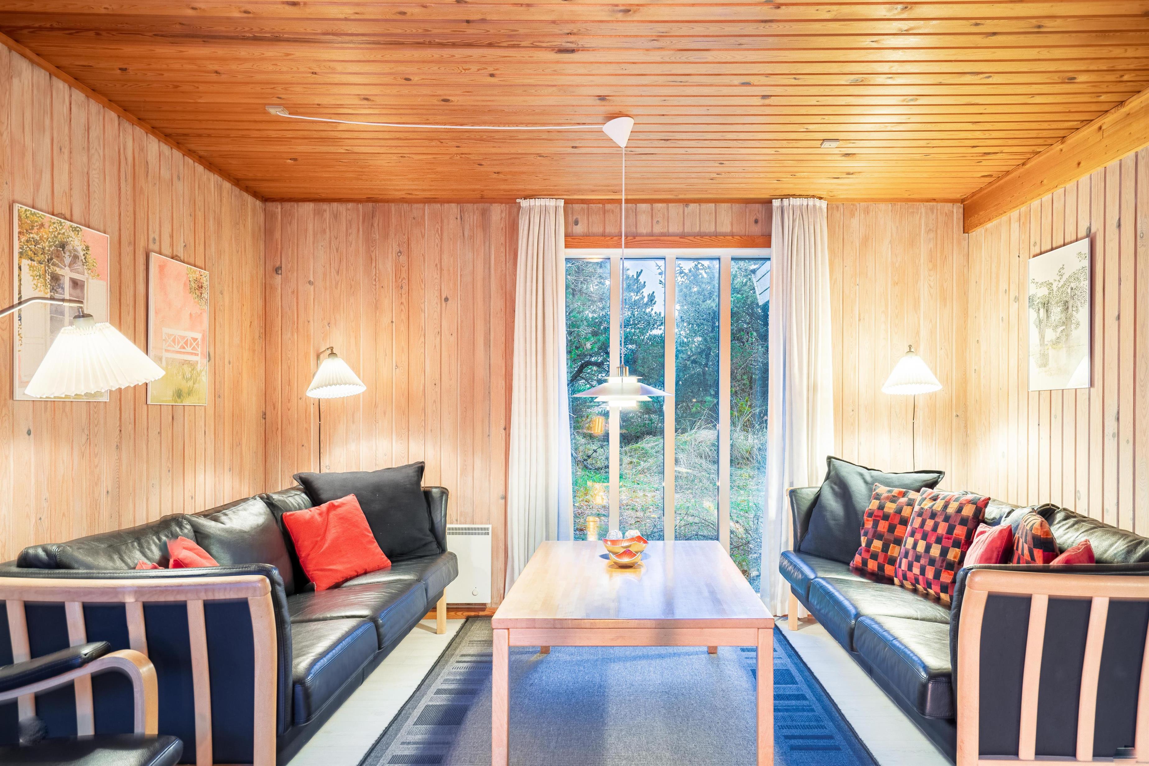 Meget velpasset og hyggelig indrettet feriehus beliggende på en dejlig rolig naturgrund med træer, buske og gode læmuligheder. Det flotte køkken ligger i åben forbindelse med stuen, som er indrettet med gode møbler. Der er fra stuen udgang til dejlig ugeneret terrasse. Godt badeværelse.