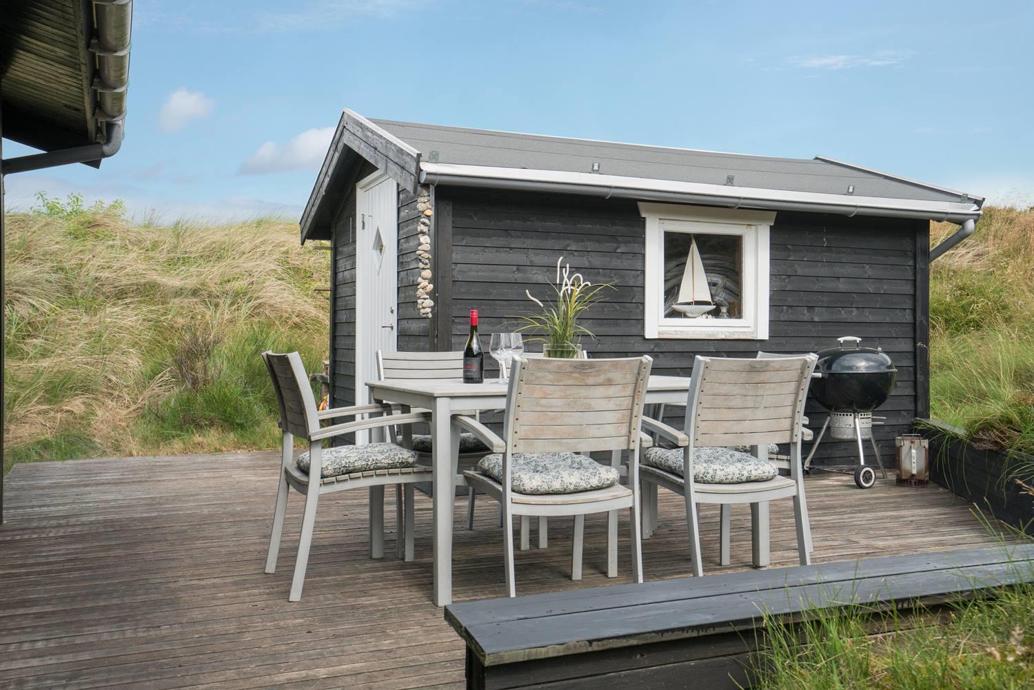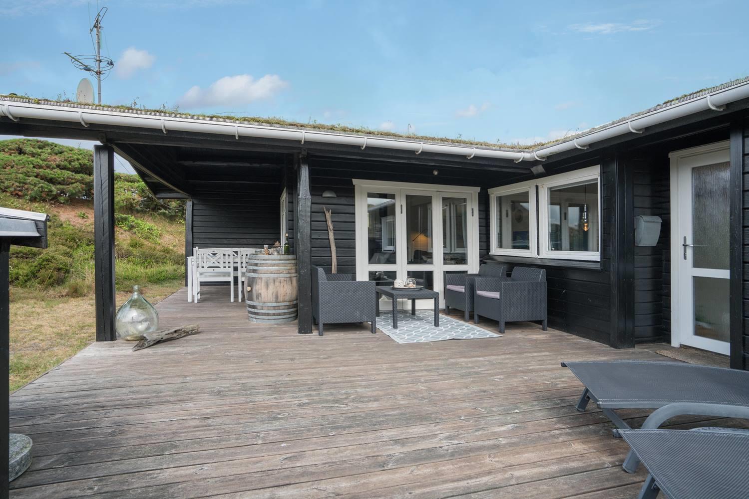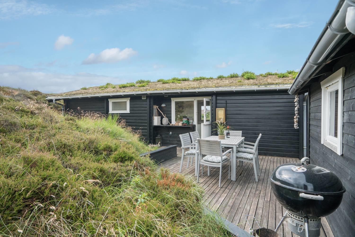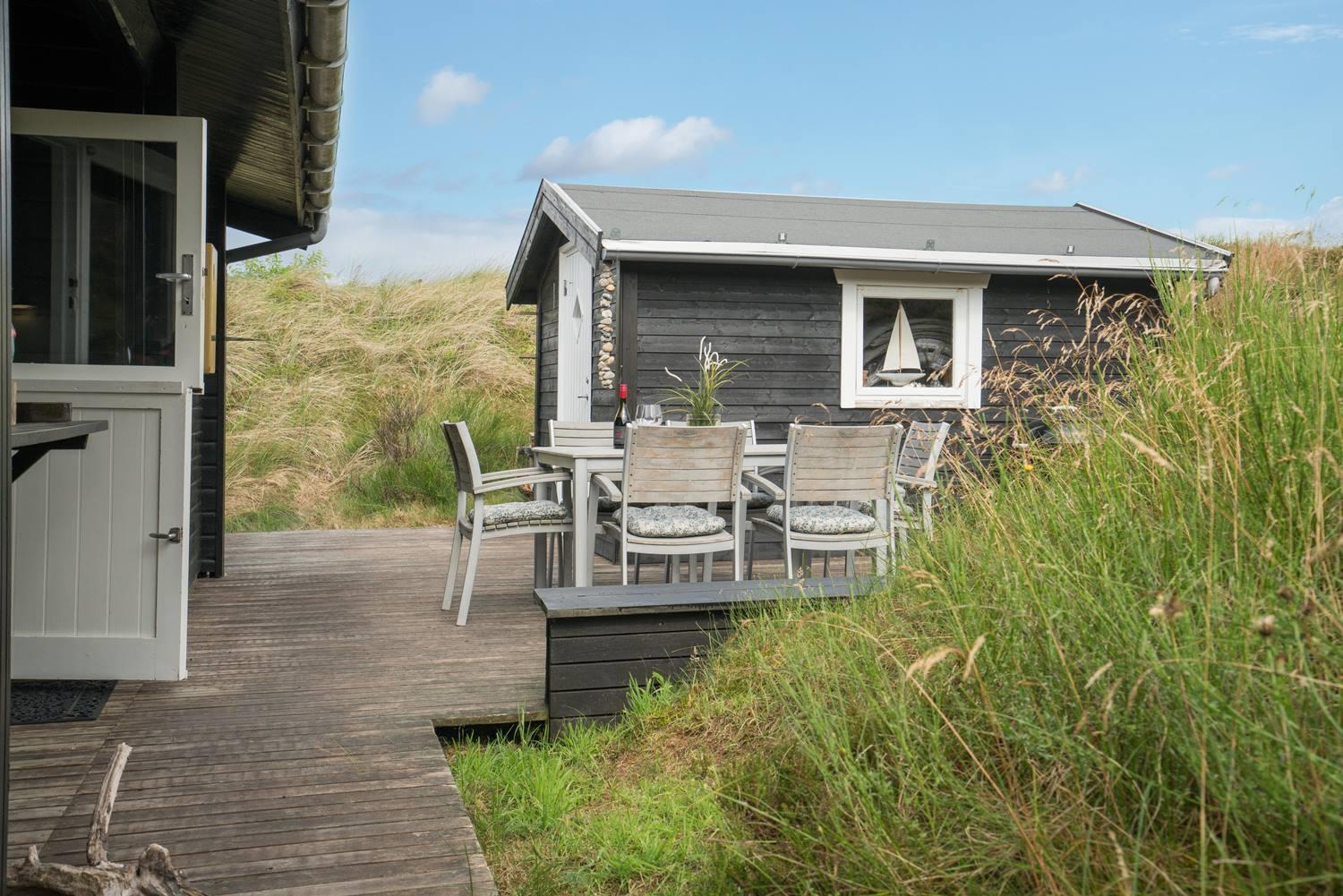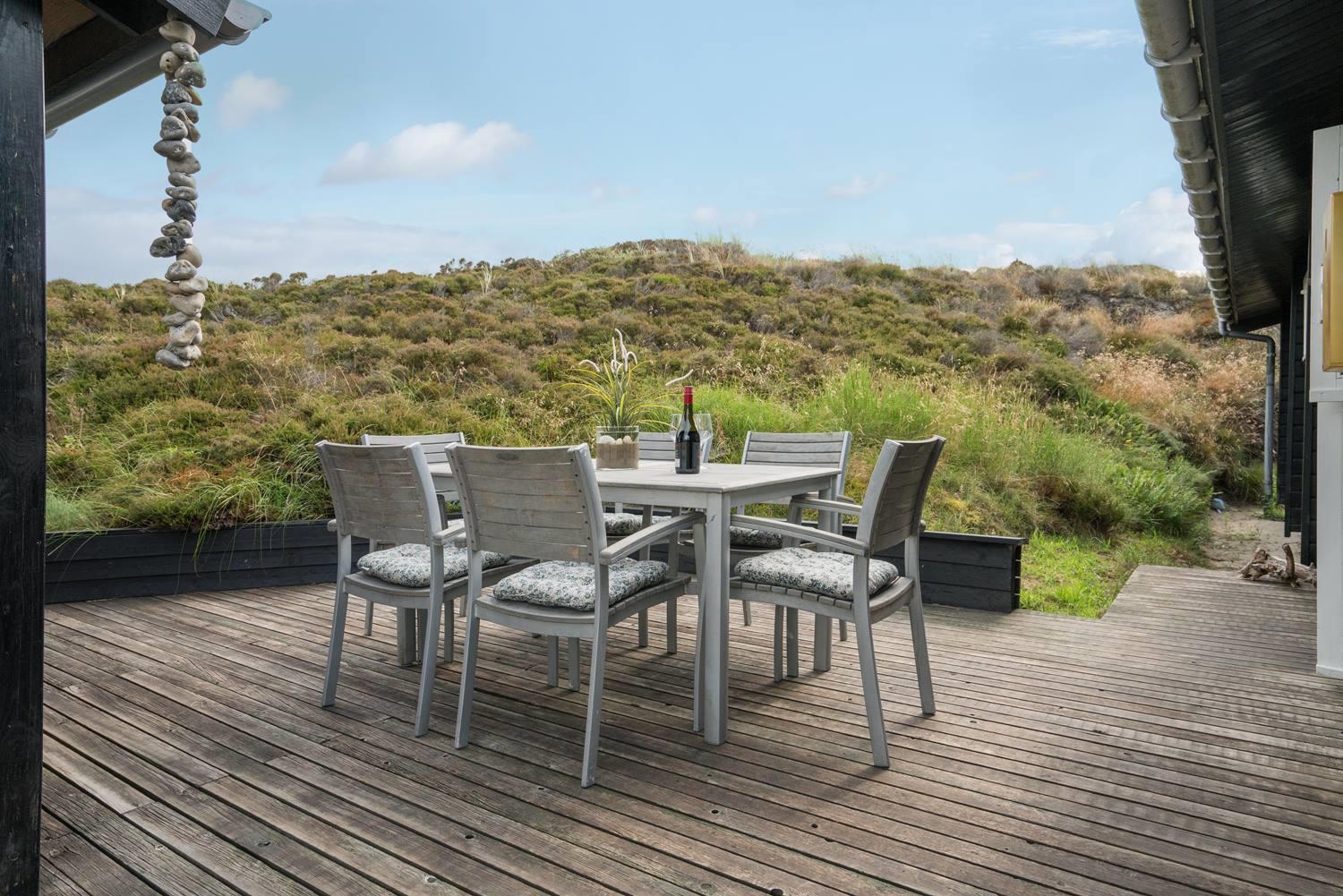 Hyggeligt sommerhus ved Henne Strand med egen terrasse, brændeovn og klitudsigt, perfekt til en afslappende ferie.