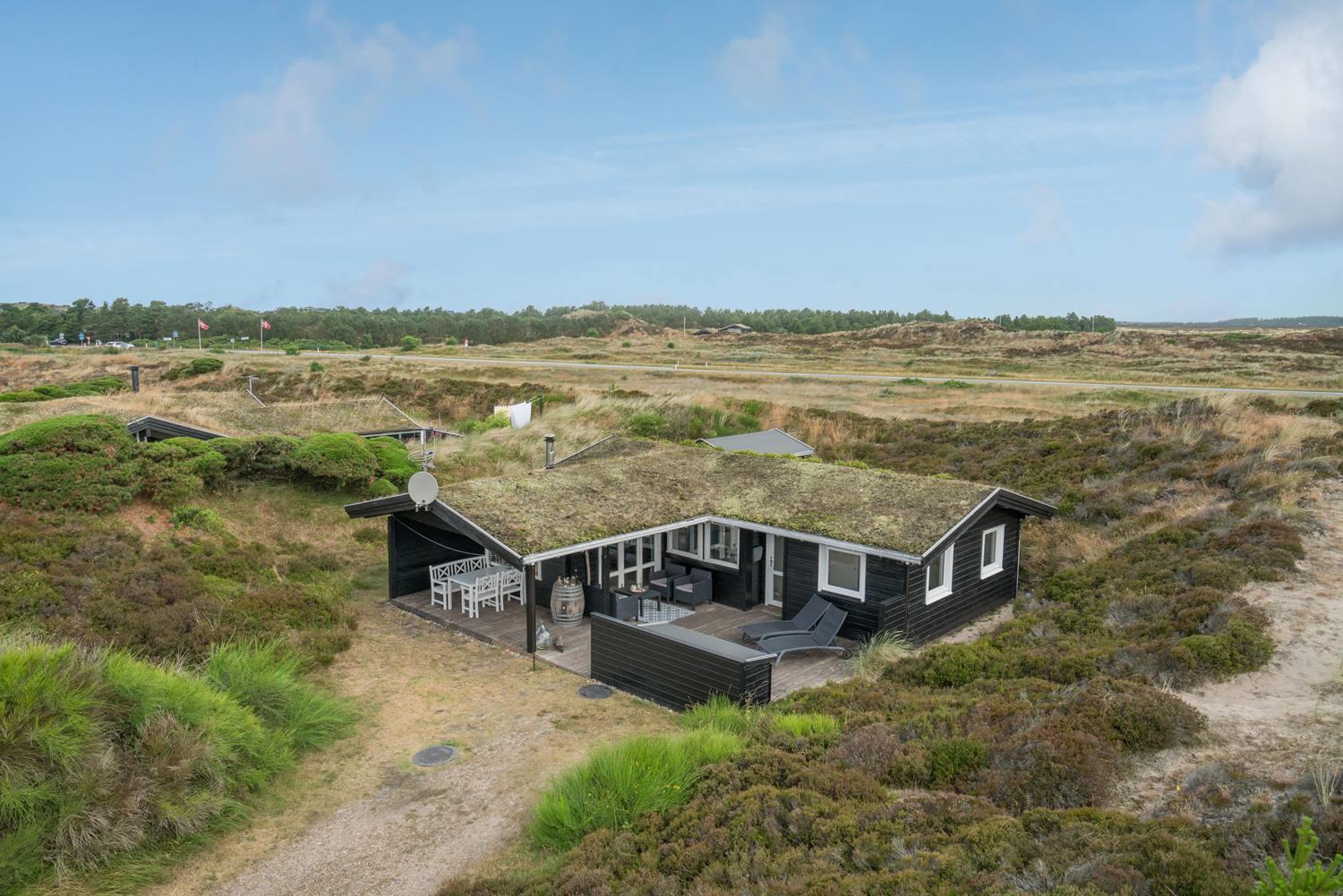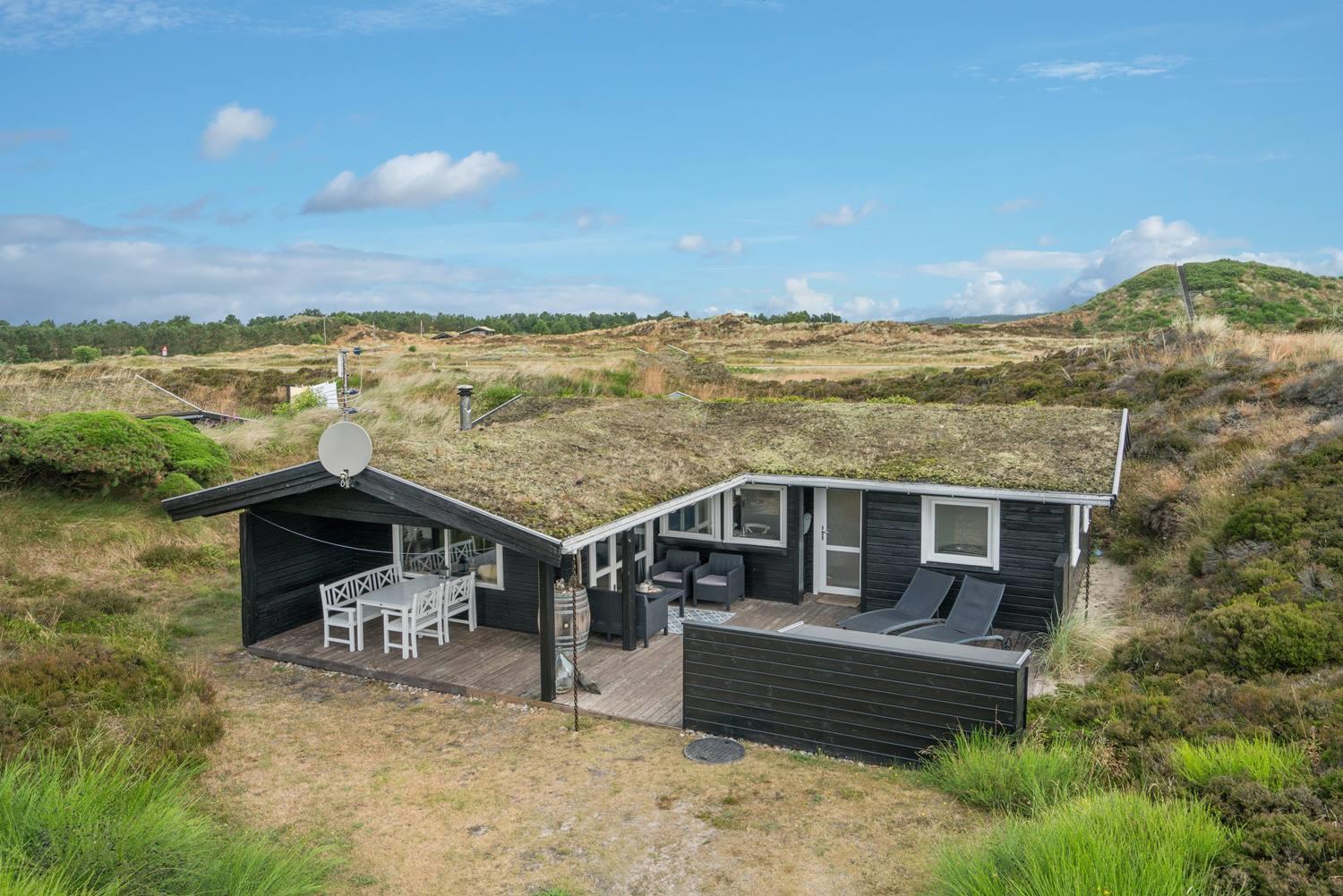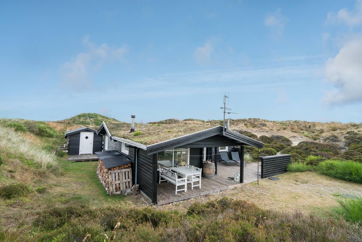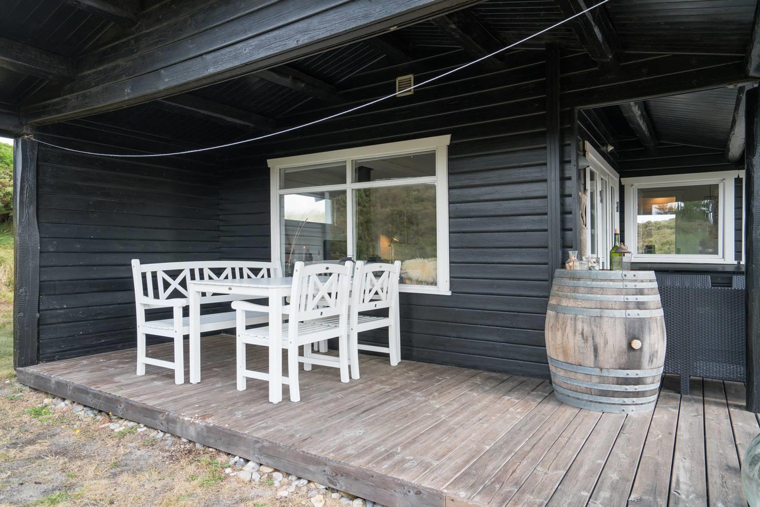 Hyggeligt sommerhus ved Henne Strand med egen terrasse, brændeovn og klitudsigt, perfekt til en afslappende ferie.