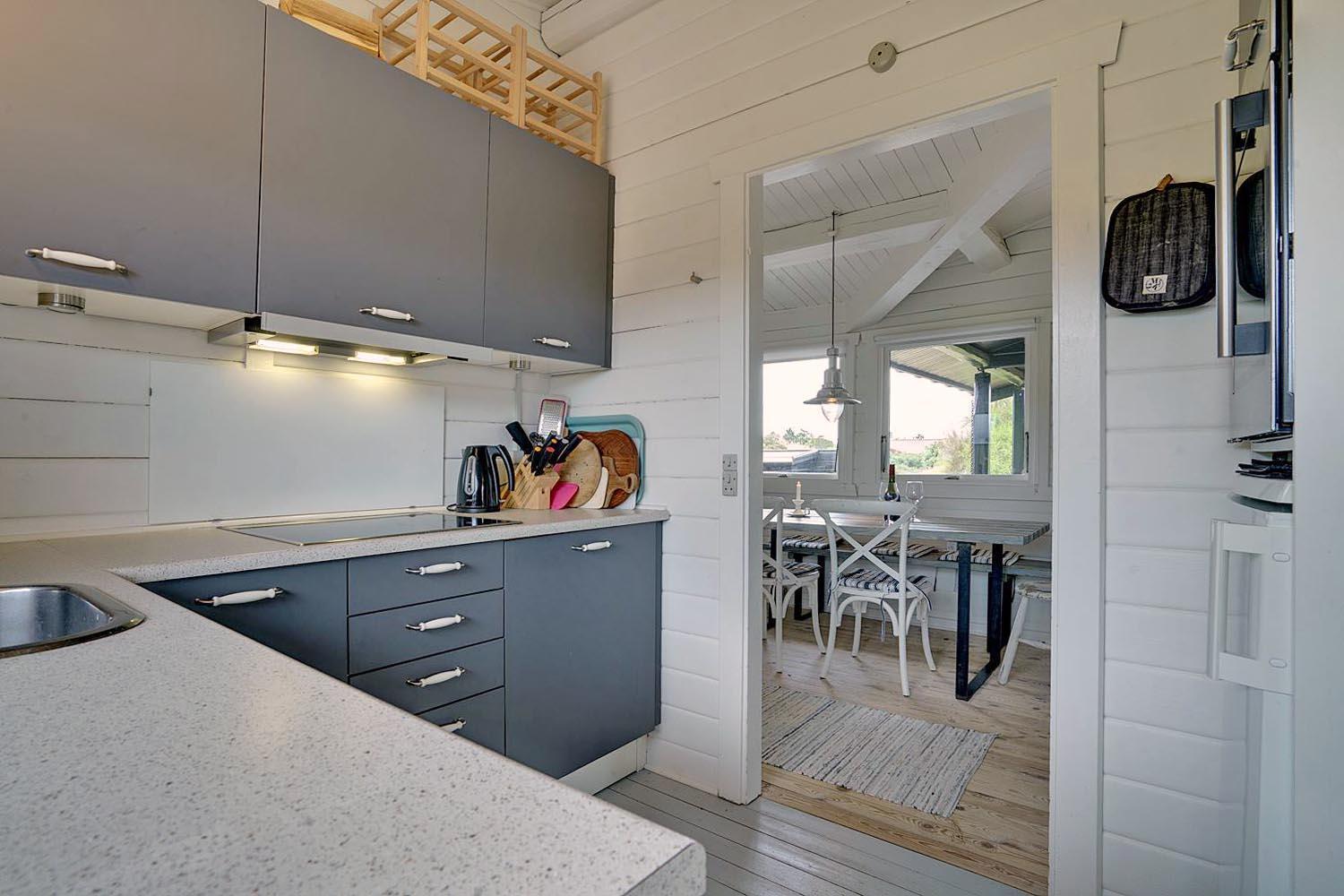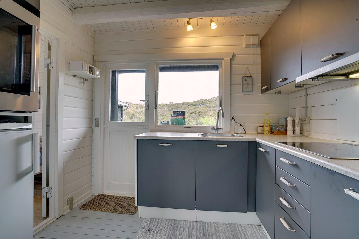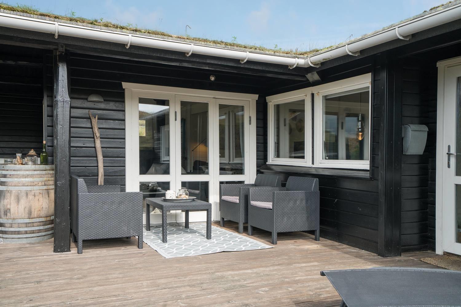 Fra husets køkken er der udgang til en af husets helt ugenerede terrasser foran huset er der både åben og delvis lukket terrasse hvor freden og solen kan nydes i fulde drag. Brændeovnen i stuen sørger for den helt rigtige hygge og feriestemning