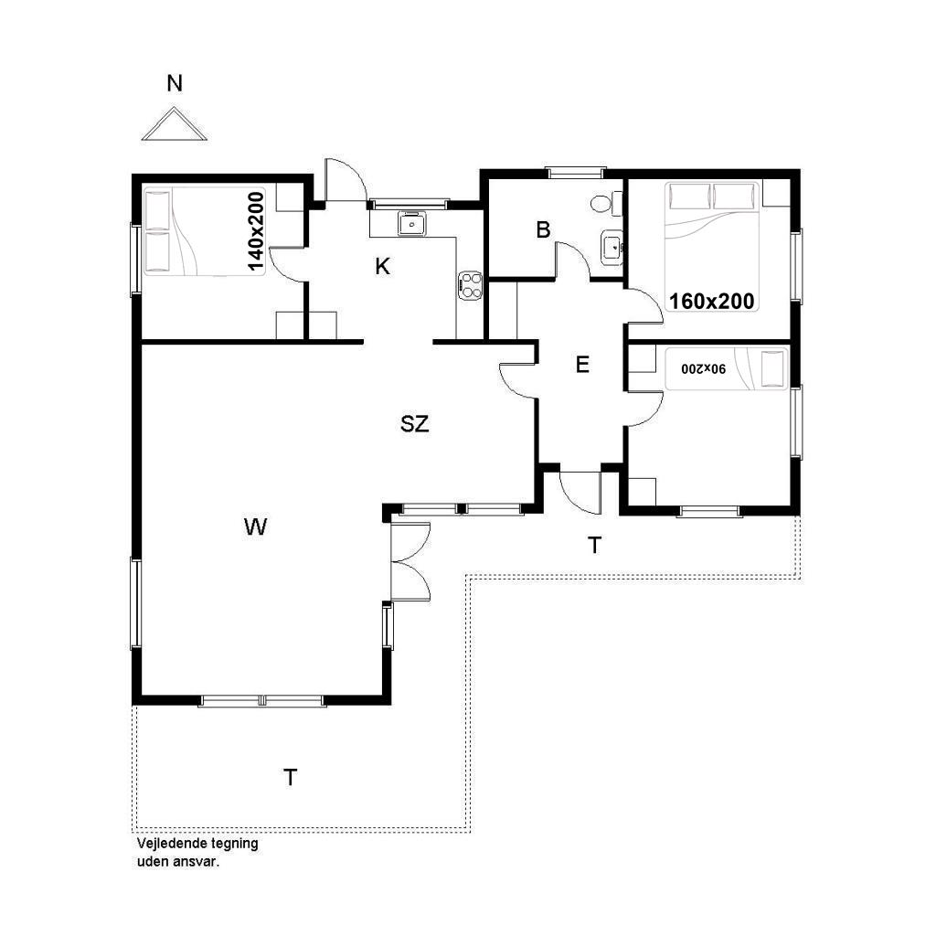 Sengestørrelse: 1 dobbeltseng 160 x 200 cm + 1 dobbeltseng 140 x 200 cm +1 enkeltseng 90 x 200 cm