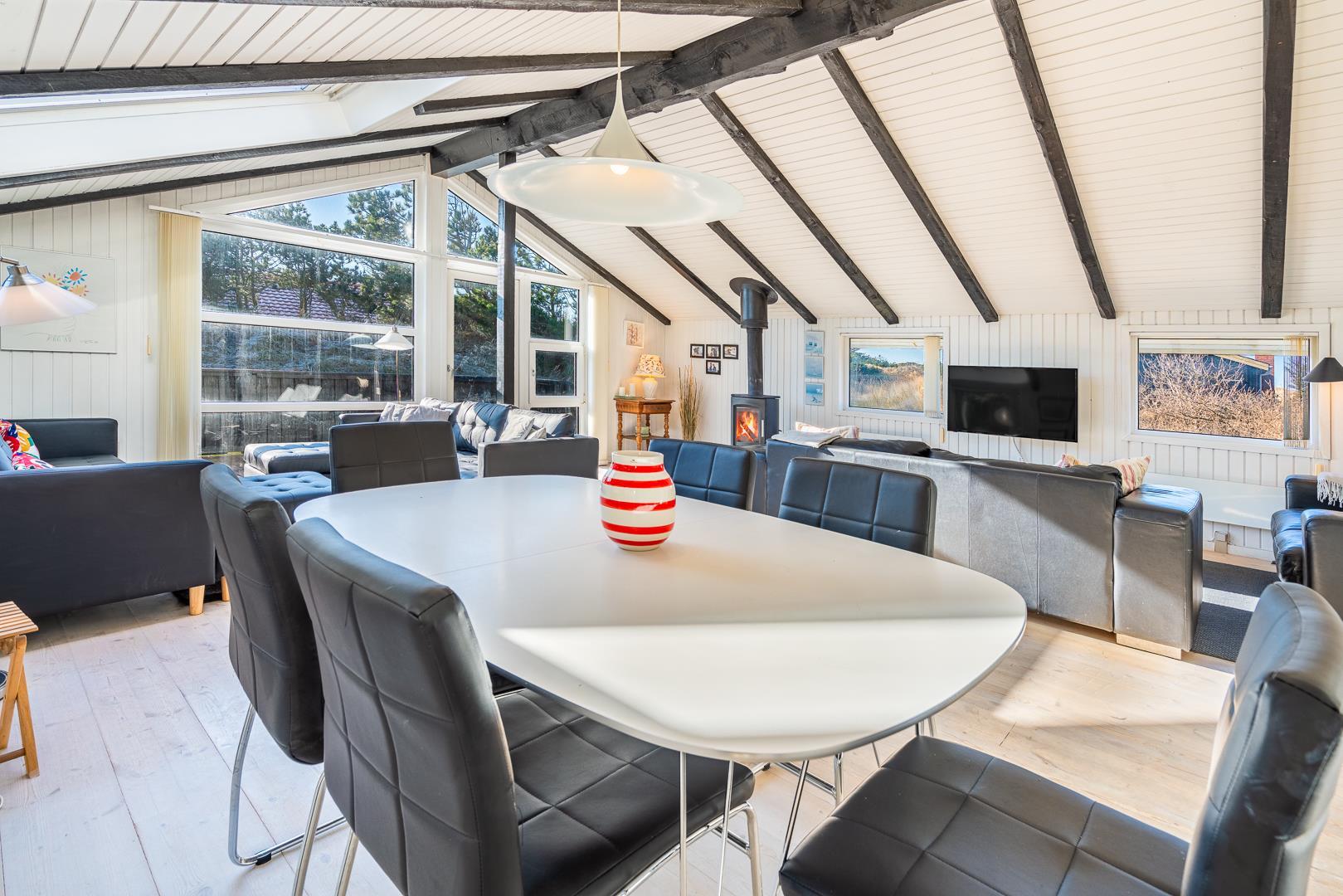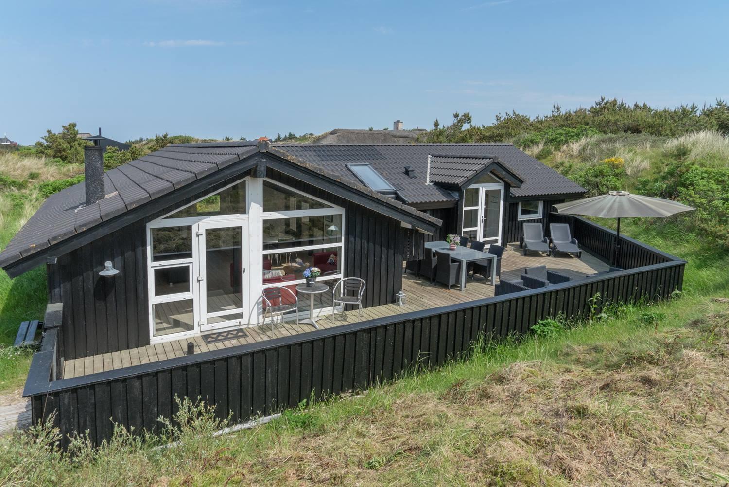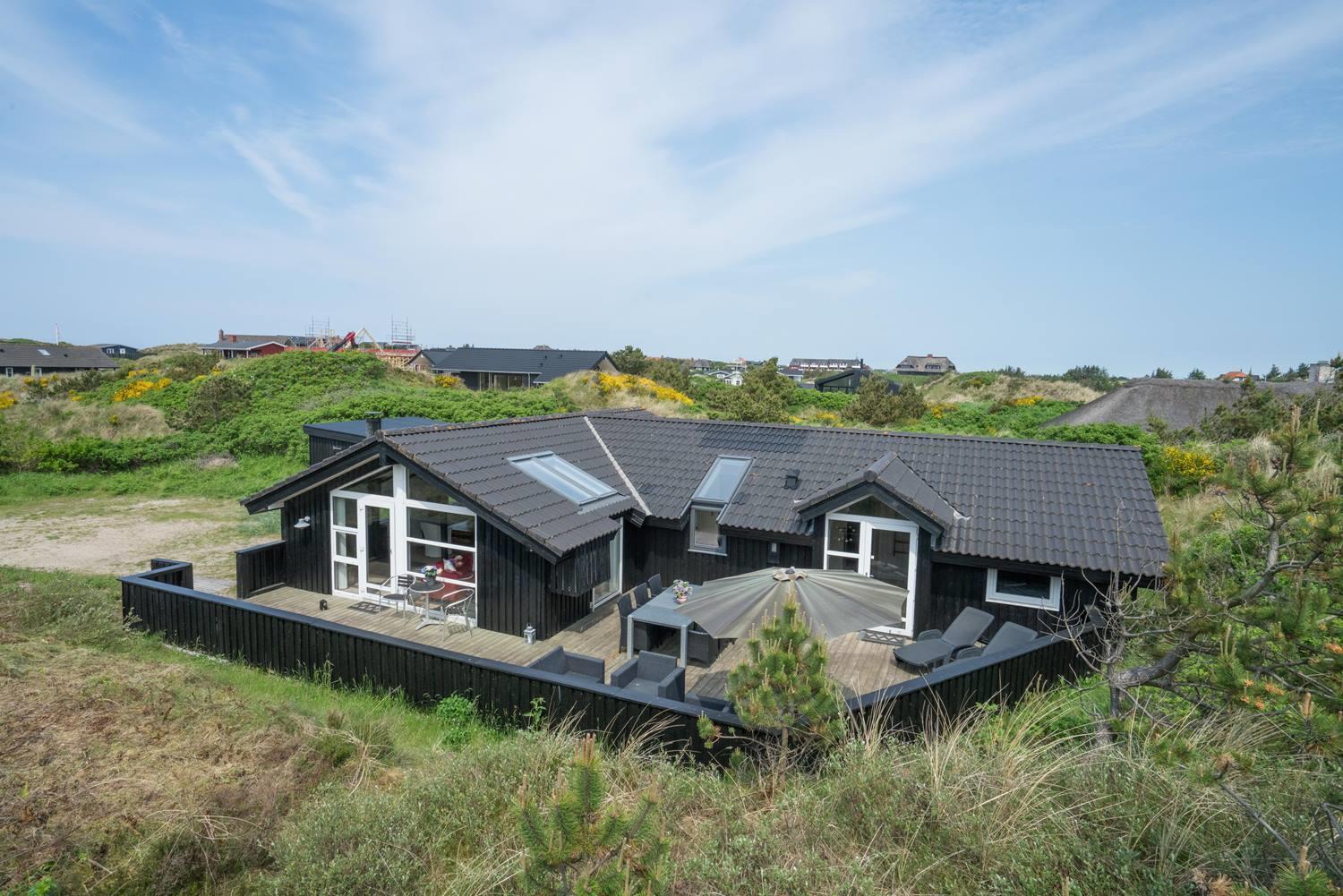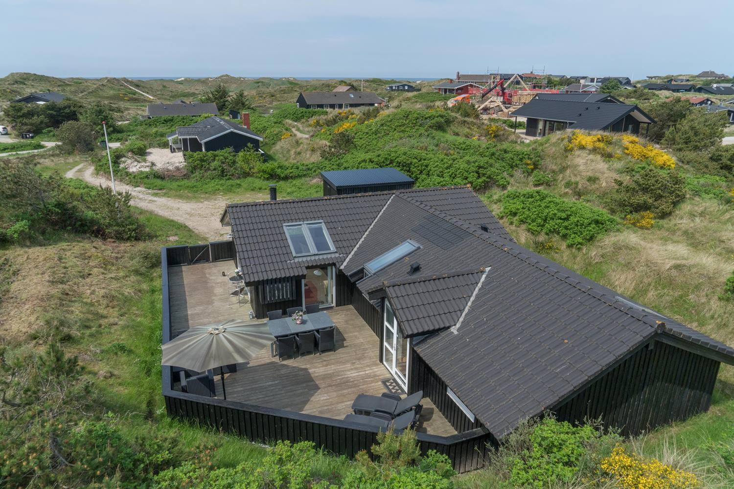 På en pragtfuld højtbeliggende klitgrund tæt ved vandet og for enden af stikvej ligger dette dejlige feriehus. Stor entre hvor man finder husets vaskemaskine og tørretumbler. Huset råder over 2 flotte badeværelse med bruser, i det ene kan en tur i spaen eller saunaen nydes. Husets køkken ligger i åben forbindelse med den rummelige stue, hvor fra der er udgang til ugeneret og indhegnet træ terrasse. Et virkeligt dejligt feriehus til den plads krævende familie. Tag bare din egen PC med da huset råder over gratis internetforbindelse.