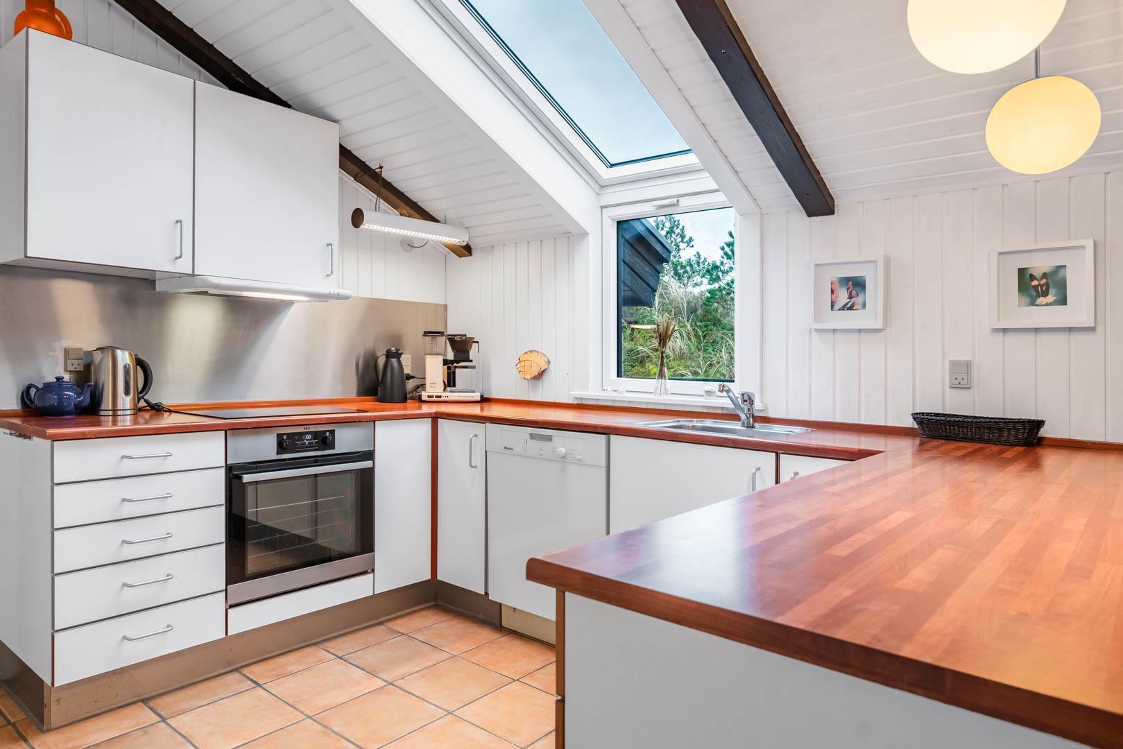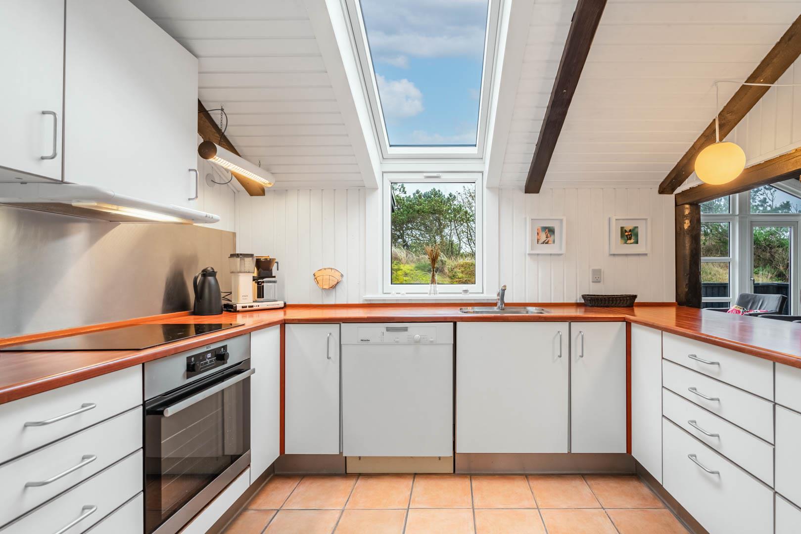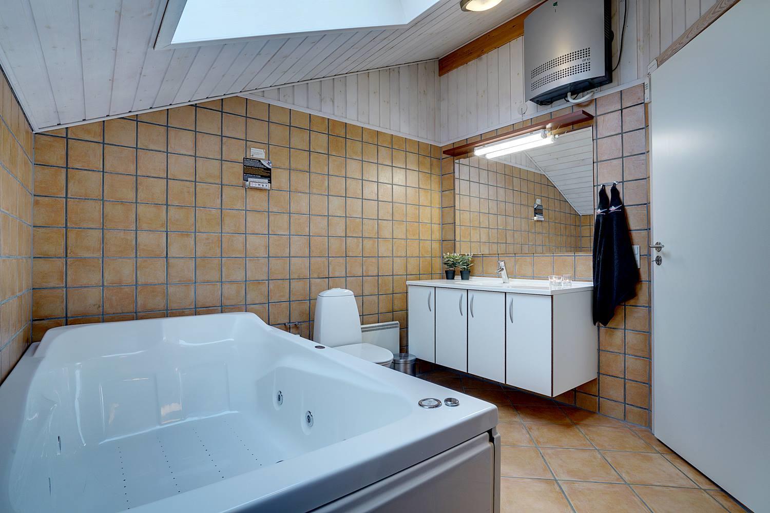 På en pragtfuld højtbeliggende klitgrund tæt ved vandet og for enden af stikvej ligger dette dejlige feriehus. Stor entre hvor man finder husets vaskemaskine og tørretumbler. Huset råder over 2 flotte badeværelse med bruser, i det ene kan en tur i spaen eller saunaen nydes. Husets køkken ligger i åben forbindelse med den rummelige stue, hvor fra der er udgang til ugeneret og indhegnet træ terrasse. Et virkeligt dejligt feriehus til den plads krævende familie. Tag bare din egen PC med da huset råder over gratis internetforbindelse.
