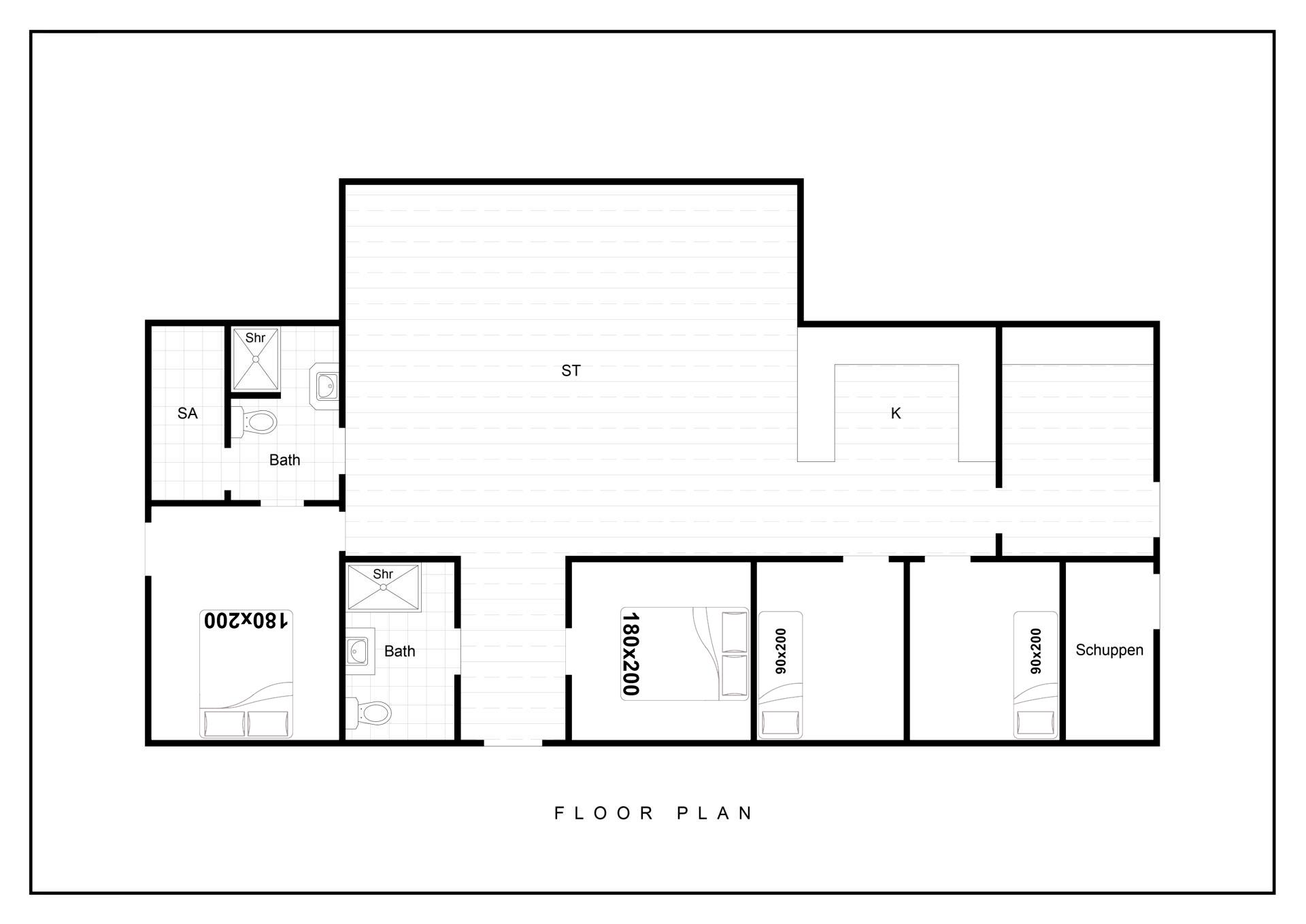 Sengestørrelser: 2 dobbeltsenge 180 x 200 cm + 2 enkeltsenge 90 x 200 cm.