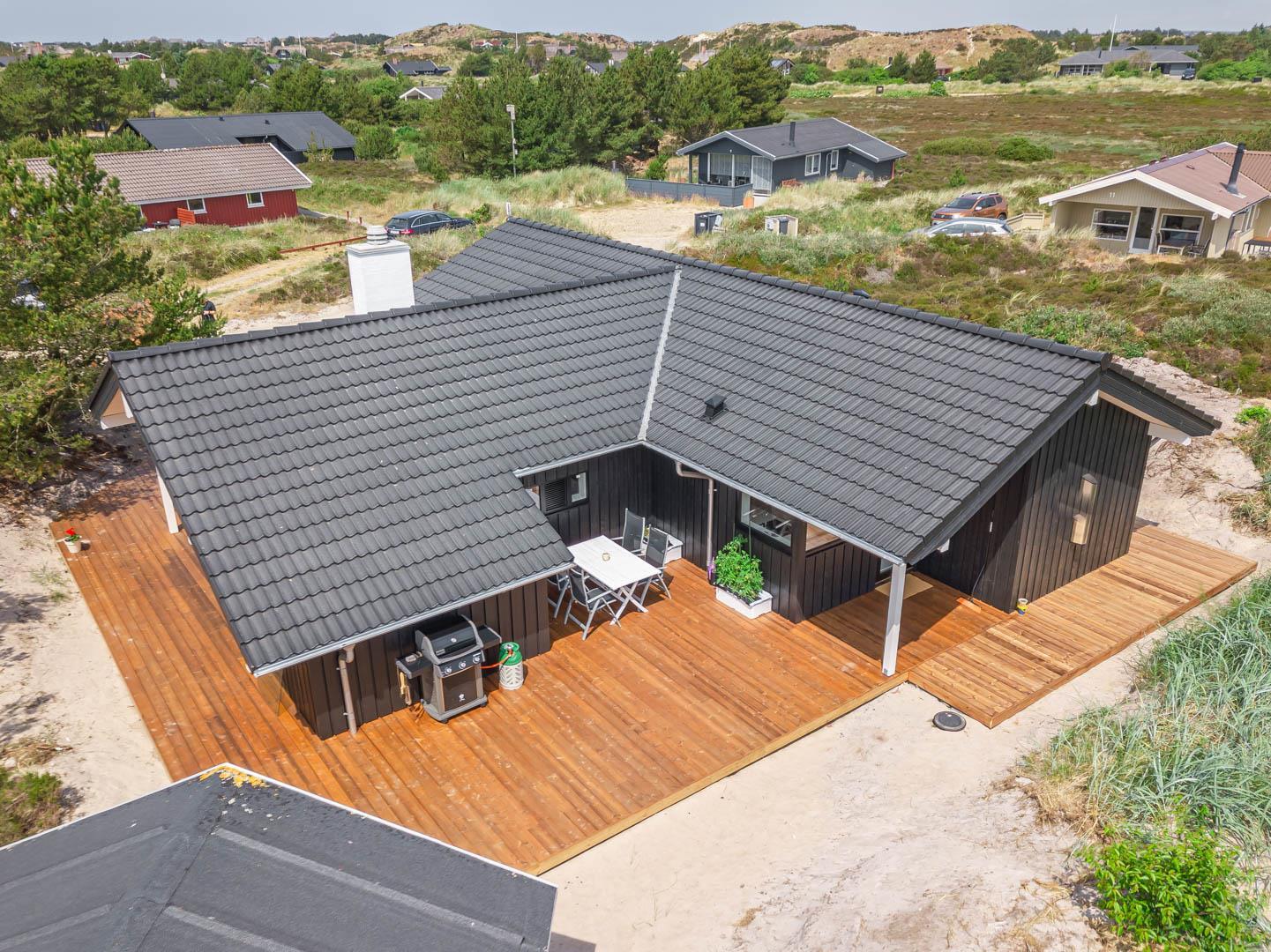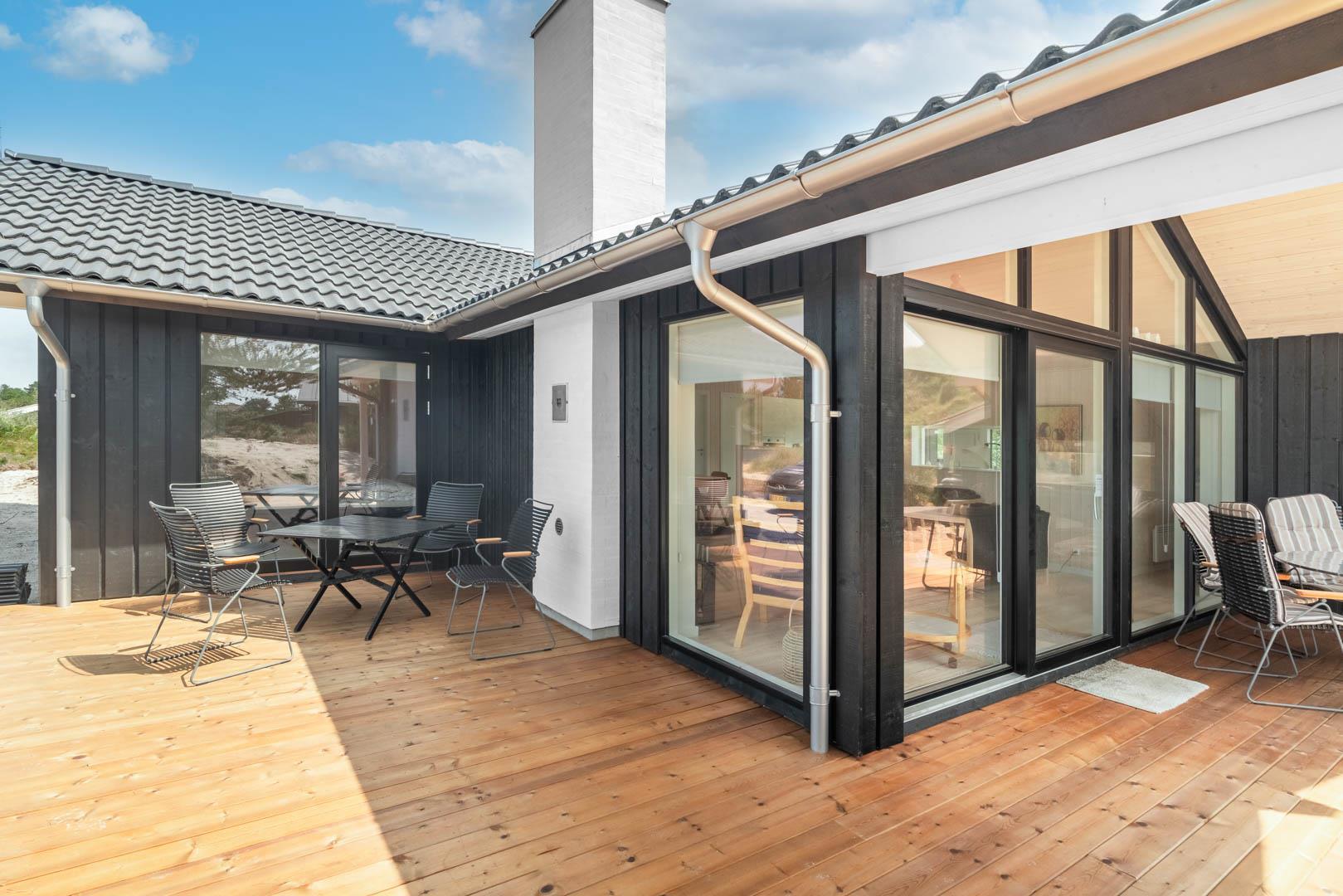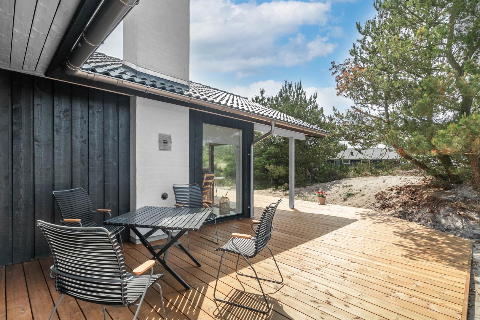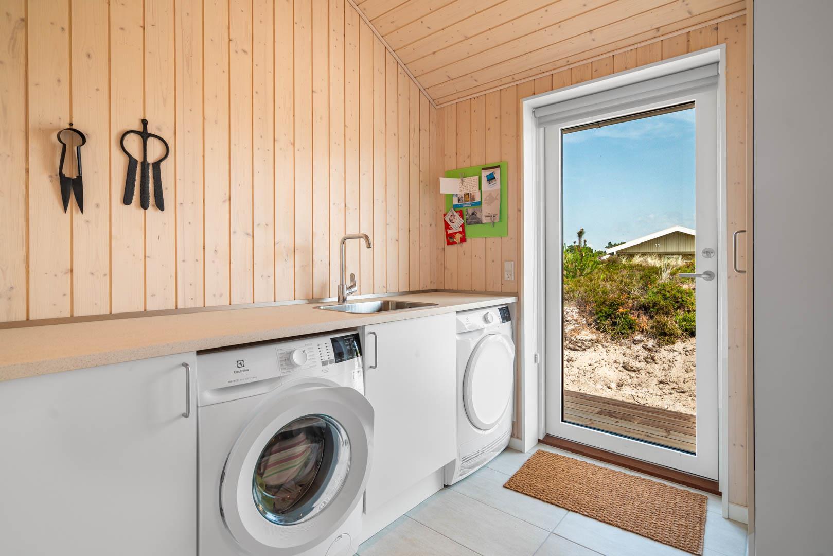 Stor entre med vaskemaskine, tørretumbler og hånd vask. Omkring huset er der opført flere gode og delvis overdækket træterrasser, hvor solen kan nydes i alle døgnets lyse timer.