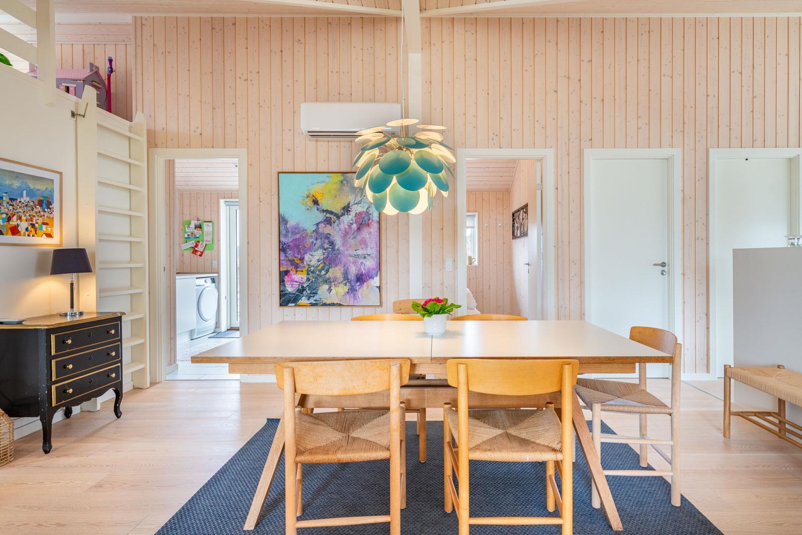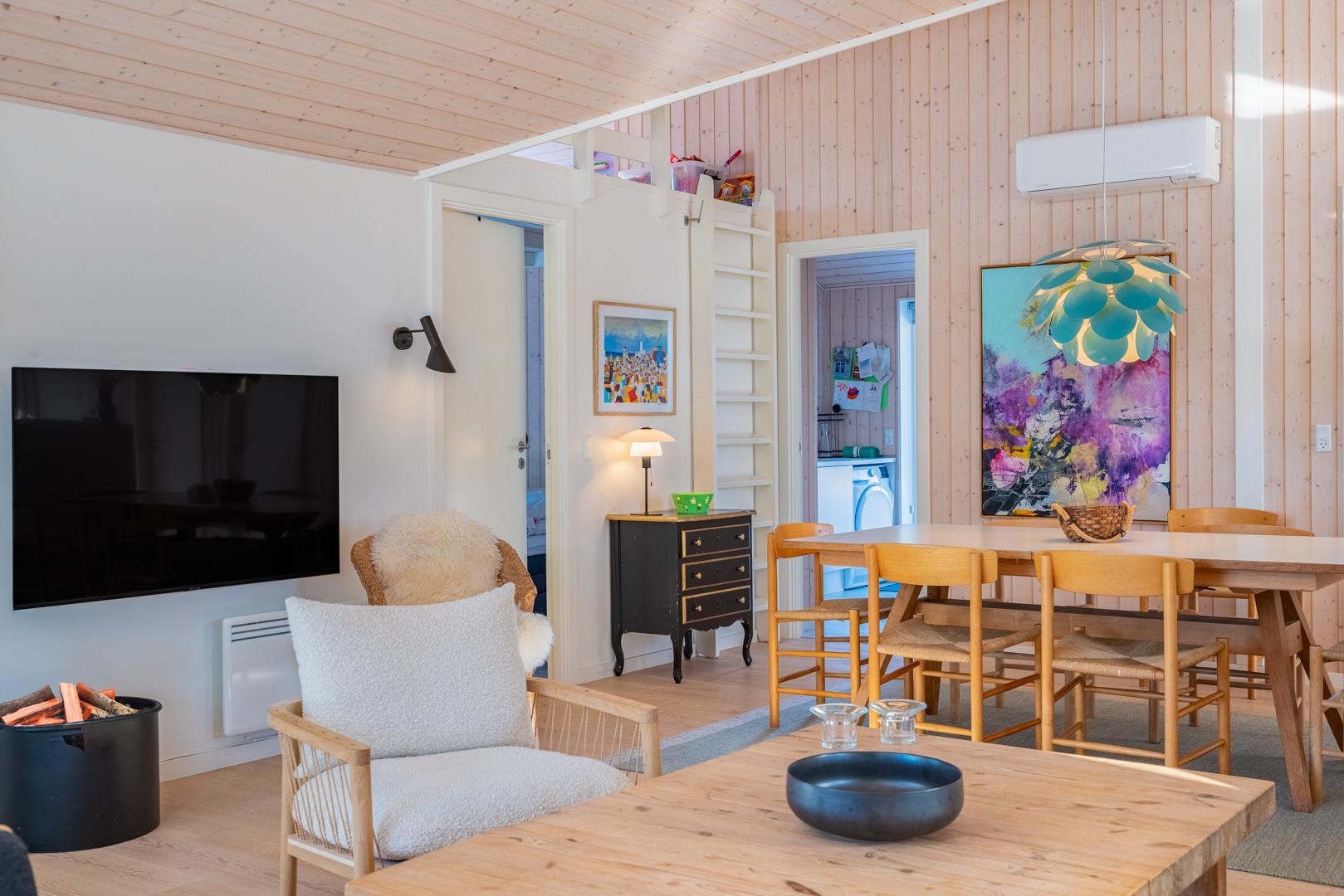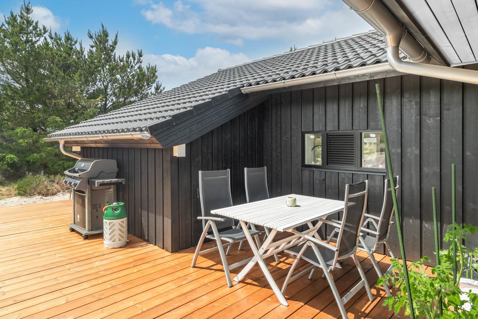 Stor entre med vaskemaskine, tørretumbler og hånd vask. Omkring huset er der opført flere gode og delvis overdækket træterrasser, hvor solen kan nydes i alle døgnets lyse timer.