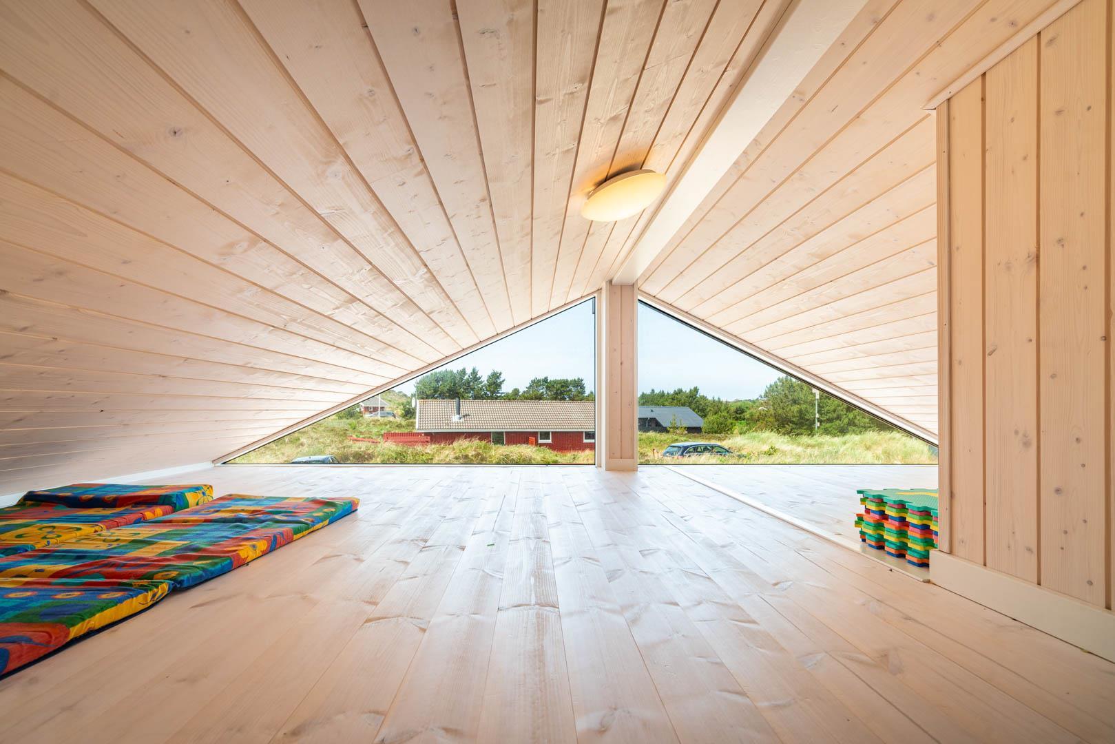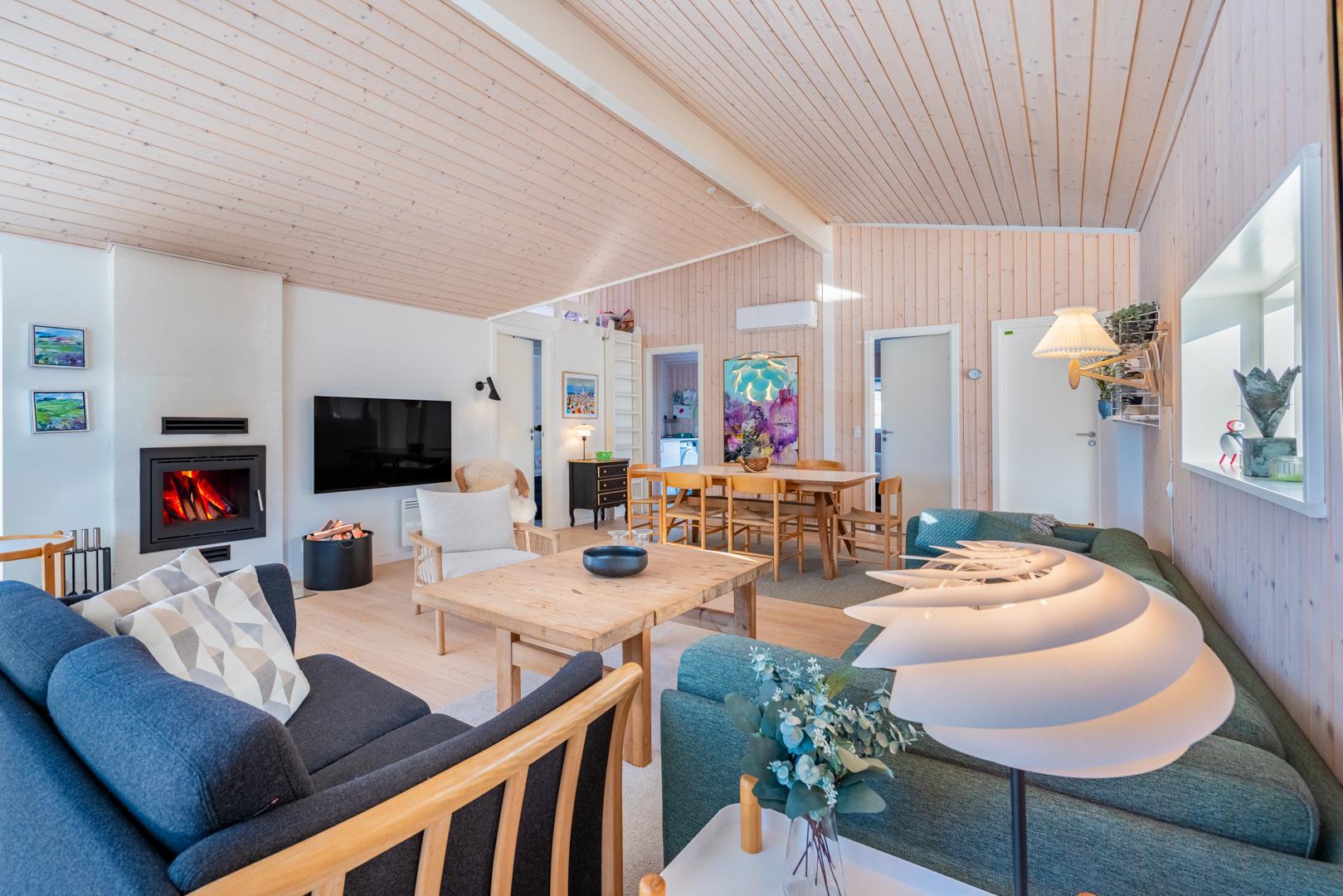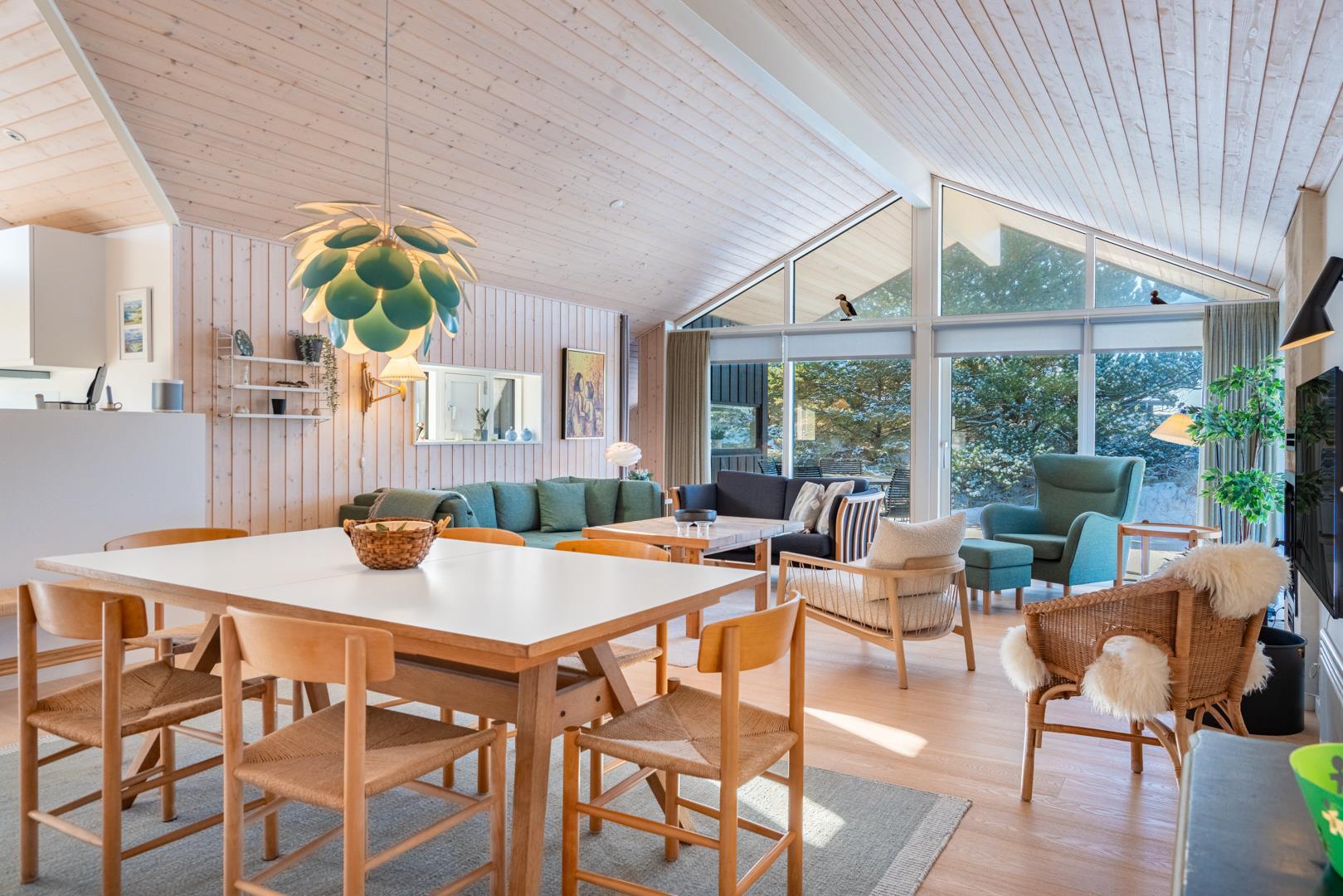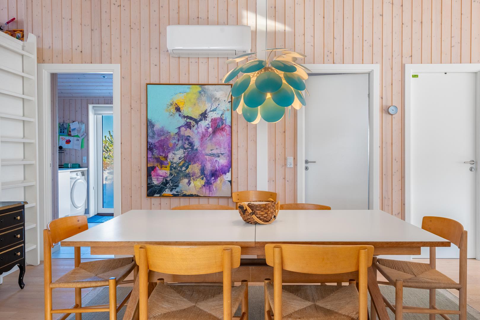 Stor entre med vaskemaskine, tørretumbler og hånd vask. Omkring huset er der opført flere gode og delvis overdækket træterrasser, hvor solen kan nydes i alle døgnets lyse timer.