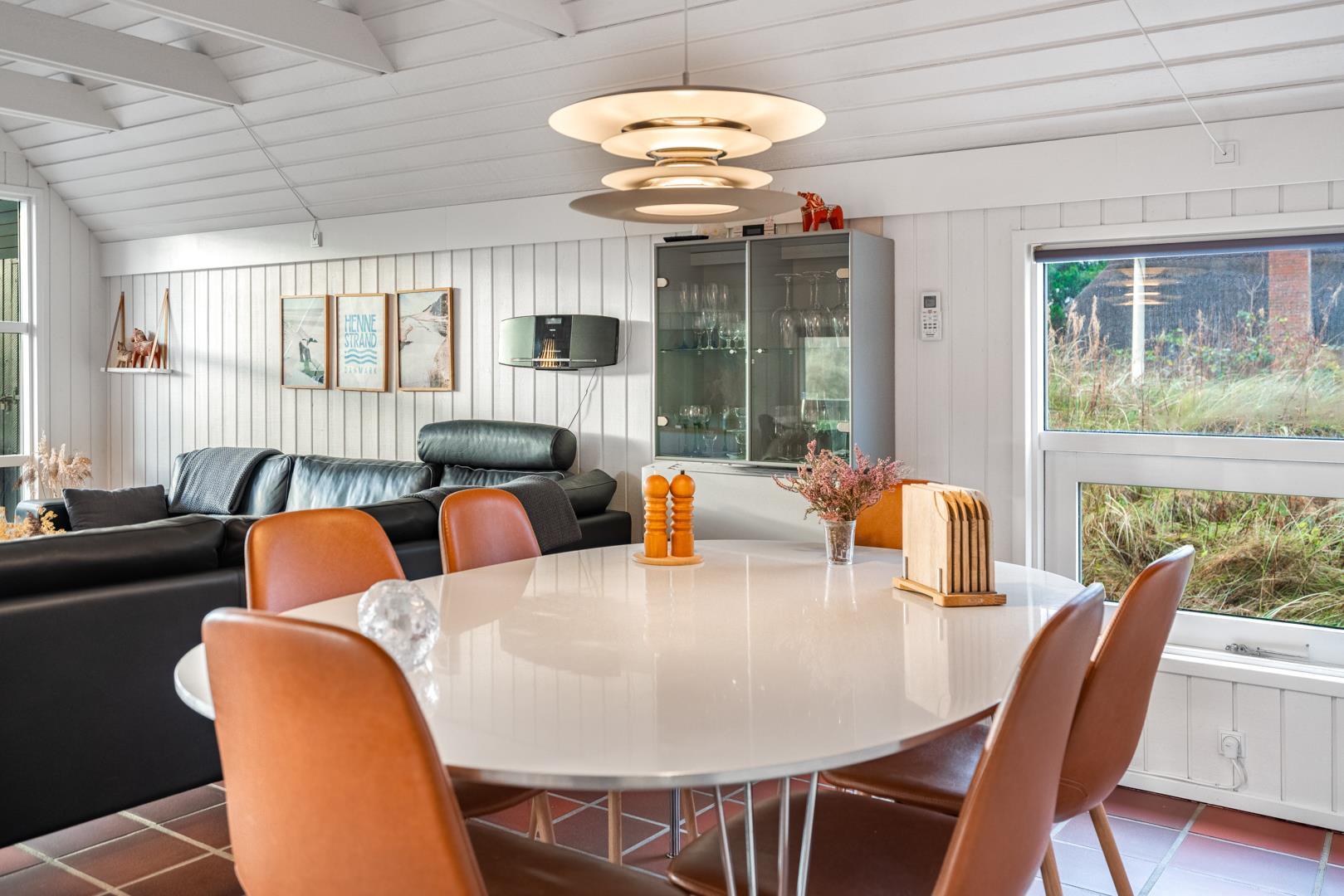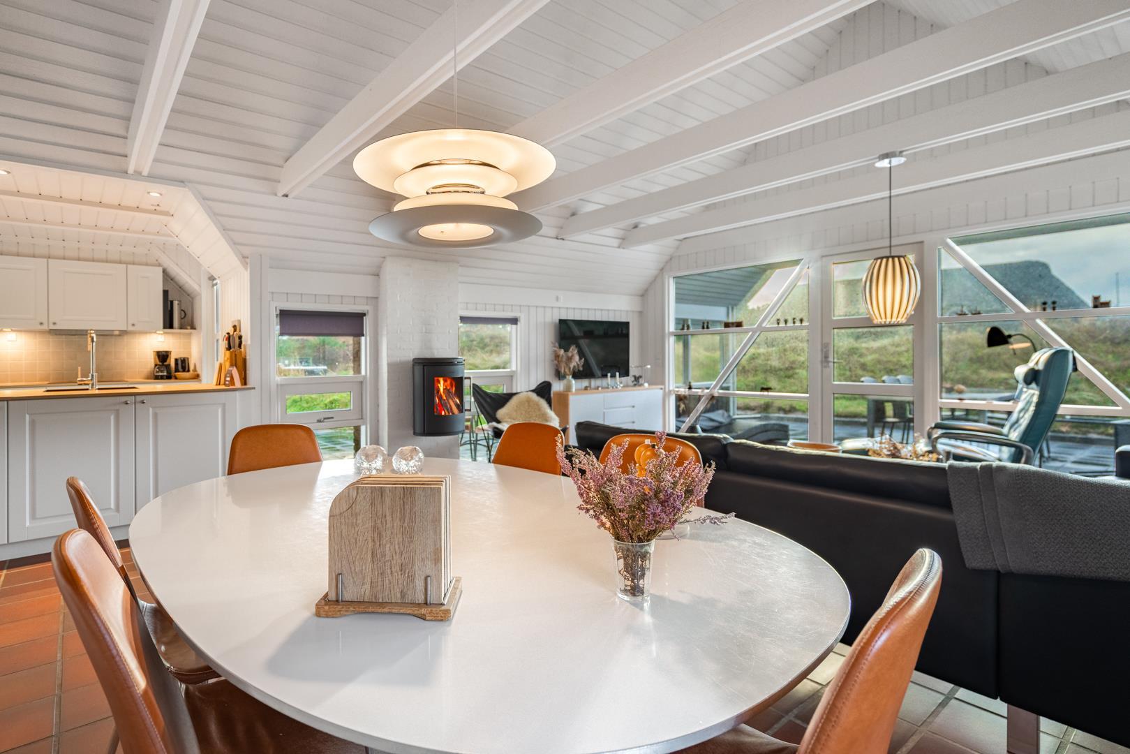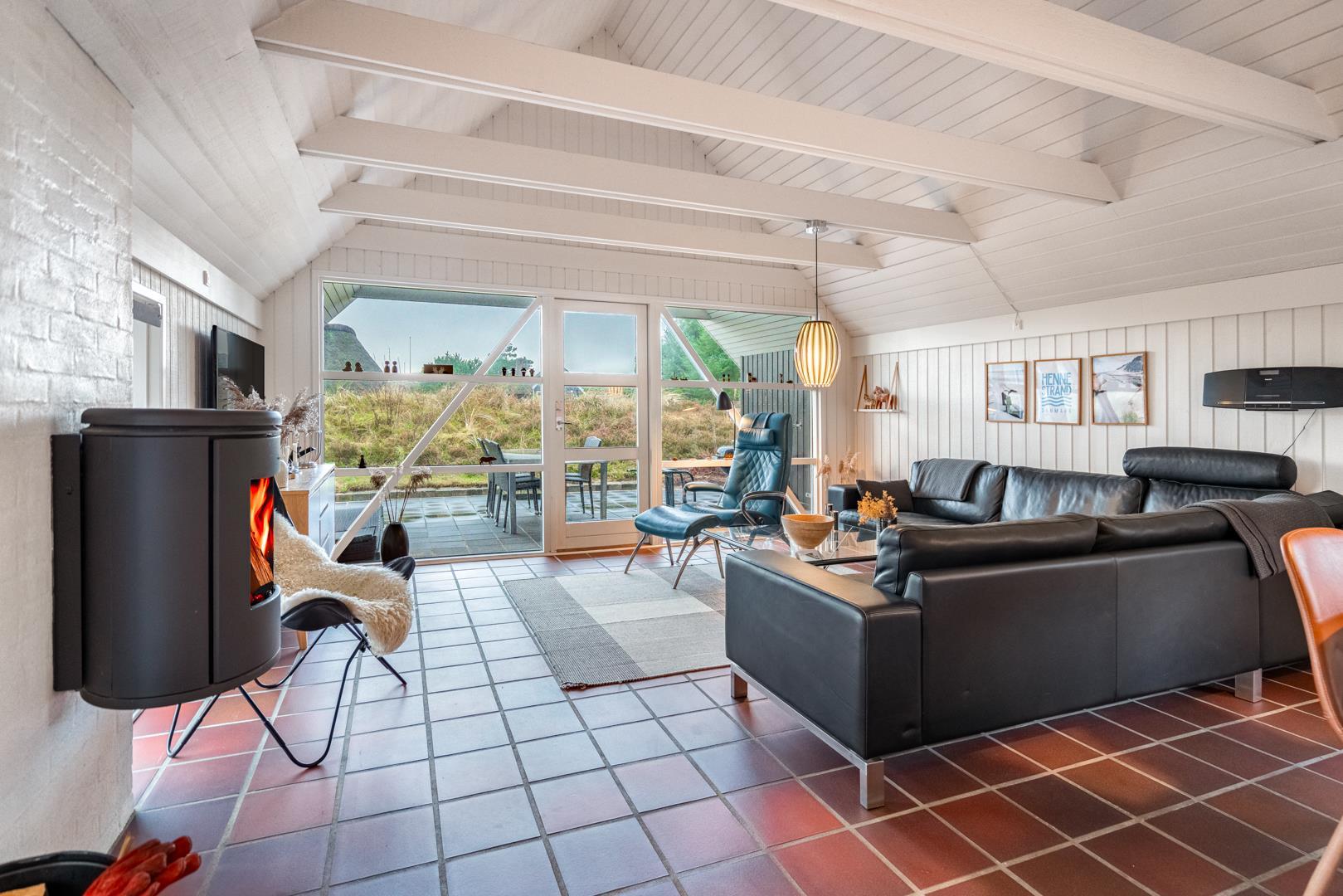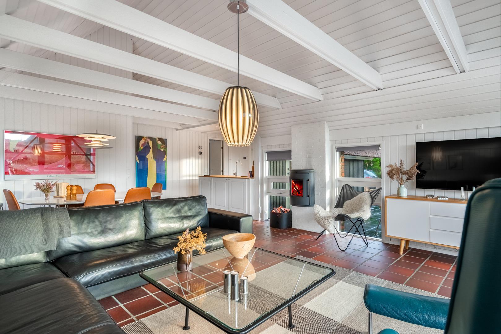 I stuen kan du tænde op i brændeovnen og nyde de hyggelige aftener med spil, bøger eller bare ro og samvær. Herfra er der direkte udgang til en hyggelig, delvist overdækket terrasse – perfekt til solrige dage og rolige aftener med et glas vin i hånden. Liggestolene står klar – det eneste du skal gøre, er at læne dig tilbage og nyde ferien.